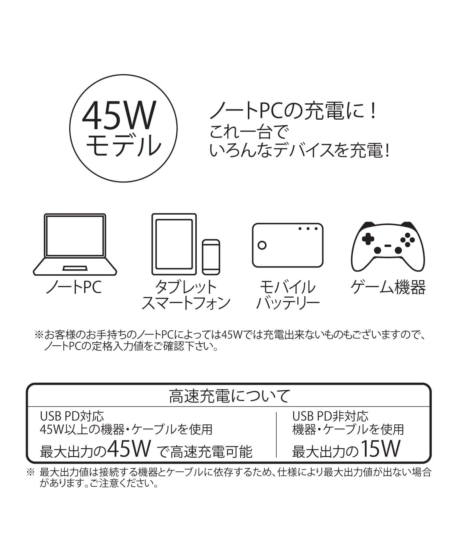 ※高速充電するためには45W以上対応のケーブルを合わせてご使用ください。