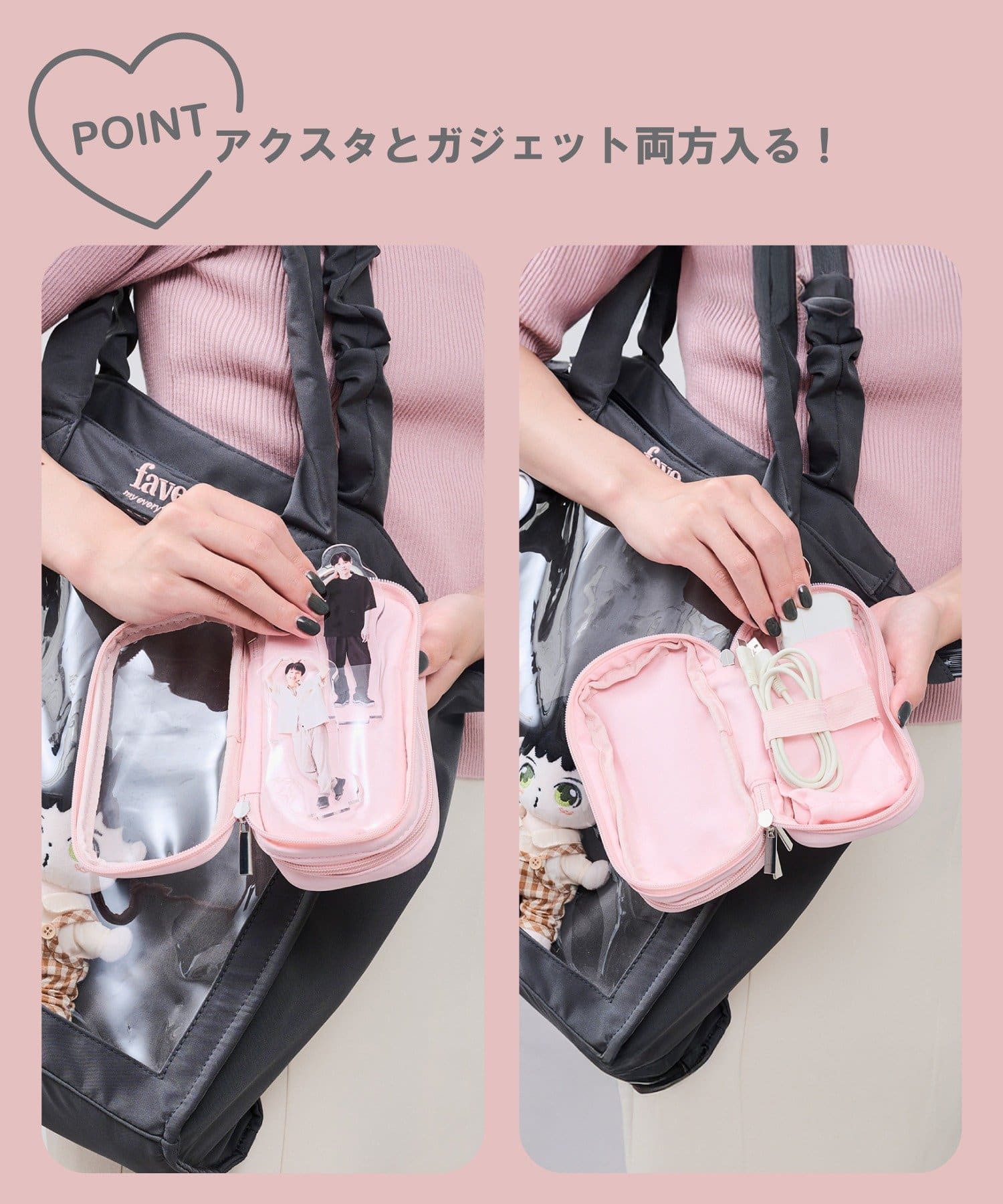 ●アクスタ用と、モバイルバッテリー、充電ケーブル用の両面にポケットが付いたアクスタポーチ!