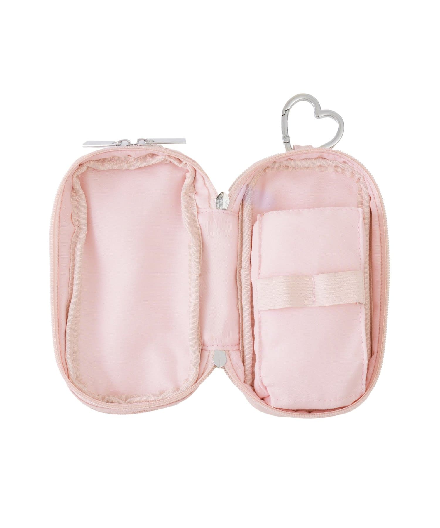 ダブルファスナーでガジェット類を綺麗に収納出来ます。ハートカラビナも可愛いです。