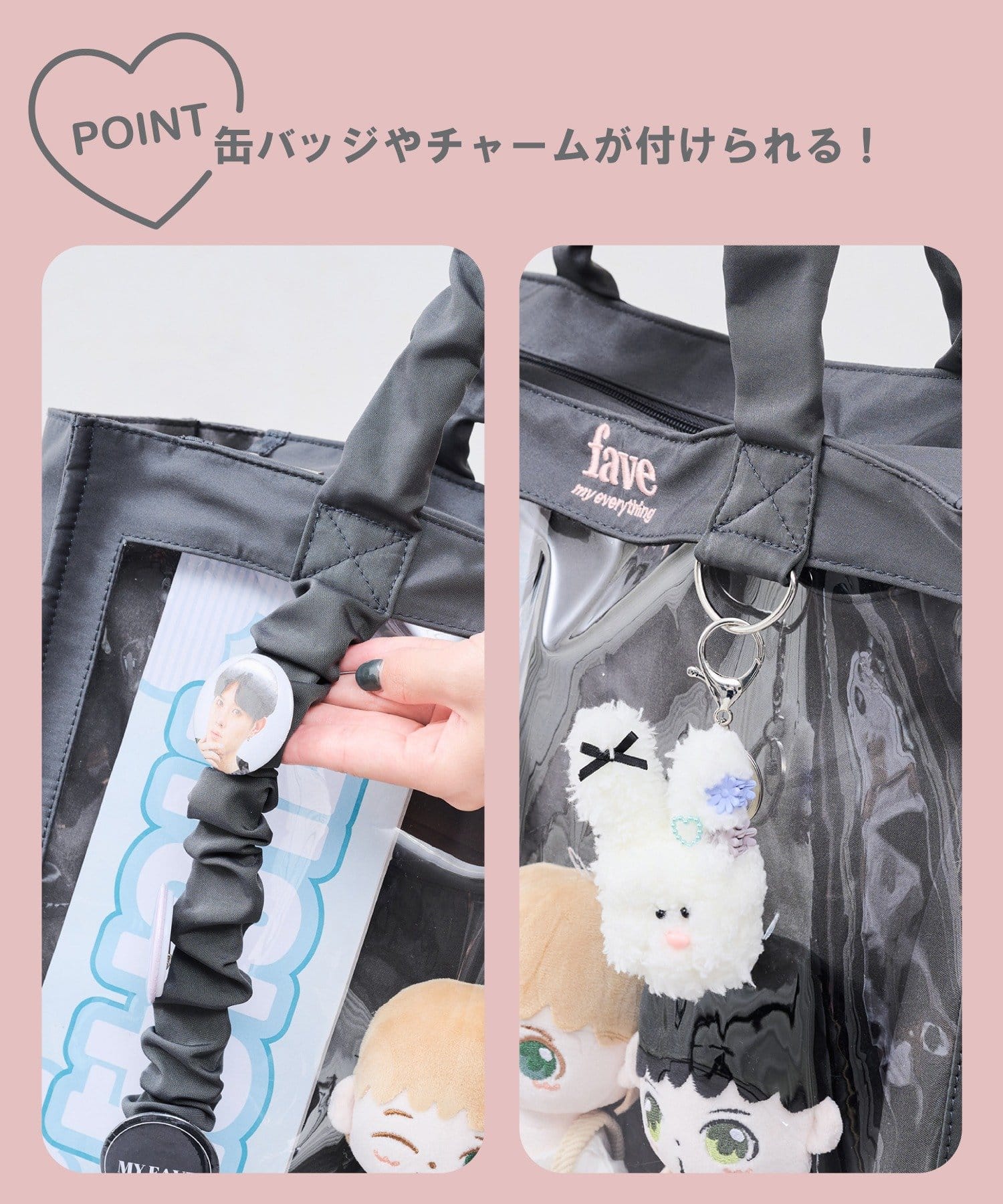 ●透明窓に推しのぬいぐるみやネームボードを入れて、自分だけのオリジナルバッグに!