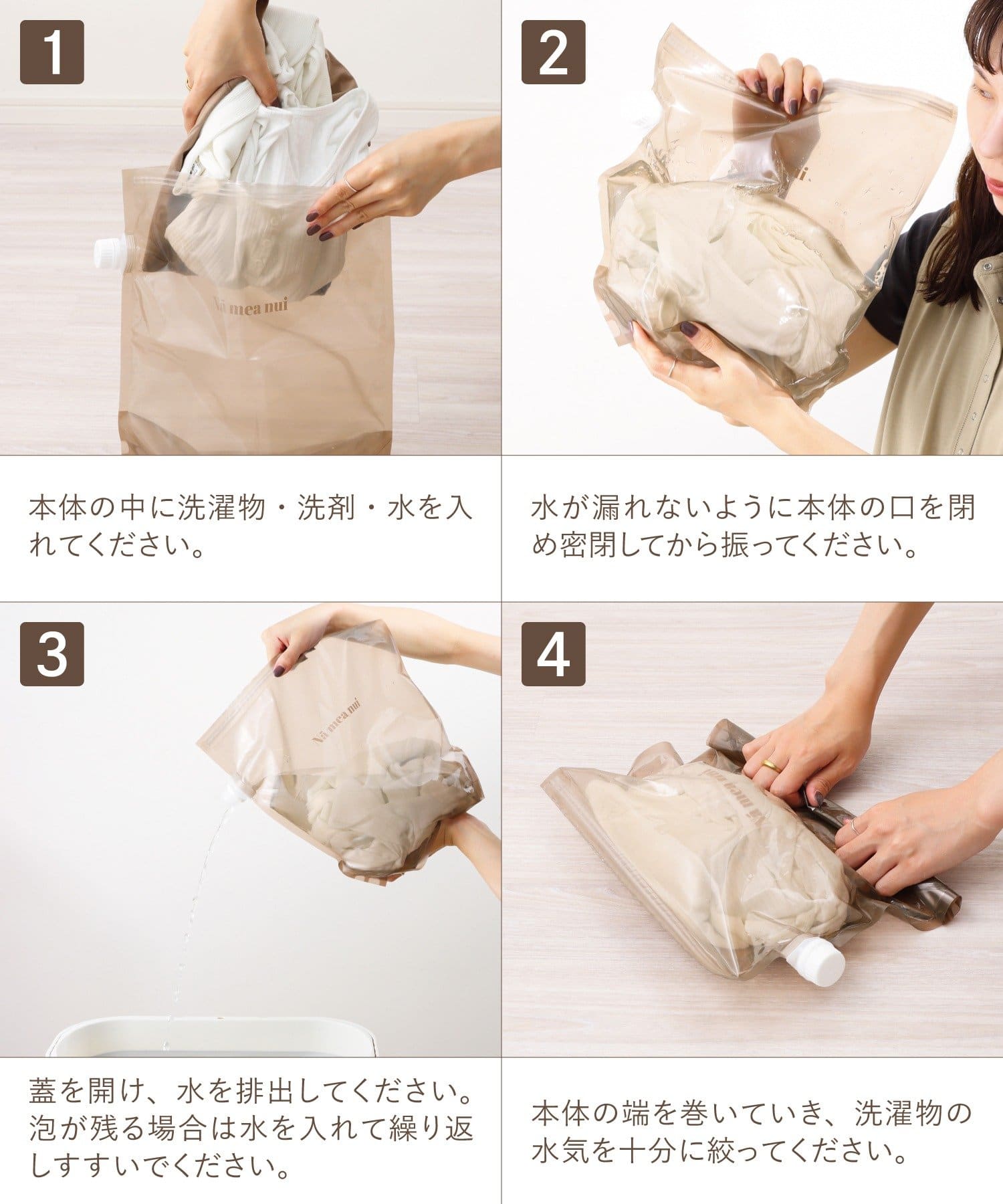 ●水と洗剤、衣類を入れて振るだけ。排水やすすぎも簡単で使い方もシンプルです。