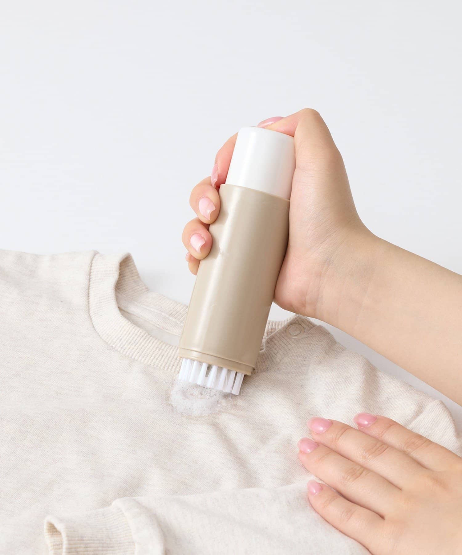 購入場所:パルクローゼット中の筒に洗剤を入れてプッシュ式で泡を出して使う方式でした。ロック機能もあるので漏れにくい仕様になっていました。思っていたよりブラシ部分は硬めでした。食べこぼしやお化粧がついてしまった時など直後に使用すれば、よく汚れが落ちるので活躍しています。