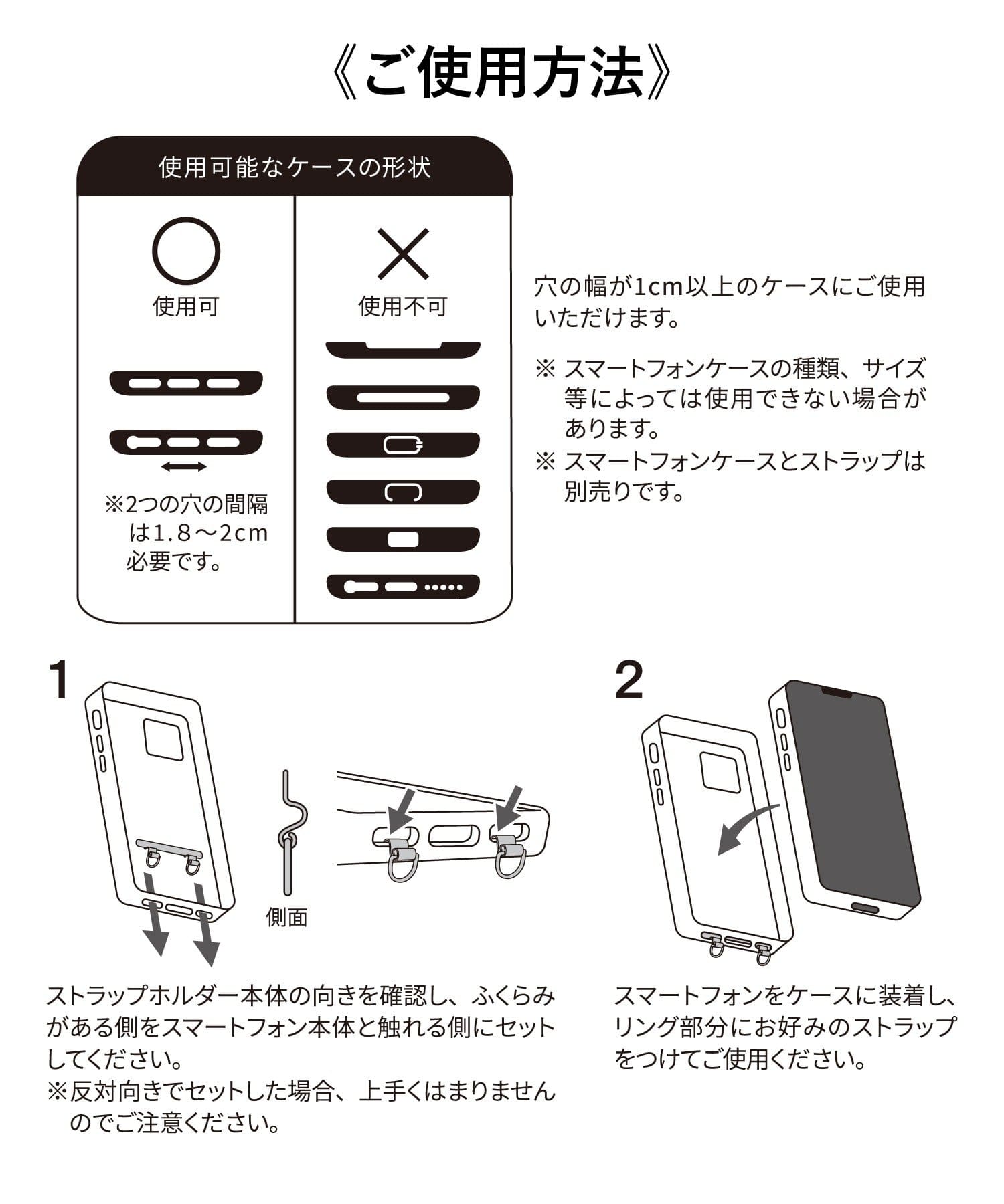 ●スマホとケースの間に挟むだけで、スマホストラップやキーホルダーを手軽に付けられます。