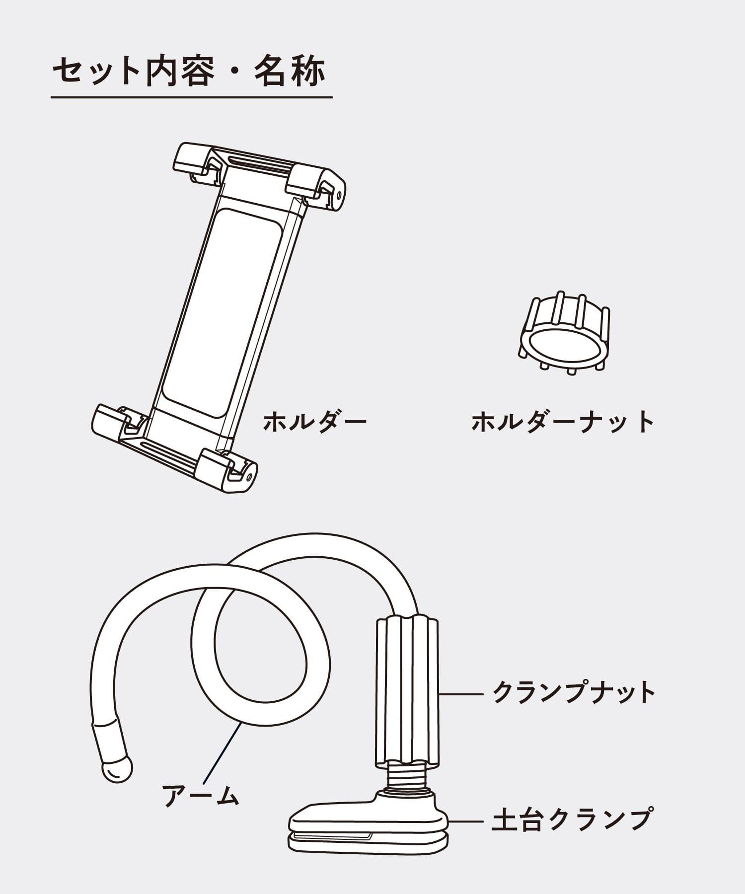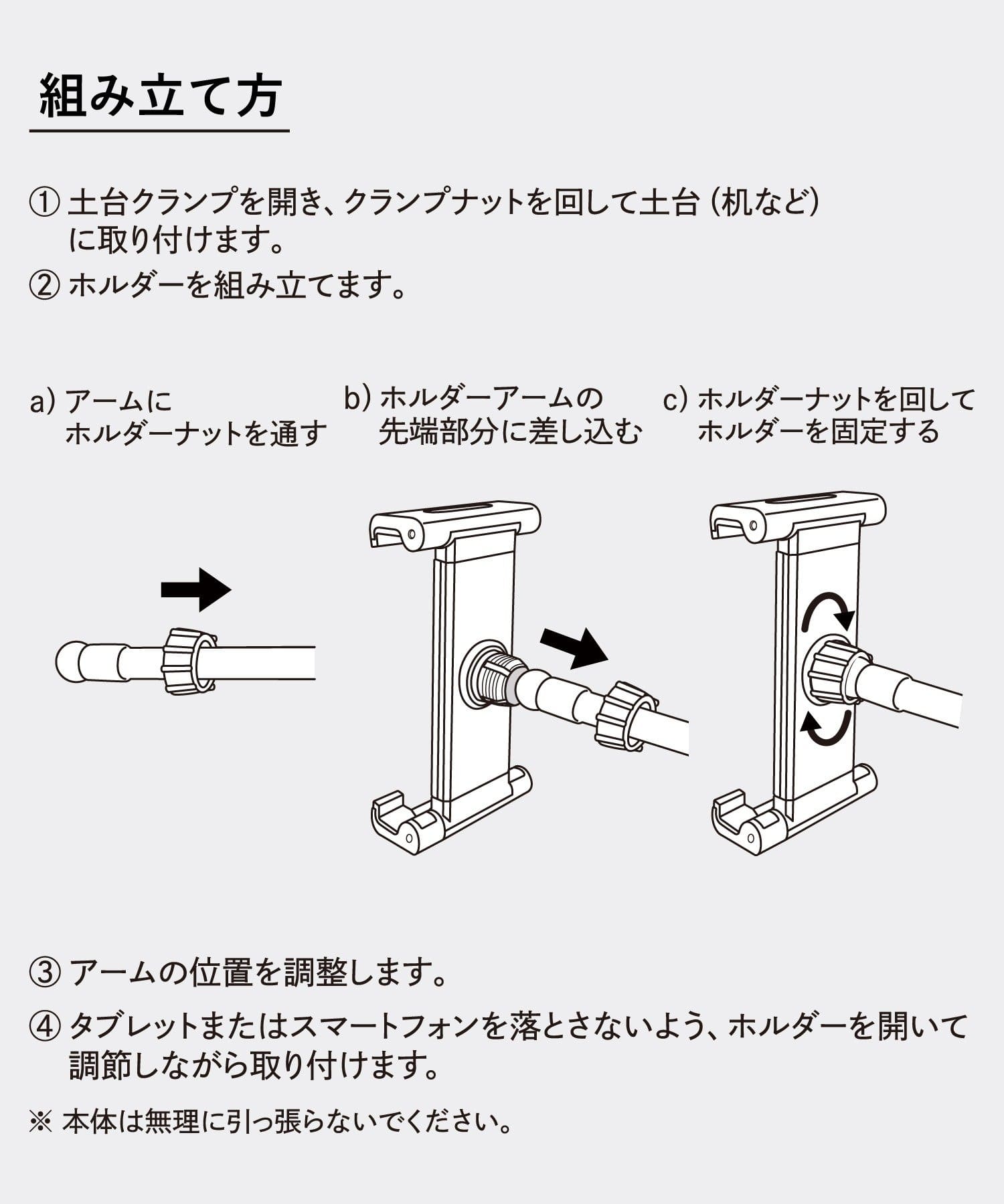 ※【土台クランプ】は土台(机など)、タブレット・スマートフォンは【ホルダー】に、それぞれしっかりと固定されているか確認してください。
