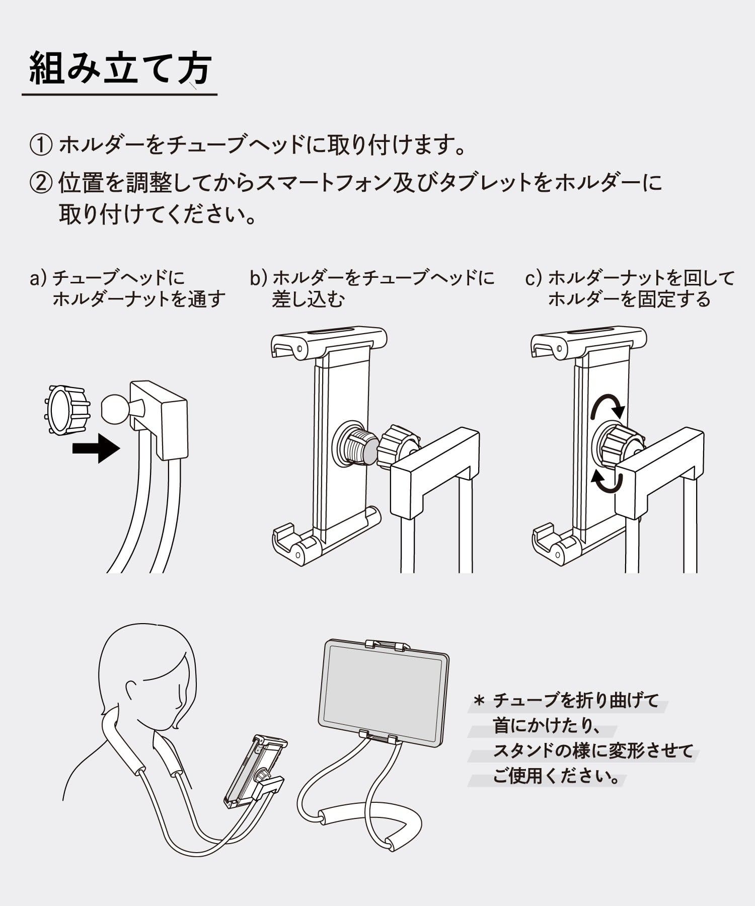 ※顔面に落下する恐れがありますので、スマートフォン及びタブレットの液晶面を顔面上に設置しないでください。