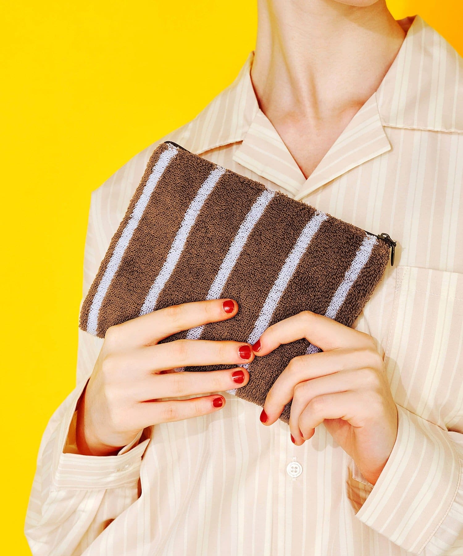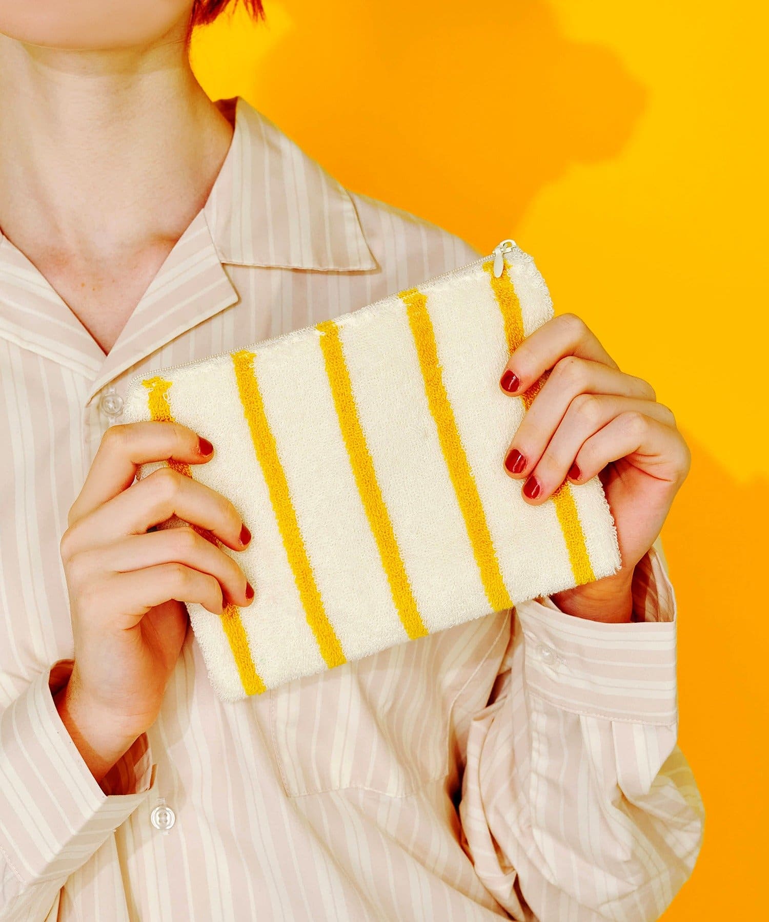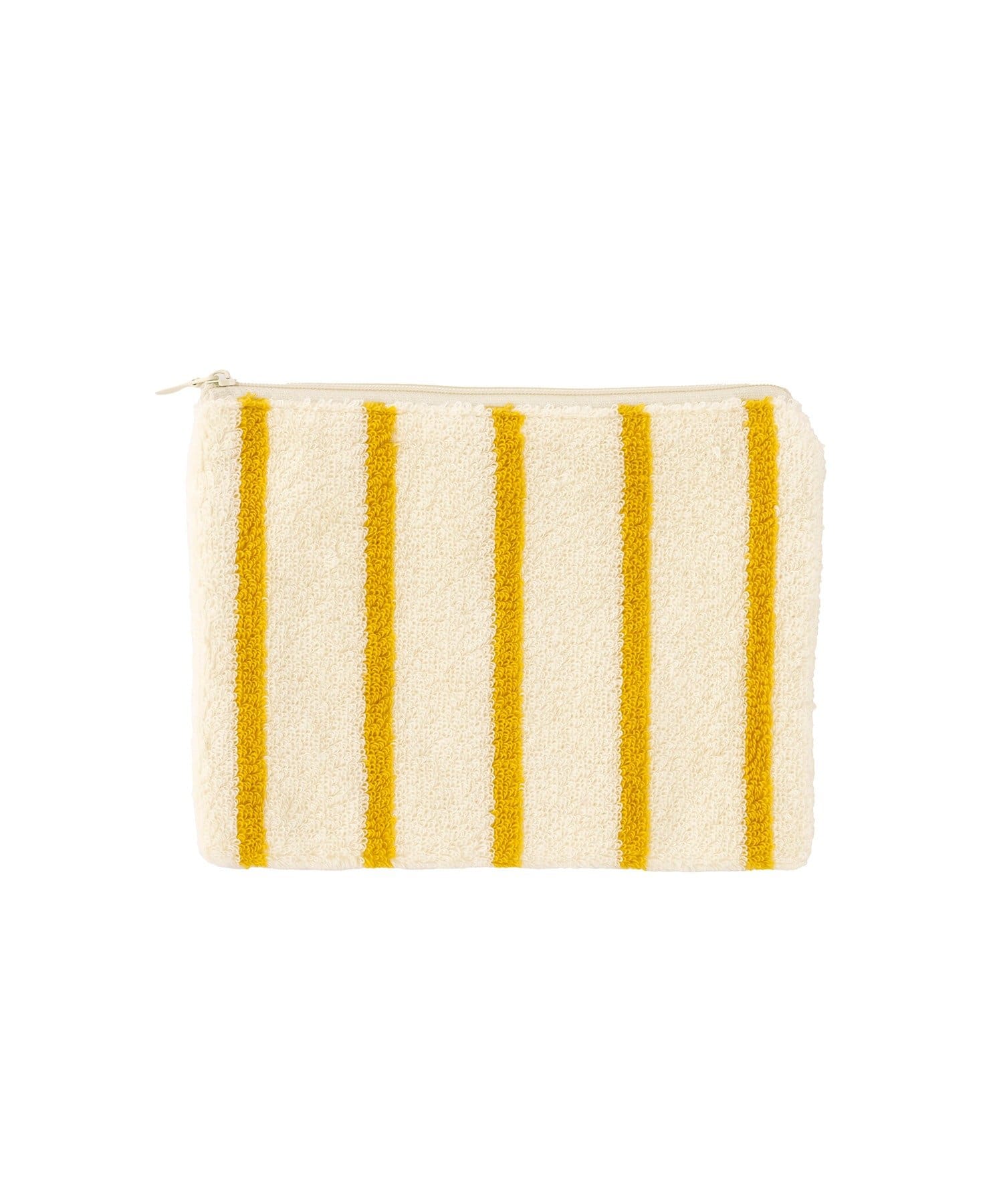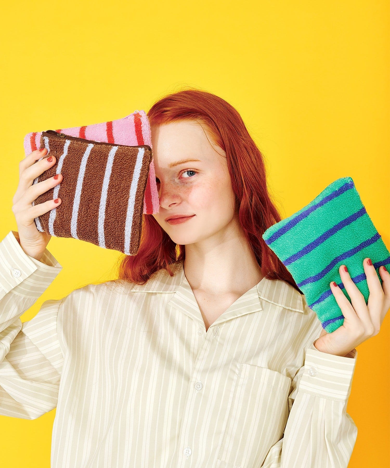 ●ふんわりタオル地にカラフルな縞模様が施されたポーチ。