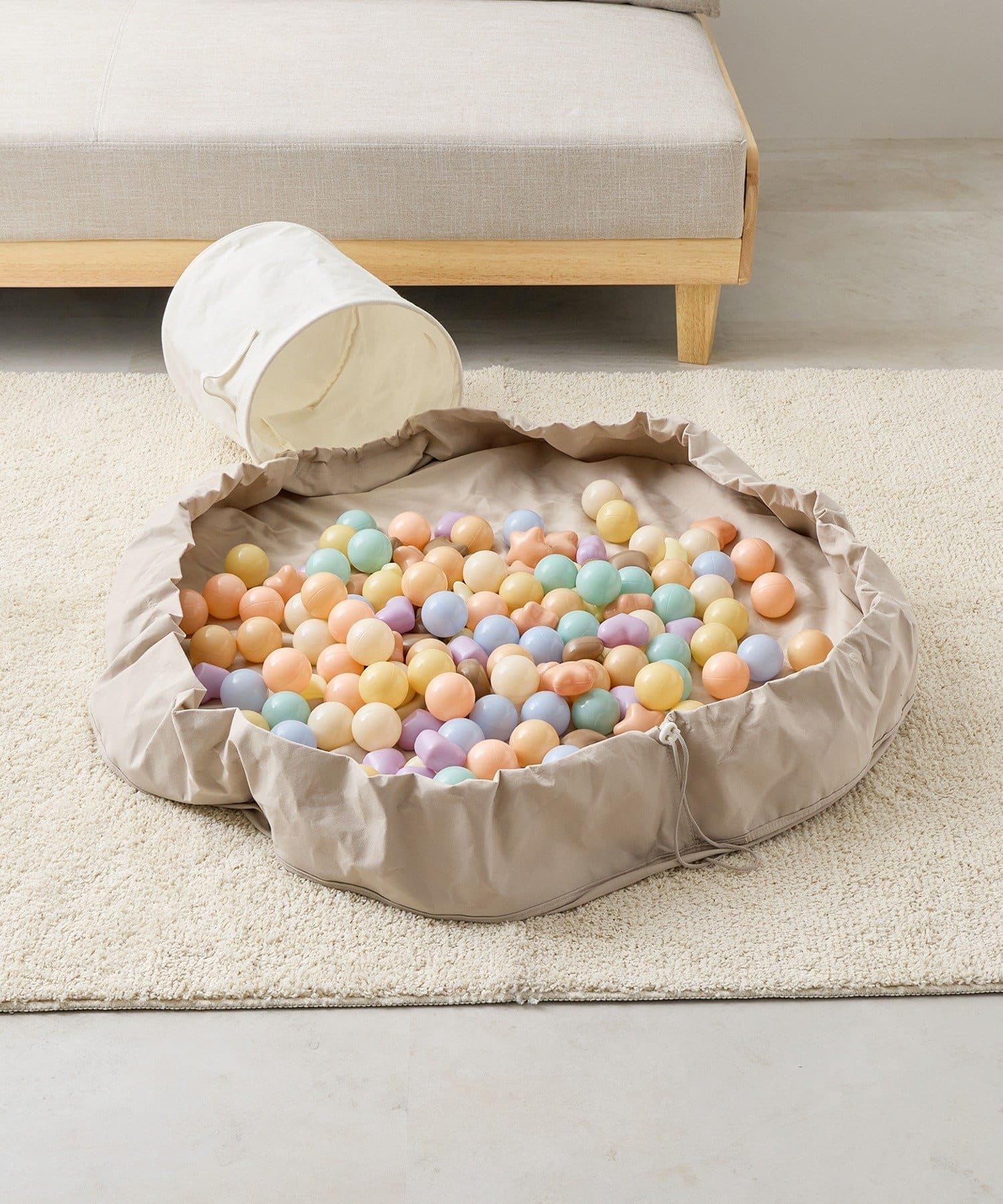 我が家はボールを入れすぎているのでマットを絞ってまとめているのみで、ケースは別のおもちゃ入れとして使っています。