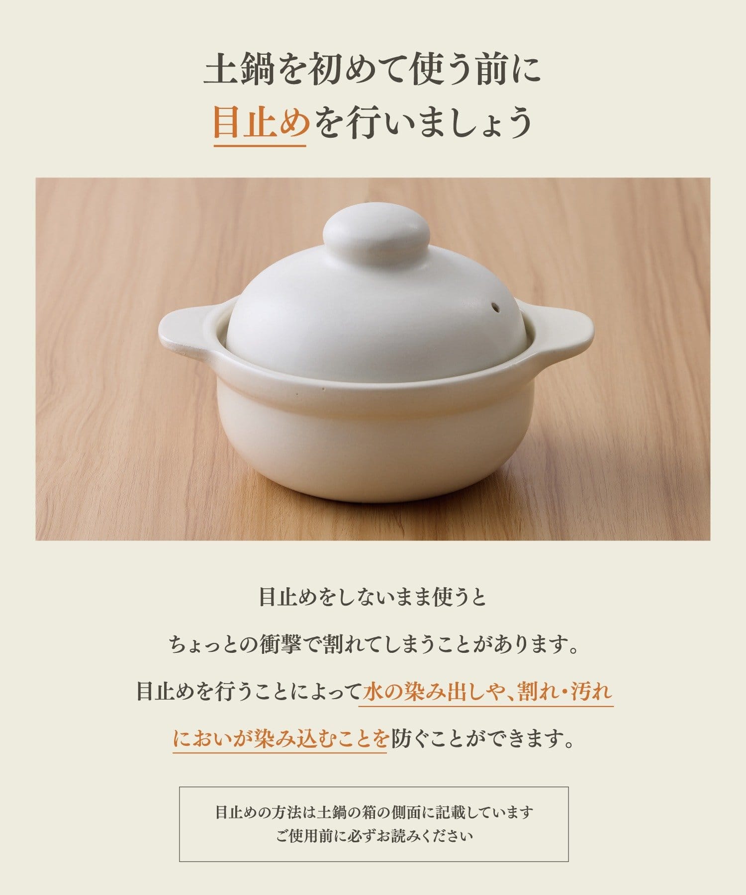 ●土鍋の特性により水分がしみ出てくる場合があります。初めてご使用になる際は、必ず目止めをしてからご使用ください。