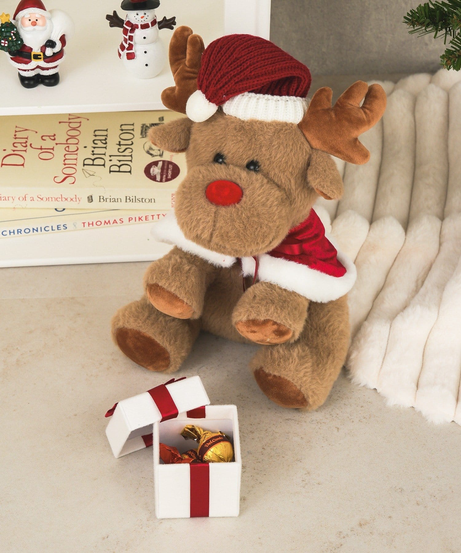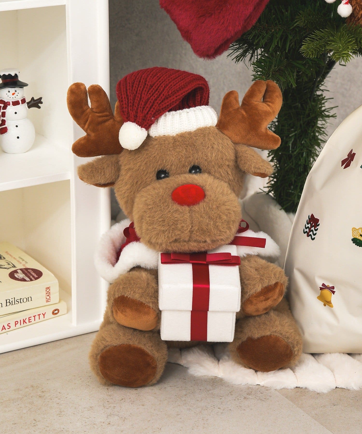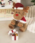 ●ふわふわの手ざわりが心地よい、サンタ帽をかぶったトナカイのぬいぐるみです。