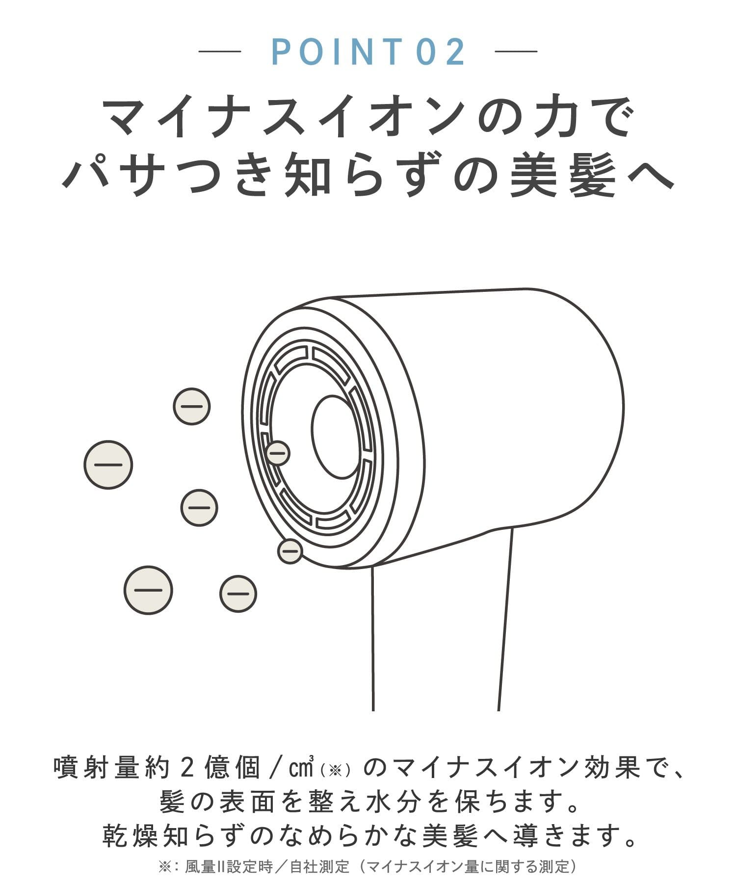 ●噴射量約2億個/㎤(※2)のマイナスイオンで、乾かすだけでうるおいを守って髪のパサつきを軽減し、なめらかな仕上がりへ。
