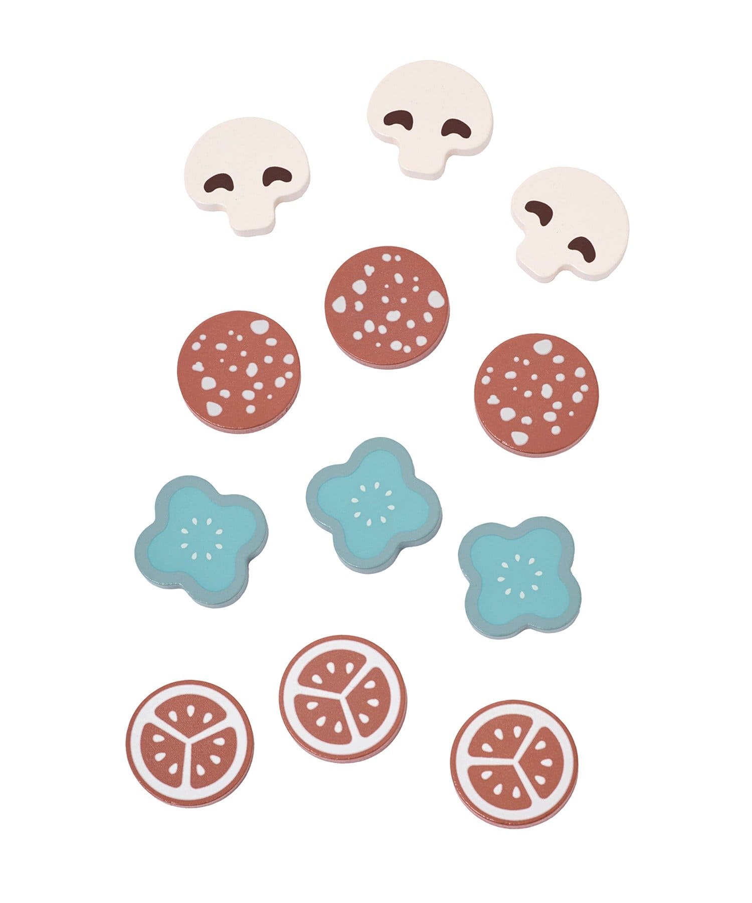 セット内容:ピザ×6、ハム×3、トマト×3、マッシュルーム×3、ピーマン×3、箱、ピザカッター
