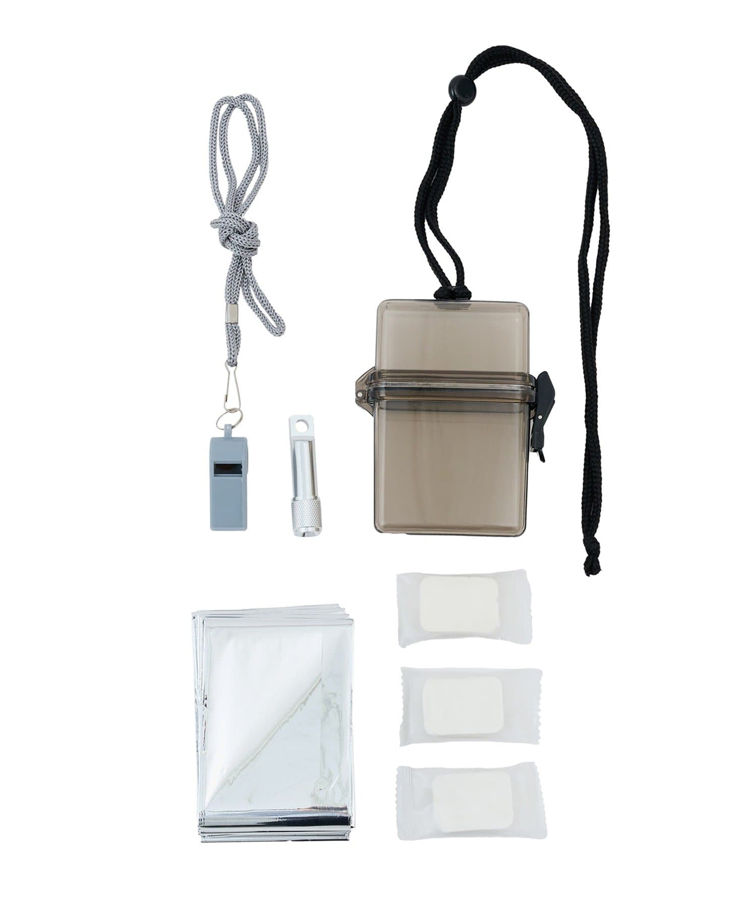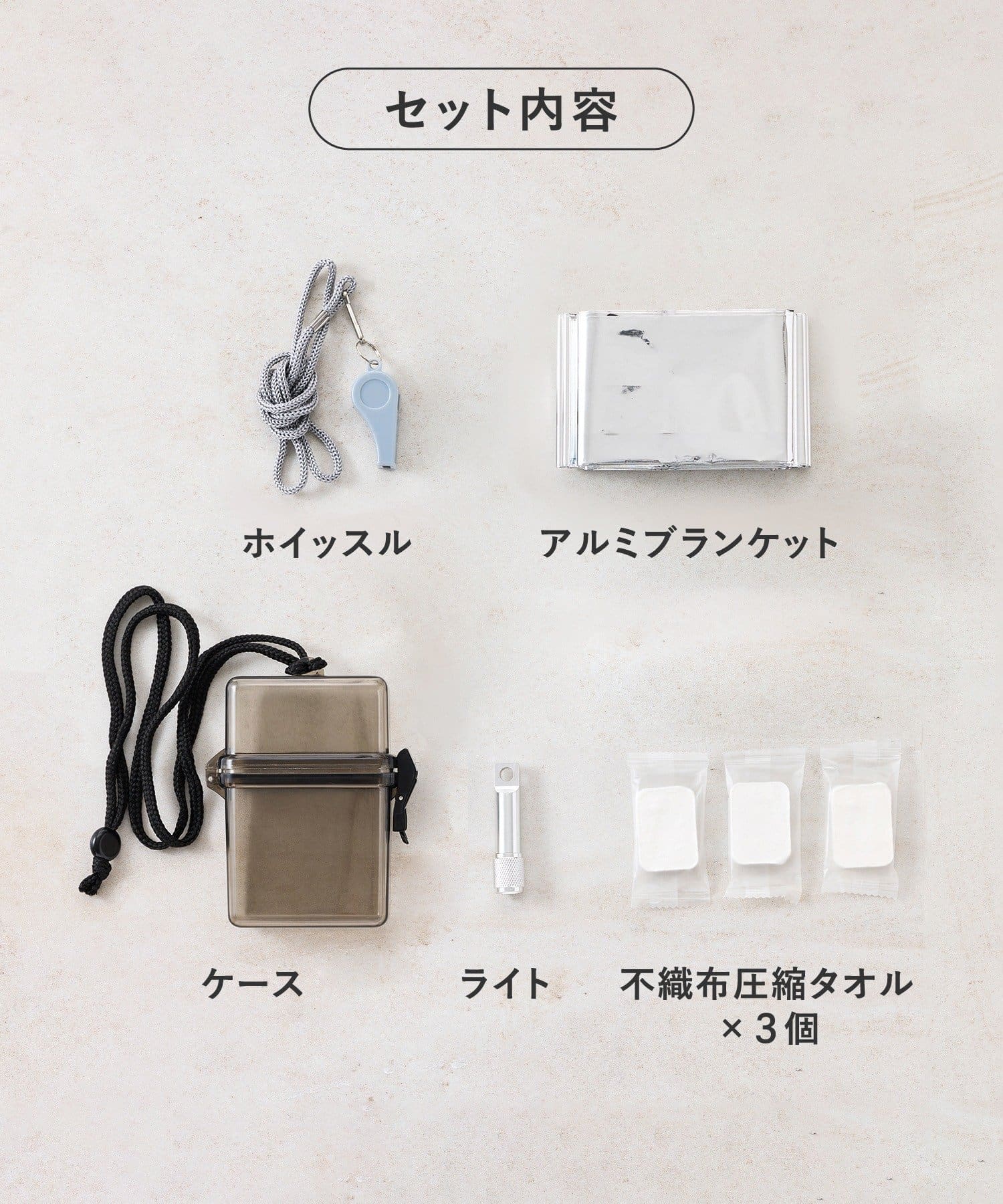 セット内容:ケース、ライト、ホイッスル、不織布圧縮タオル×3個、アルミブランケット