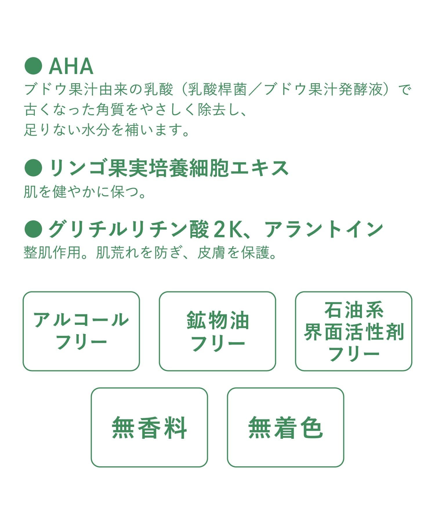 成分:水、イソペンチルジオール、BG、コハク酸ジエトキシエチル、乳酸桿菌/ブドウ果汁発酵液、ヒアルロン酸Na、アラントイン、グリチルリチン酸2K、ラベンダー花エキス、センチフォリアバラ花水、アロエベラ葉エキス、イヨカン果皮エキス、リンゴ果実培養細胞エキス、キサンタンガム、グリセリン、レシチン、ウララミドプロピルベタイン、ヒドロキシエチルセルロース、フェノキシエタノール、メチルパラベン、クエン酸Na