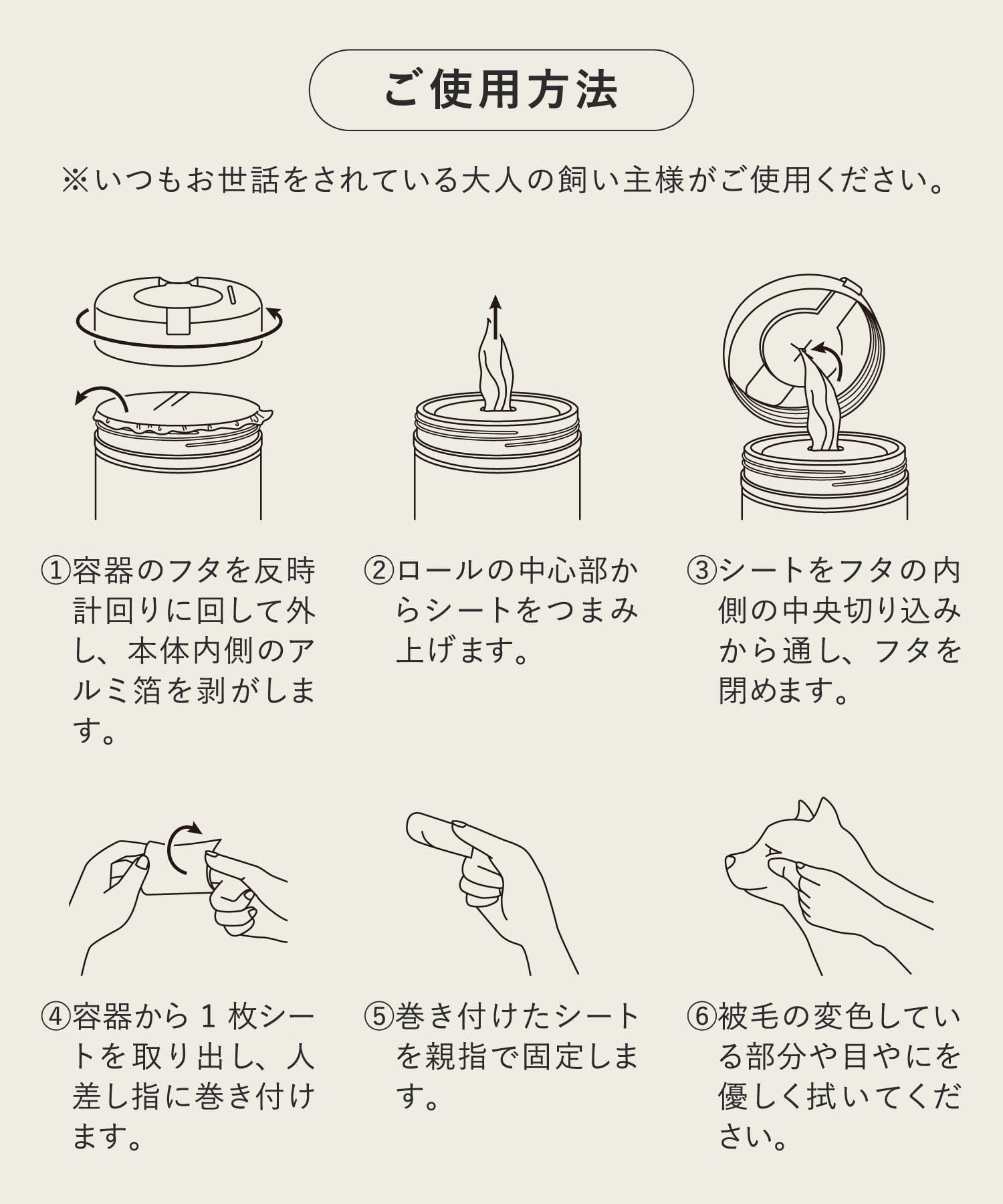 ●本品は犬・猫用の涙やけ部、顔まわりのお手入れ用品で、予防・治療を目的とするものではありません。他の目的に使用しないでください。