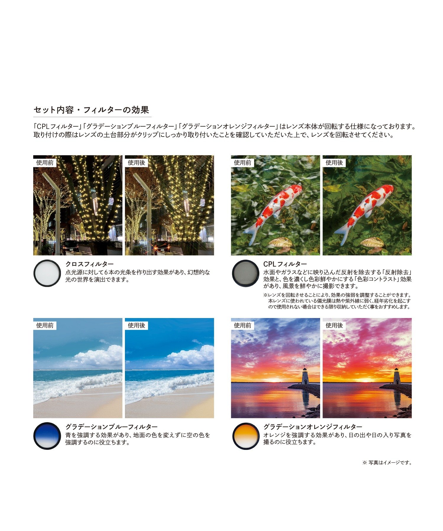 ●スマートフォンのカメラレンズに合わせて装着することで本格的な撮影が可能です。
