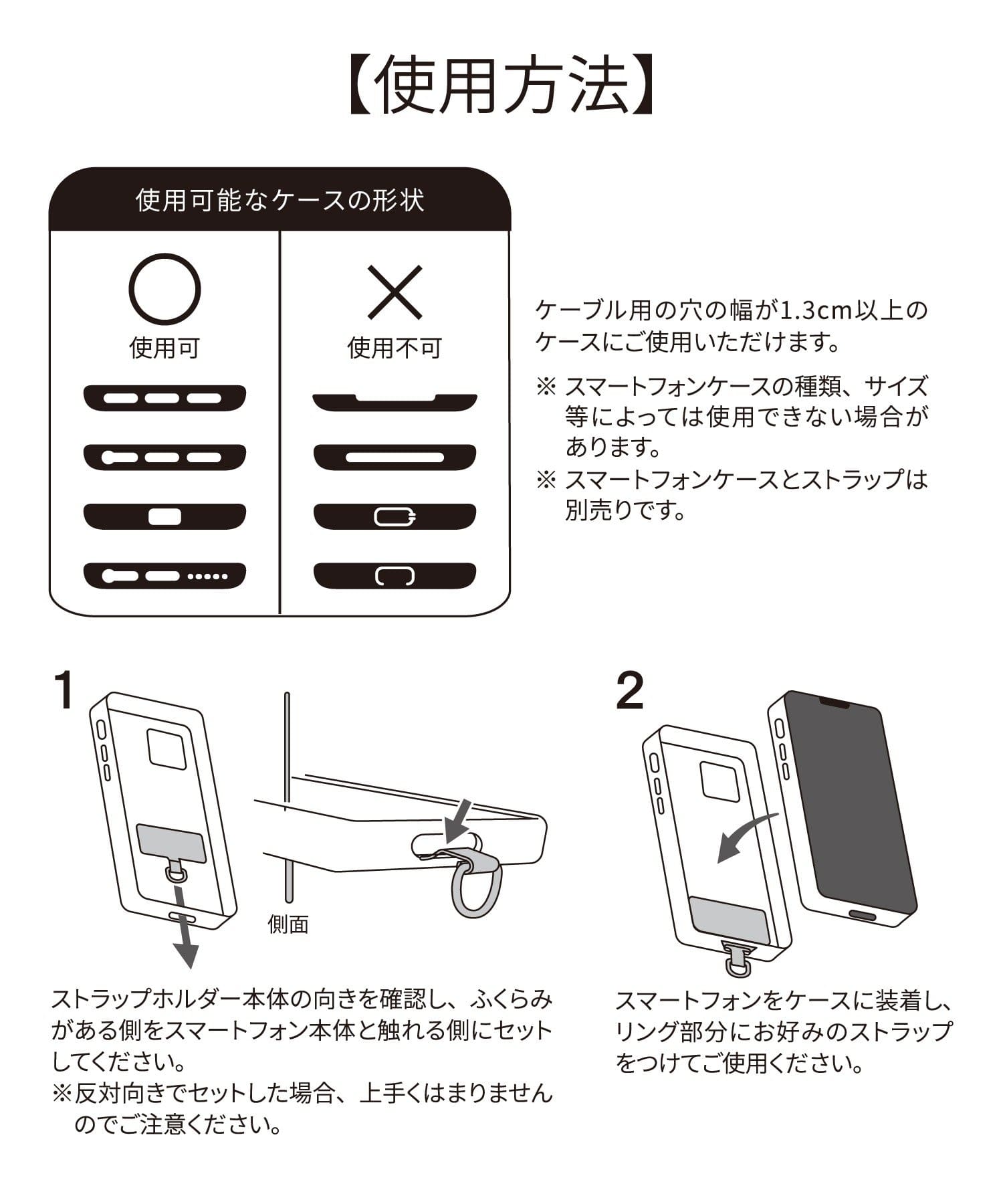 ●スマホケースに挟んで取り付けられるので、キーホルダーが付けられないケースでも使えます。