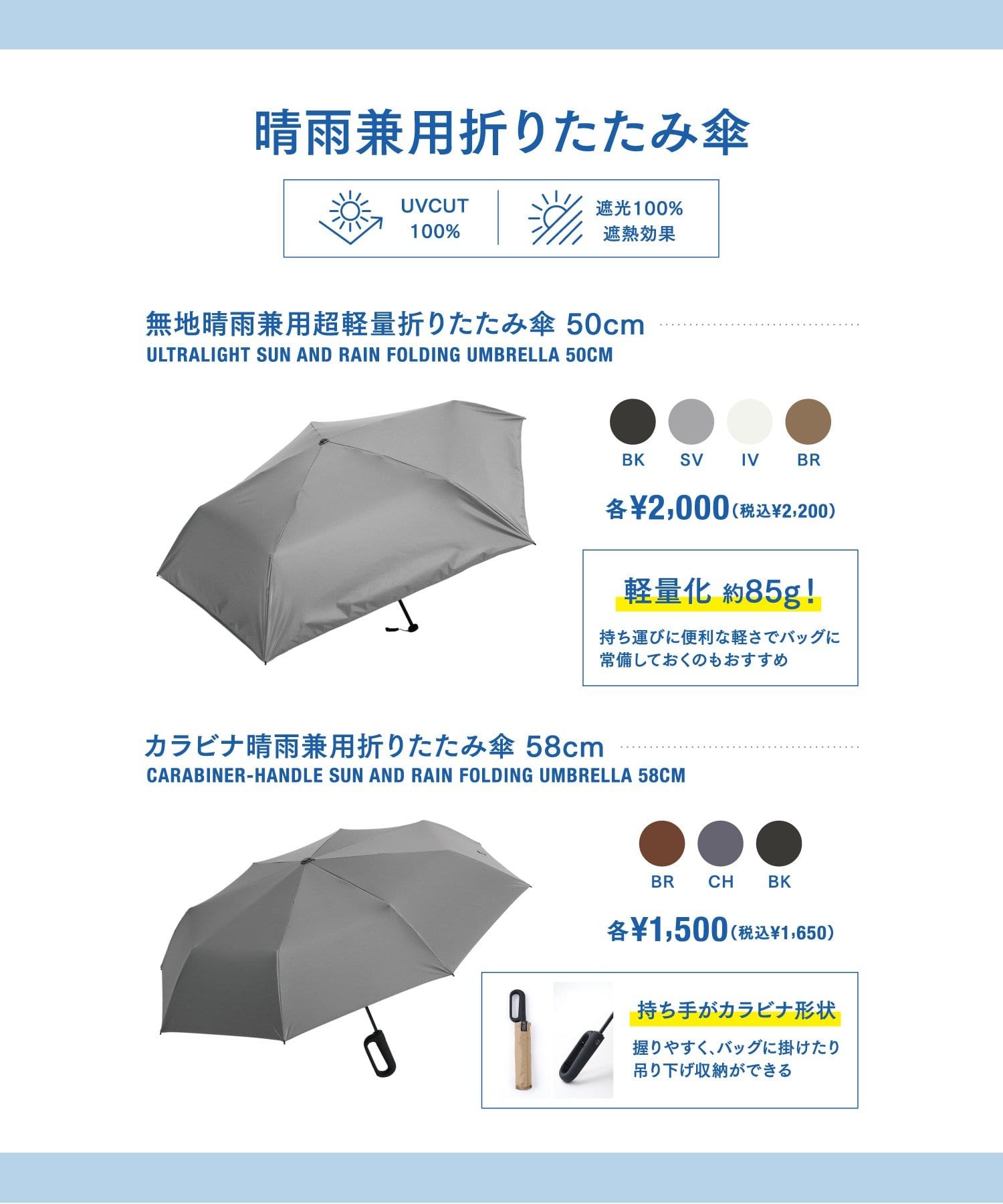《約85g》無地晴雨兼用超軽量折りたたみ傘:50cm