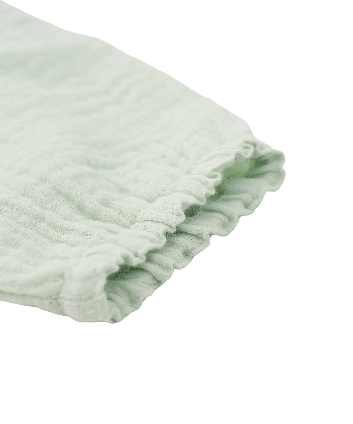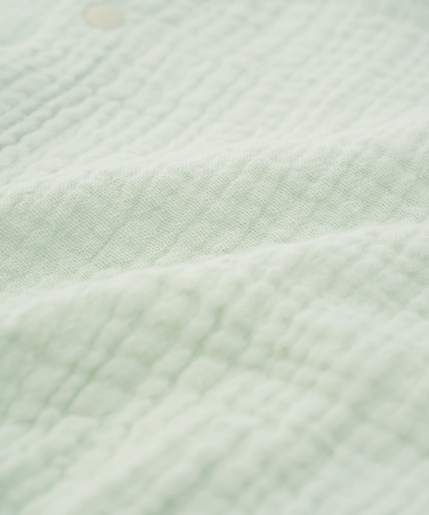 ●綿100%のダブルガーゼ素材を使用したしっとりと柔らかな肌触りのスタイ。