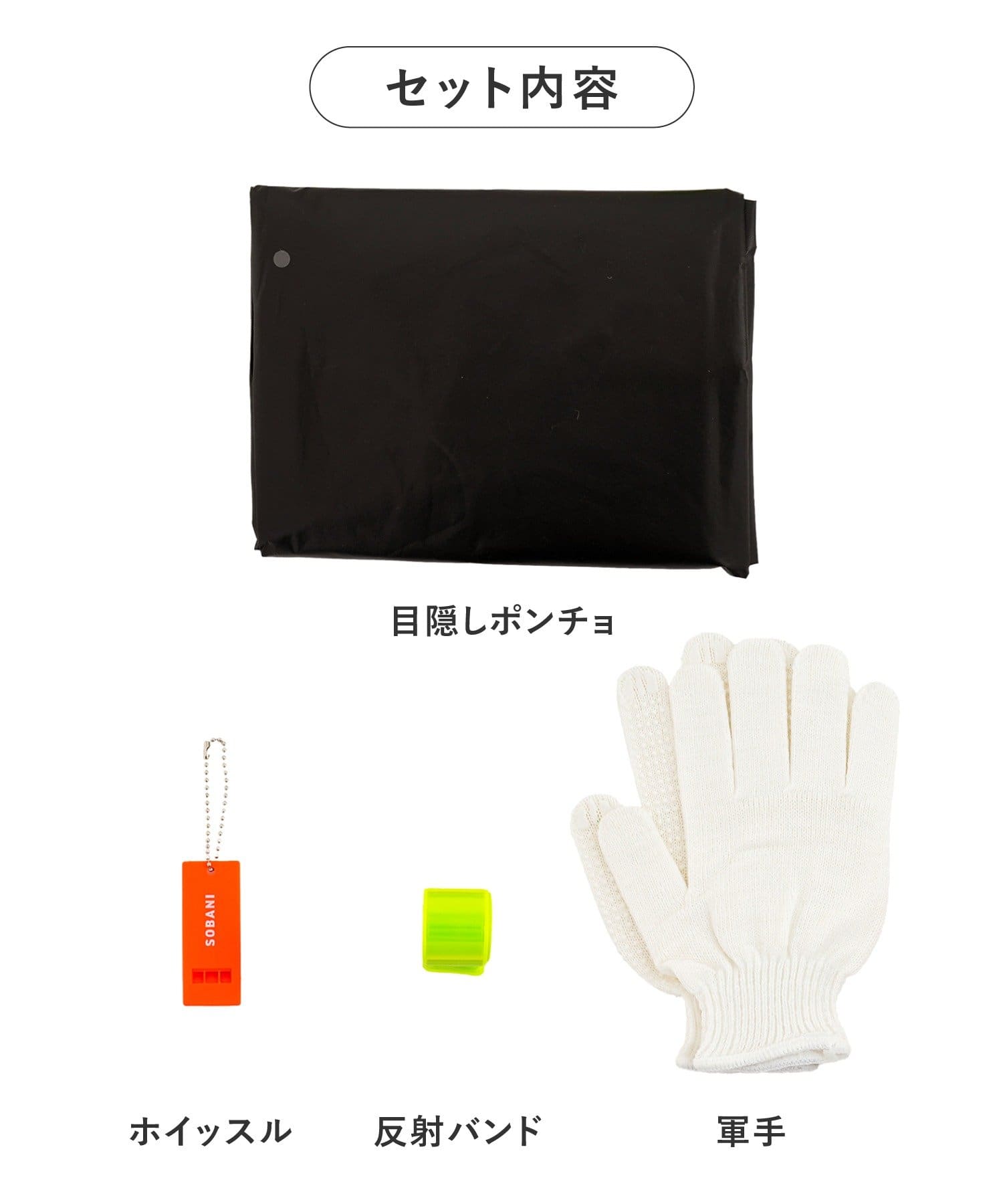 ●目隠しポンチョ、軍手、ホイッスル、反射バンドのセットです。