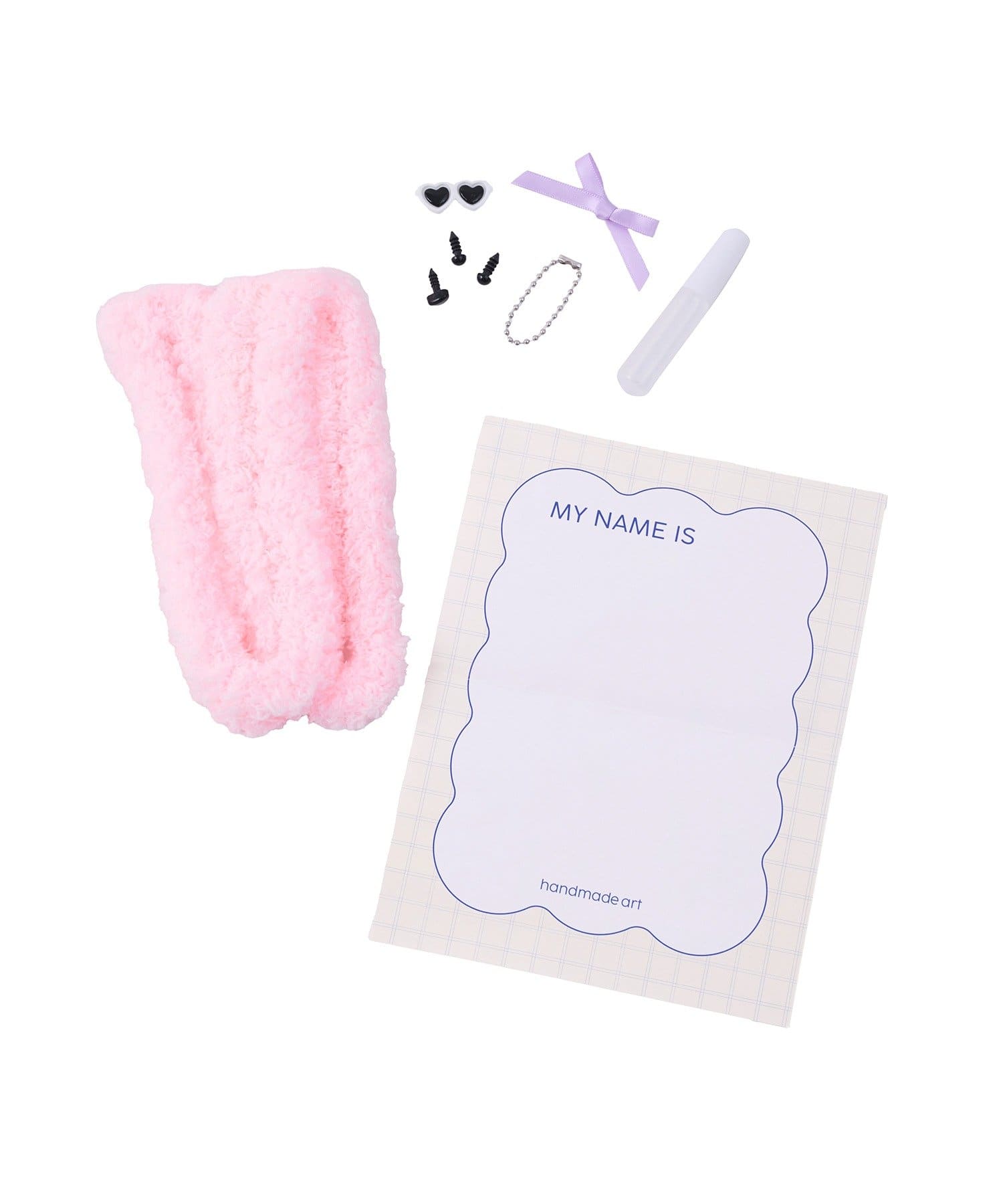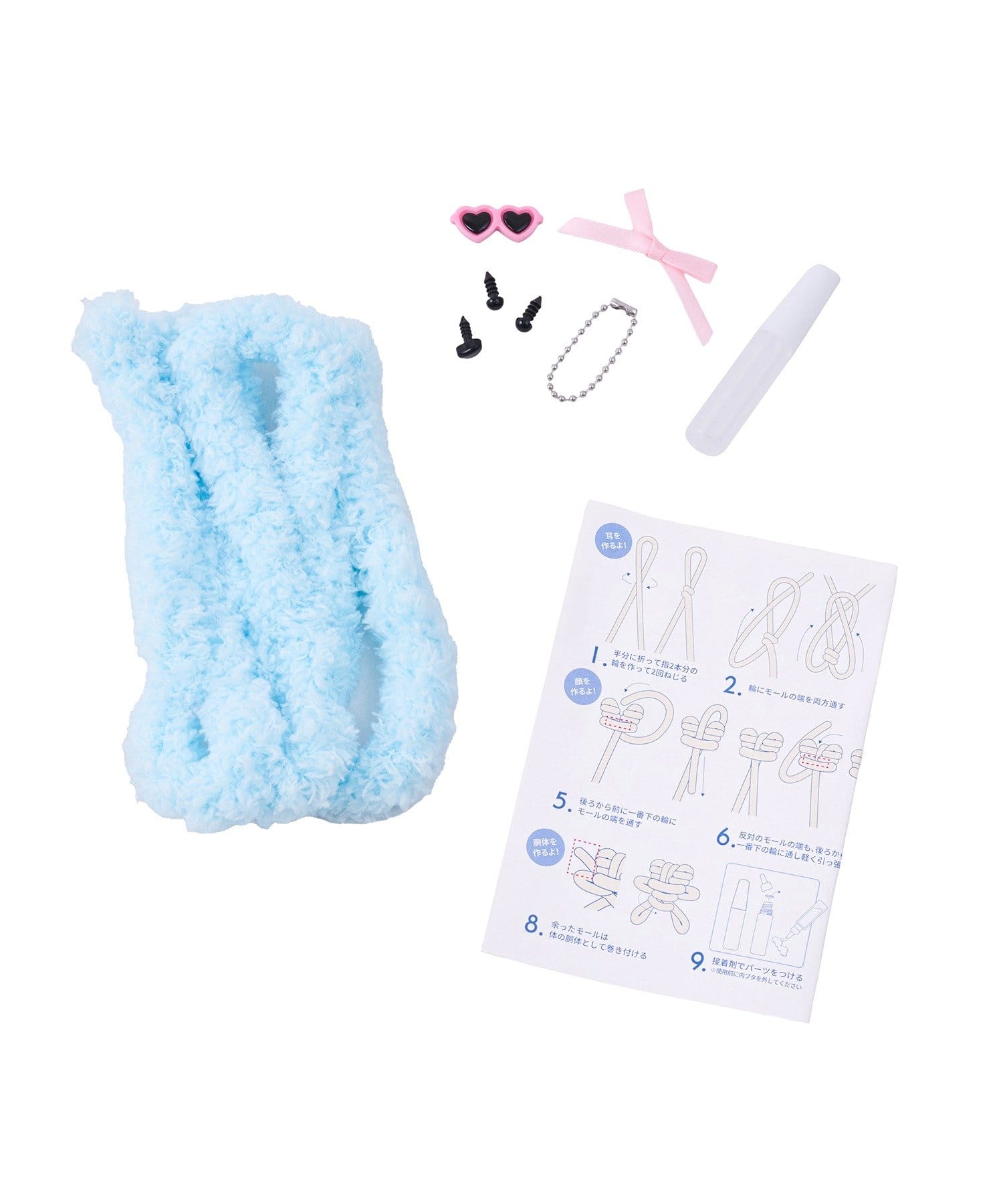 セット内容:モール(1本)、サングラス(1個) 目パーツ(2個)、鼻パーツ(1個)、リボン(1個)、 チェーン(1個)、接着剤(1本)、説明書/撮影台紙(1枚)