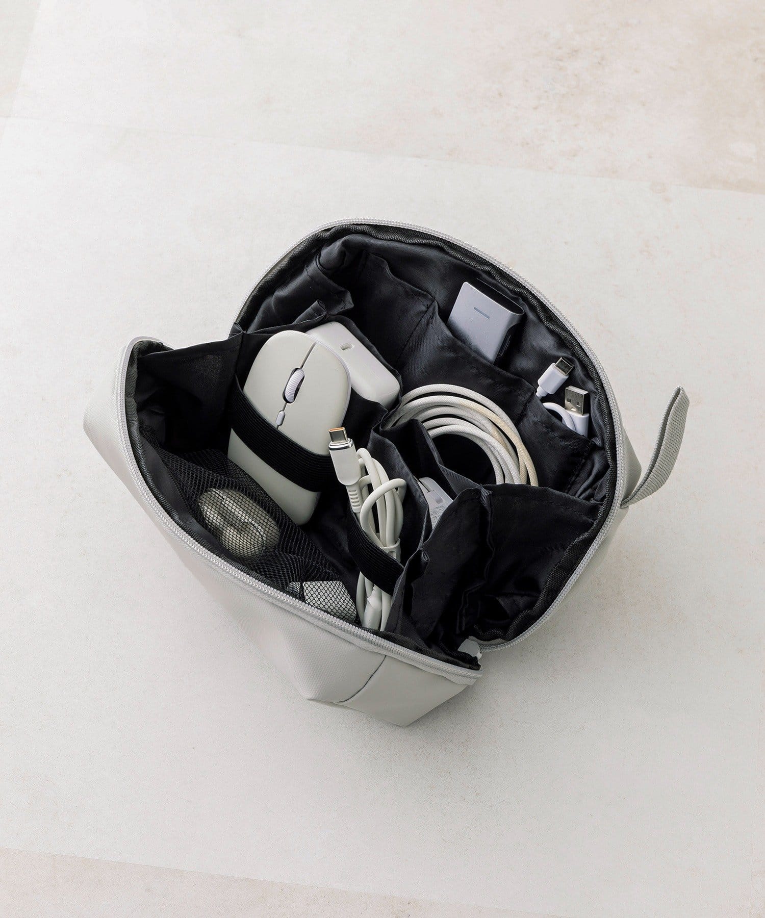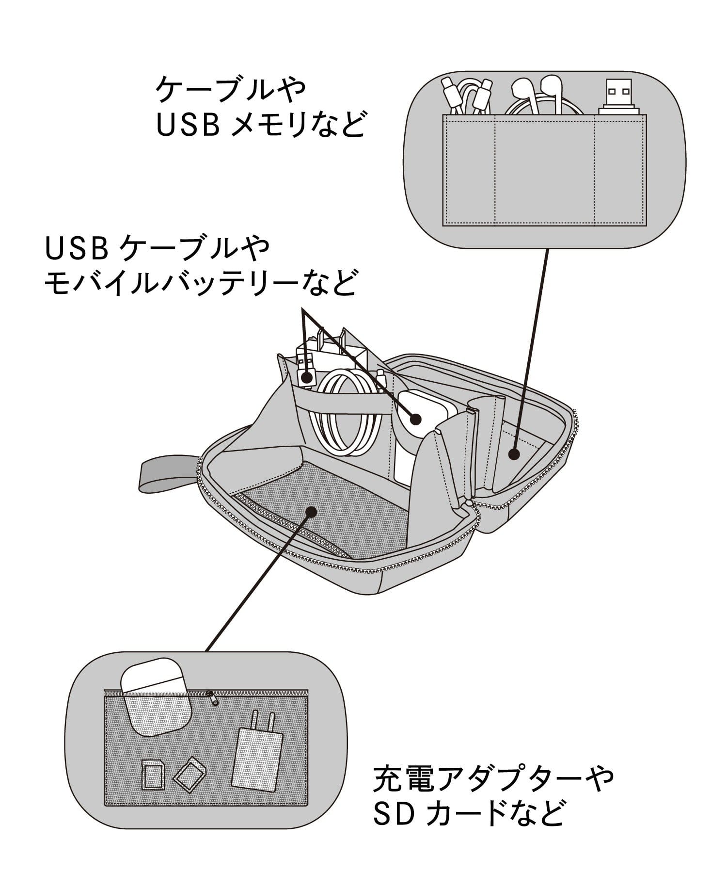 ●多種多様なポケットや仕切りで、ケーブルやモバイルバッテリーなどを整理して収納できます。