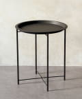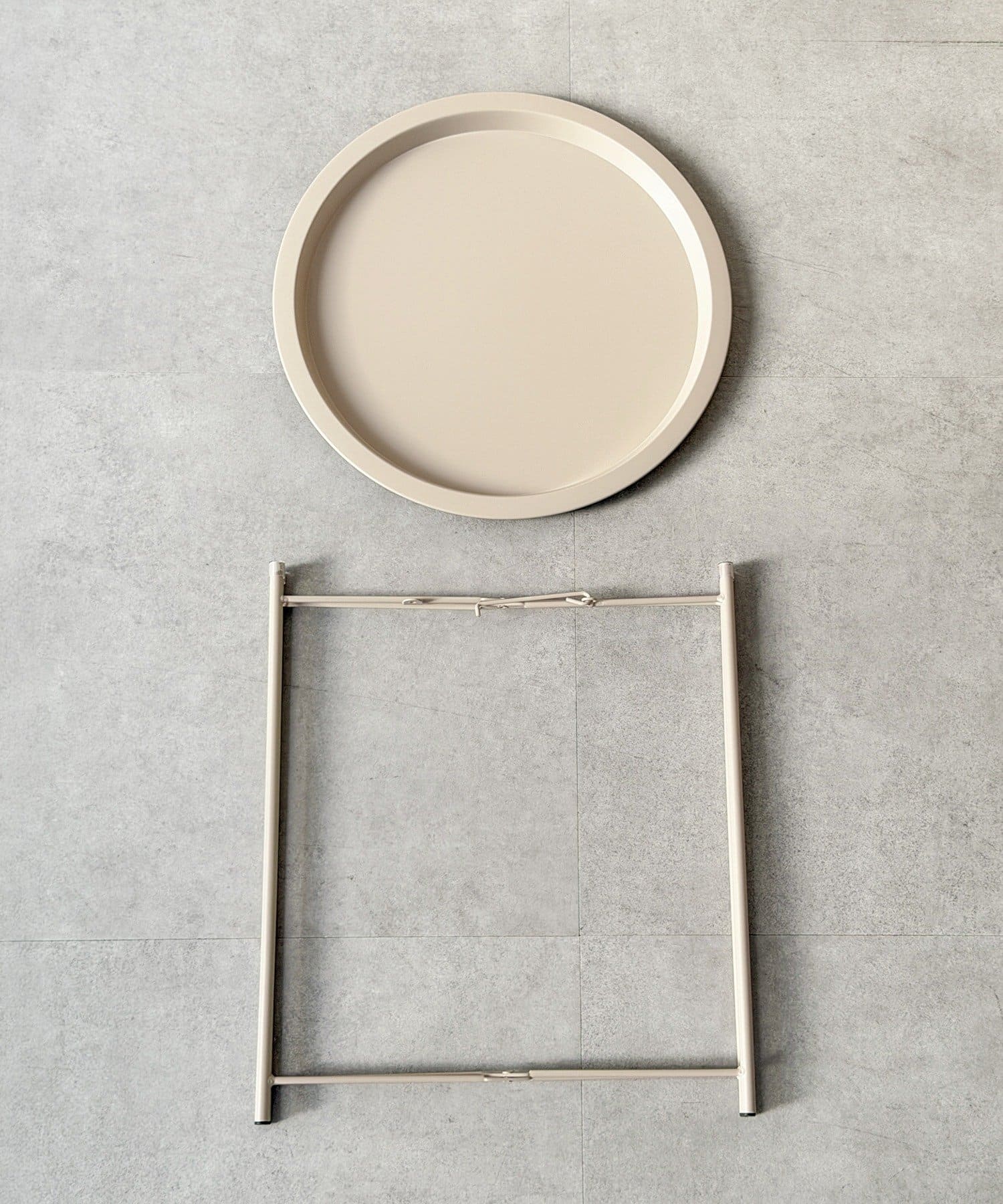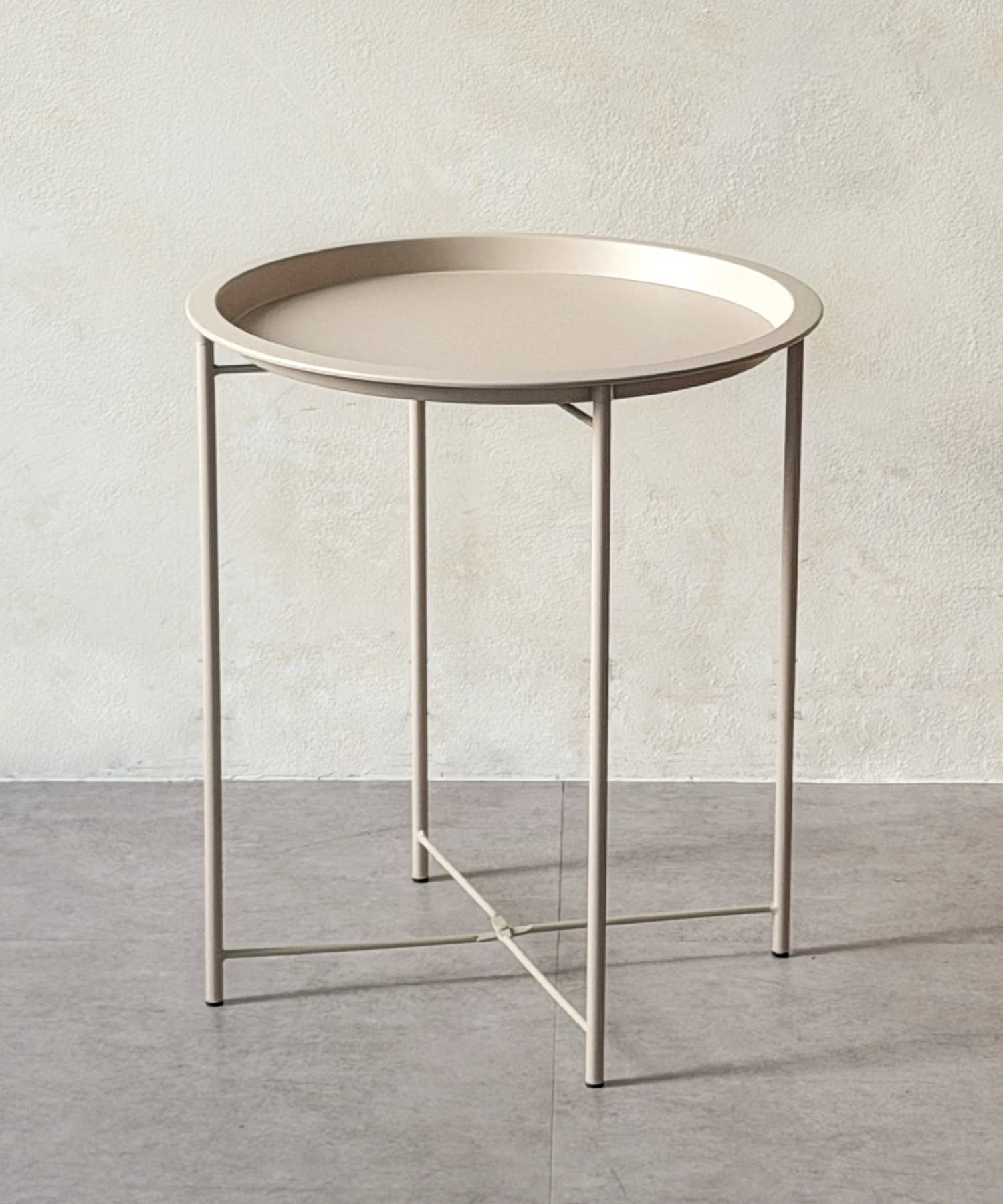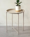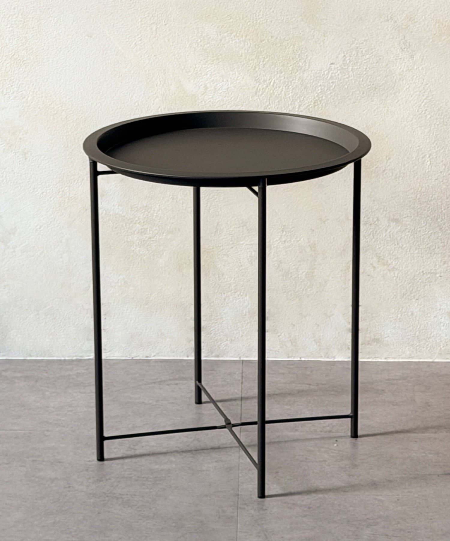 ●細身のアイアン脚に、取り外し可能な丸トレーを組み合わせたシンプルなサイドスタンド。