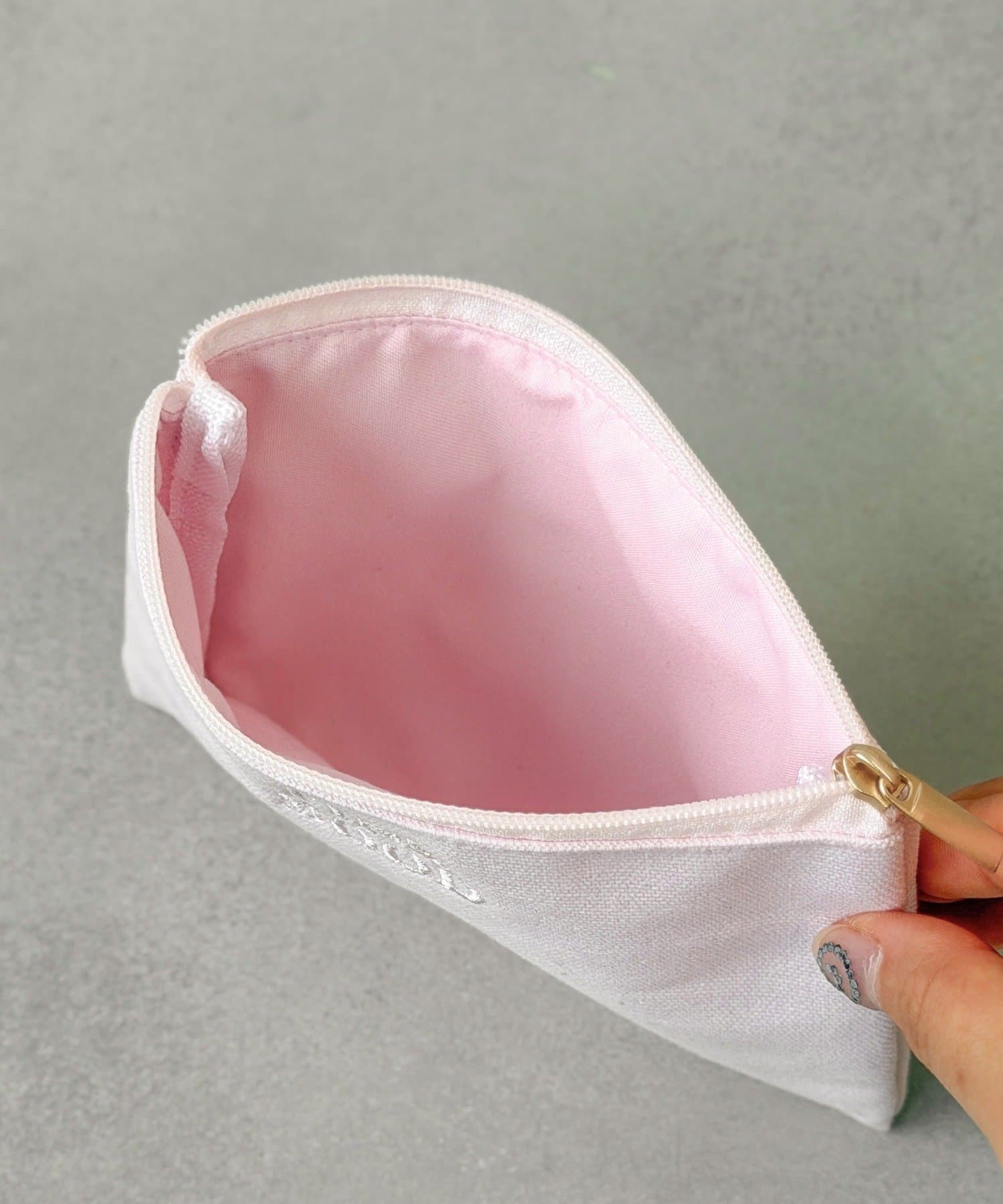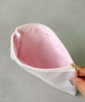 ●やさしいベビーピンクが目を惹く、シンプルなキャンバスポーチ。刺繍がワンポイント入っていて可愛い◎