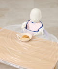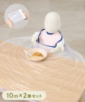 ●テーブルや床にテープを貼り、フィルムを伸ばすだけ。食べこぼしのお掃除の負担を軽減します。