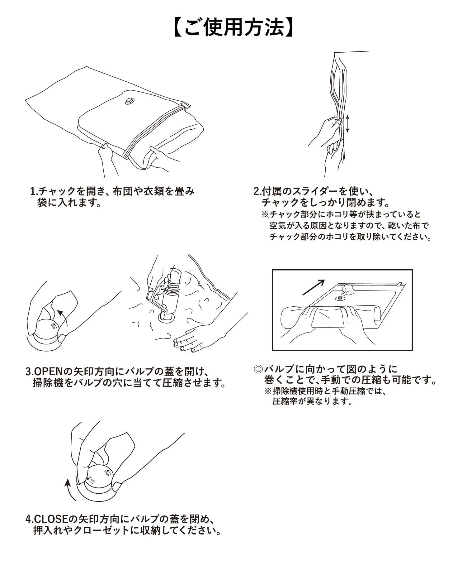 ●本品は布団や衣類などの繊維製品を収納する袋です。本来の用途以外に使用しないでください。
