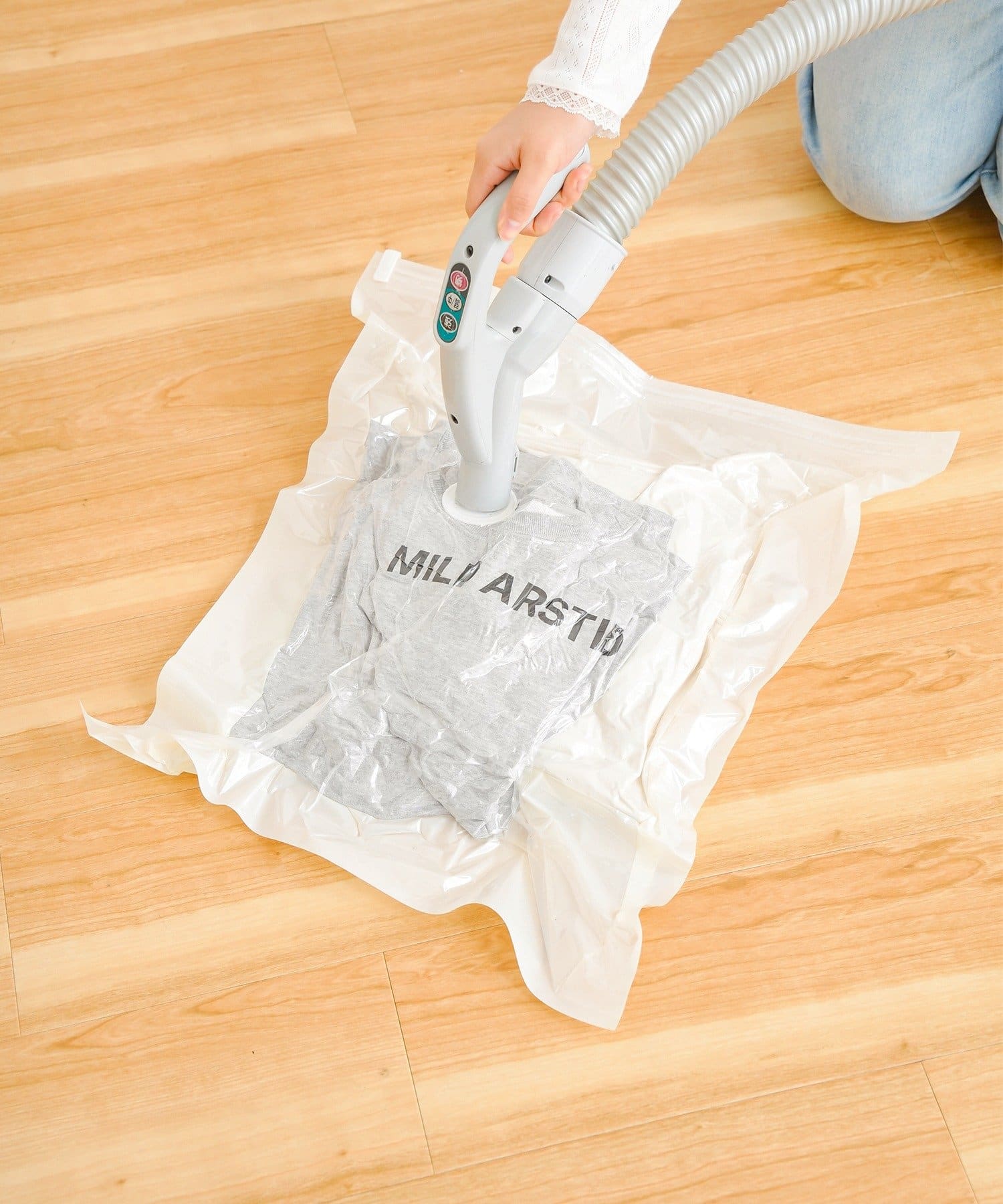 ●バルブの穴に掃除機を当てると衣類が圧縮されて平らになり、セーターやトレーナーを省スペースに収納できます。