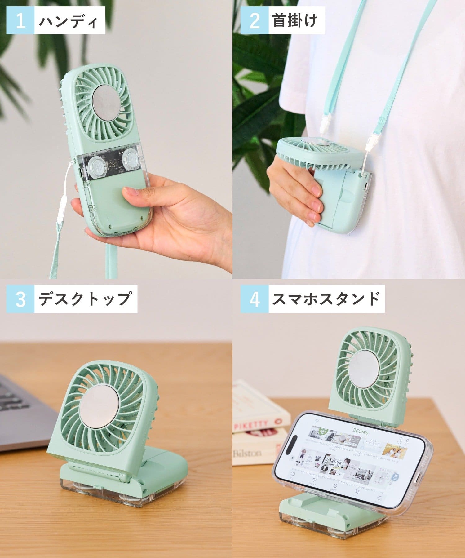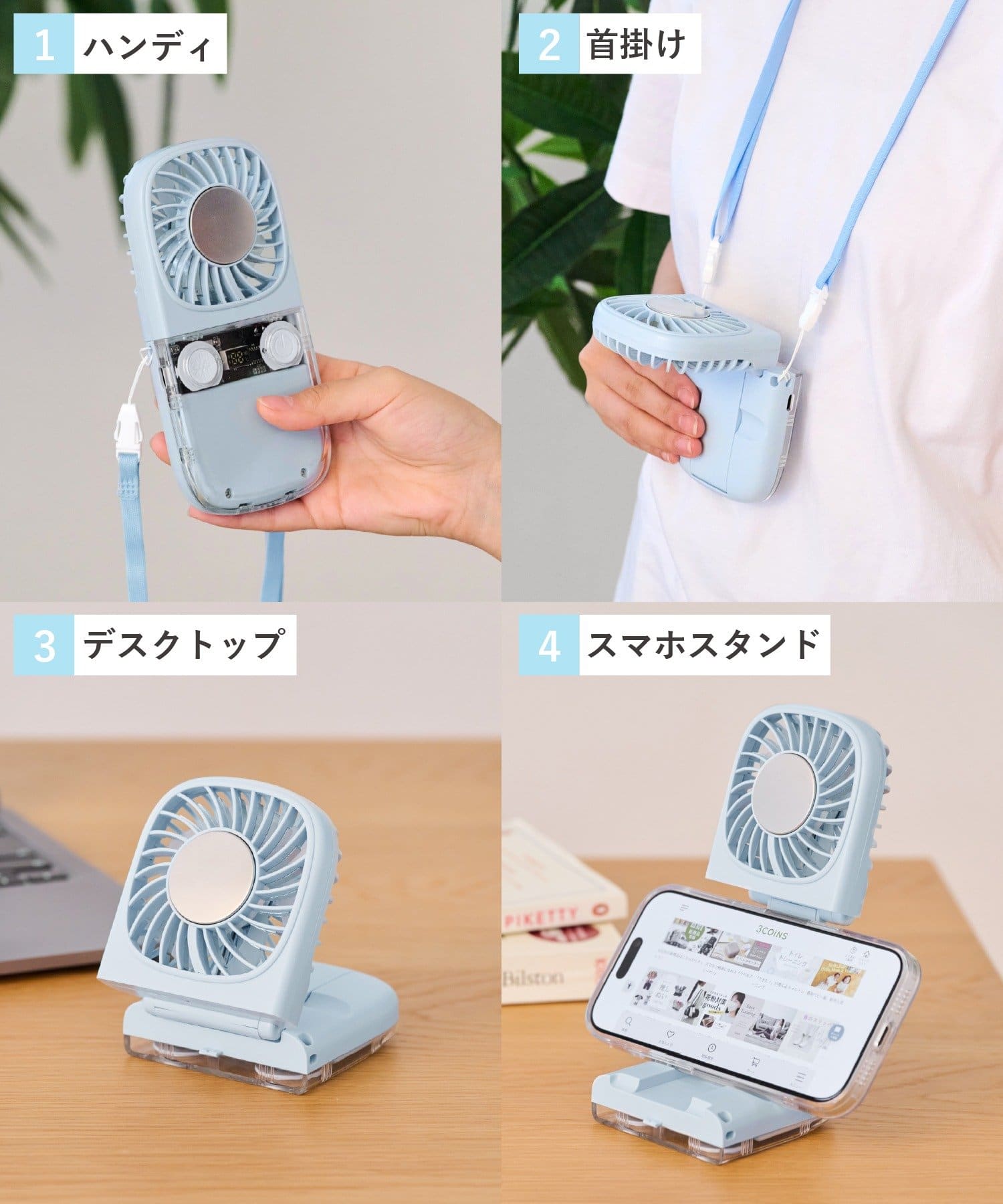 ●手持ち、卓上、首掛けに加えて、スマホスタンドとしても使える4WAY仕様。
