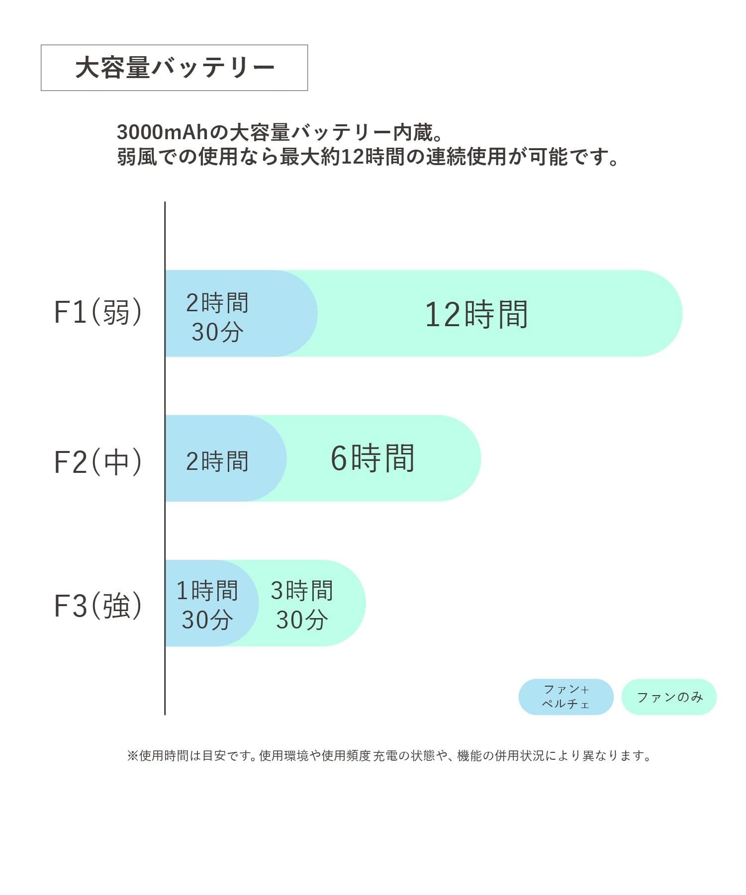 ●バッテリーは大容量の3000mAhで、ファンのみの使用なら最長約12時間とスタミナも抜群。