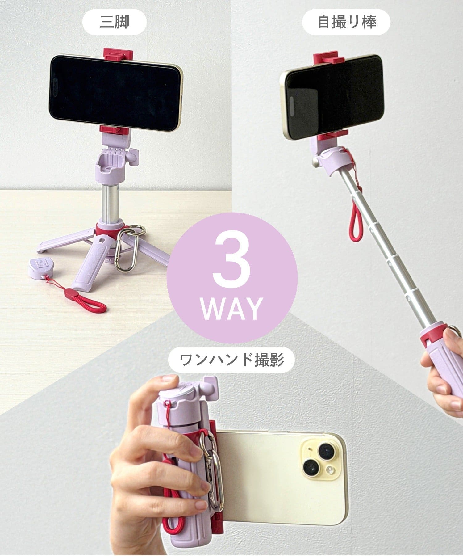 ●自撮り棒・三脚・ワンハンド撮影の3WAYで使えます。