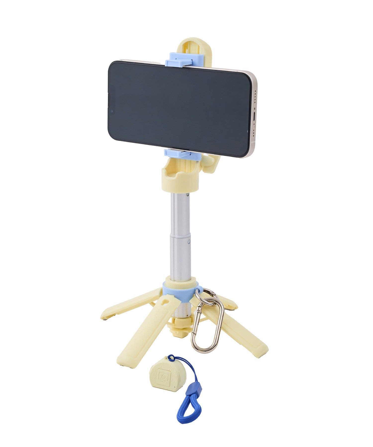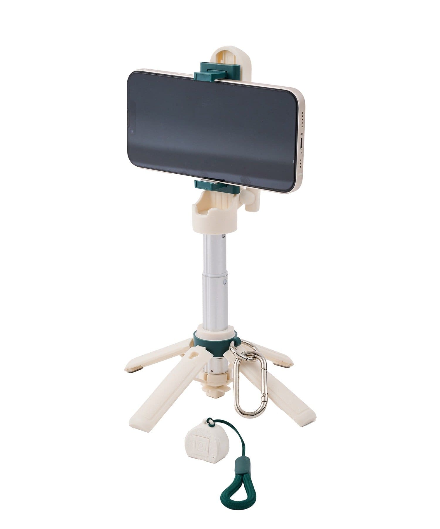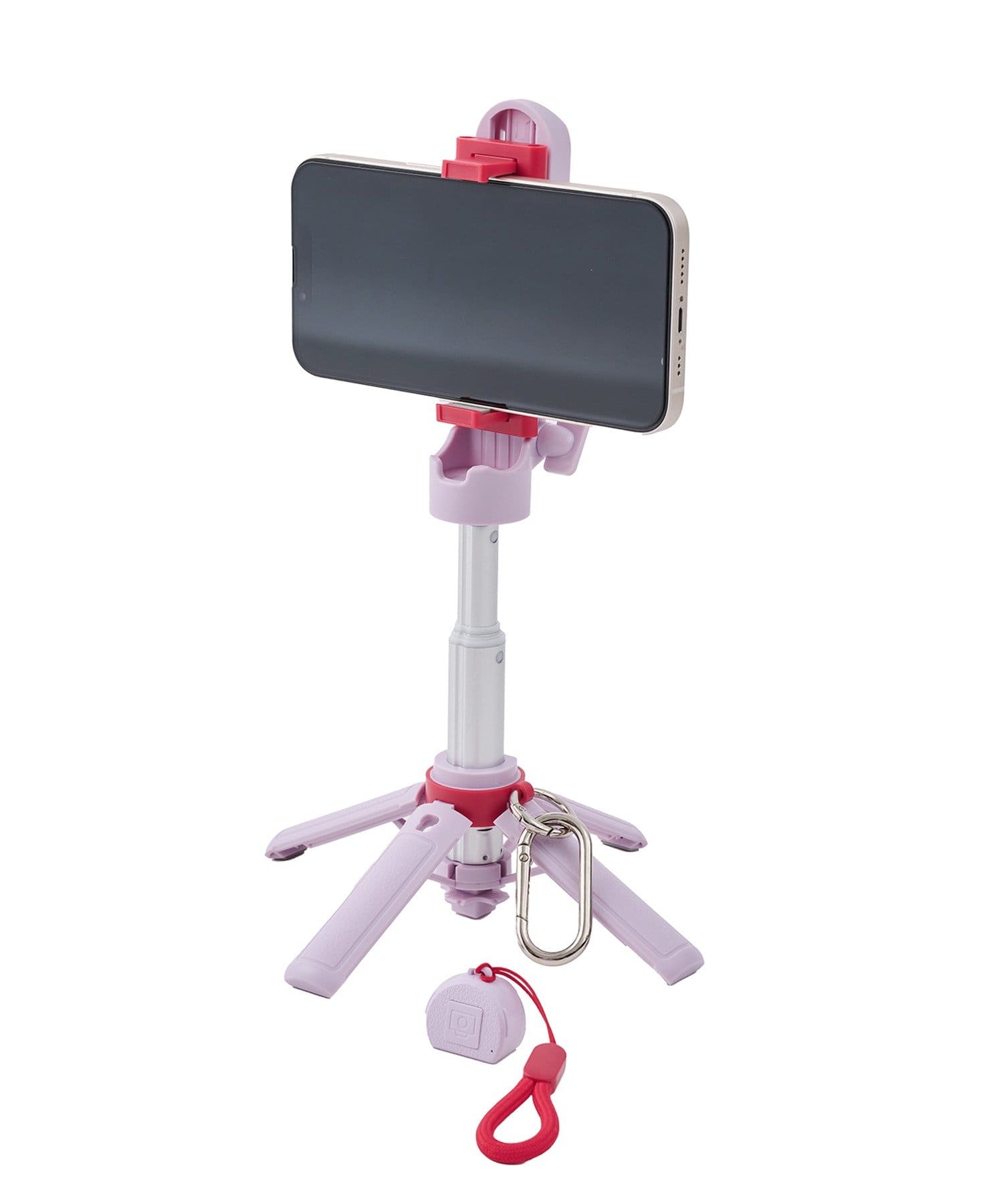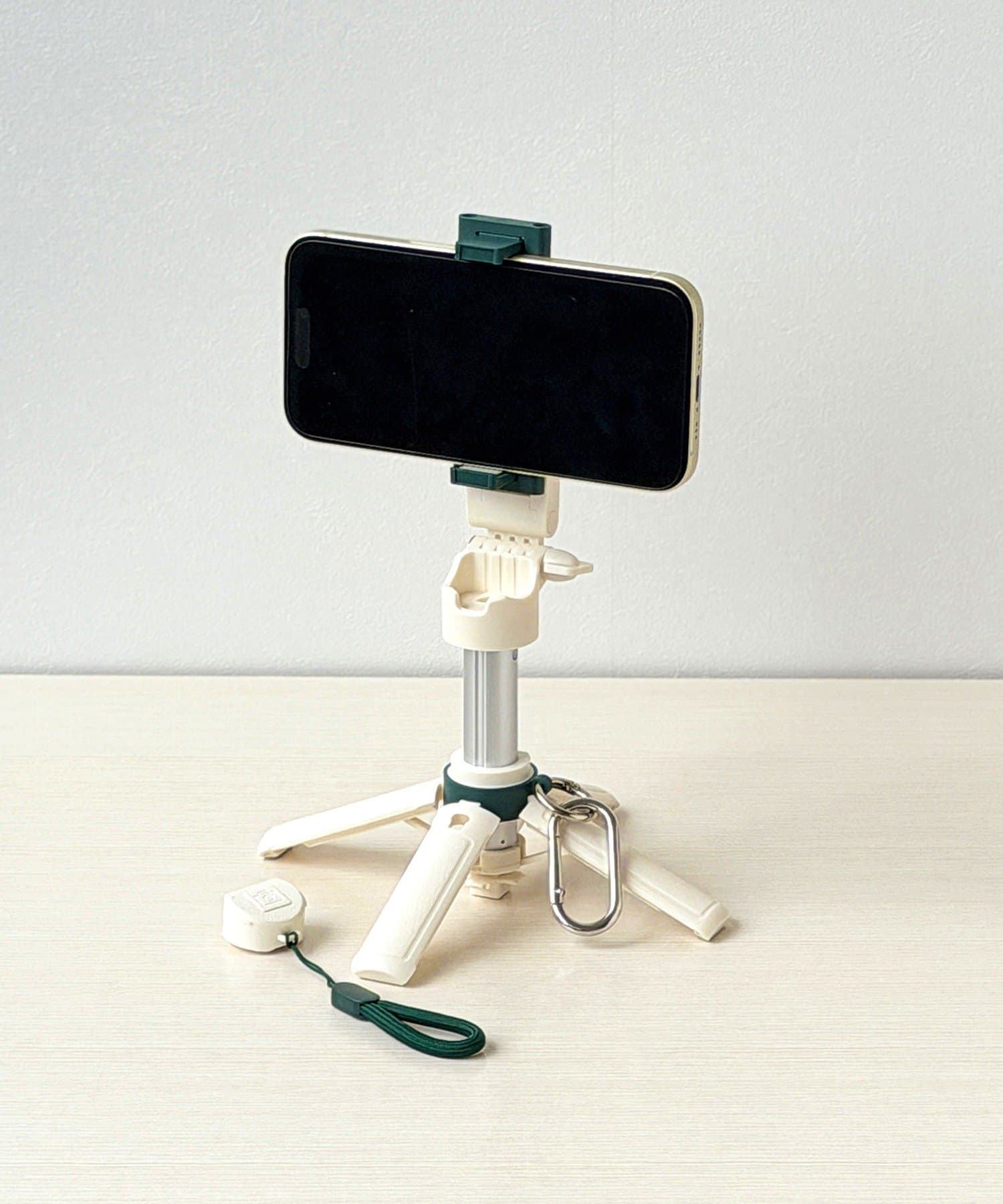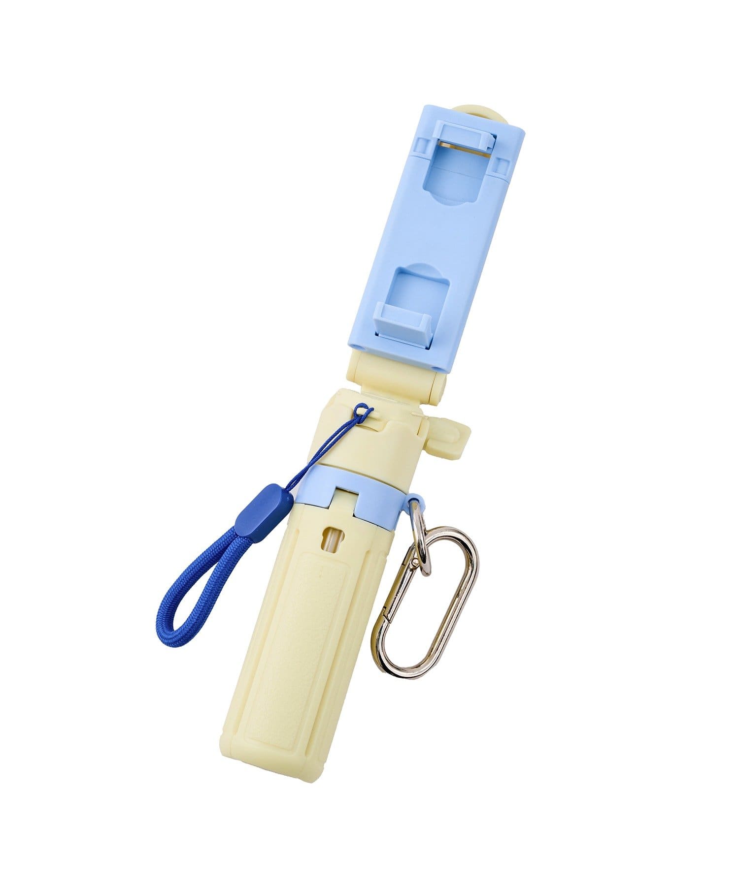 内容物:三脚自撮り棒本体×1/テスト用電池×1(取りつけ済み)/ストラップ×1/カラビナ×1/取扱説明書兼保証書×1