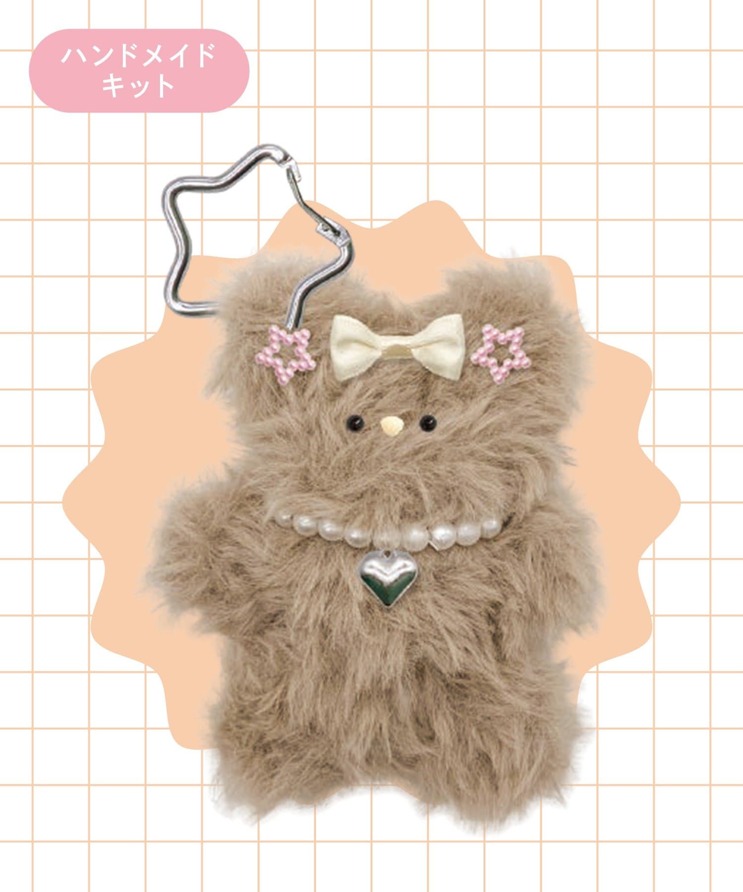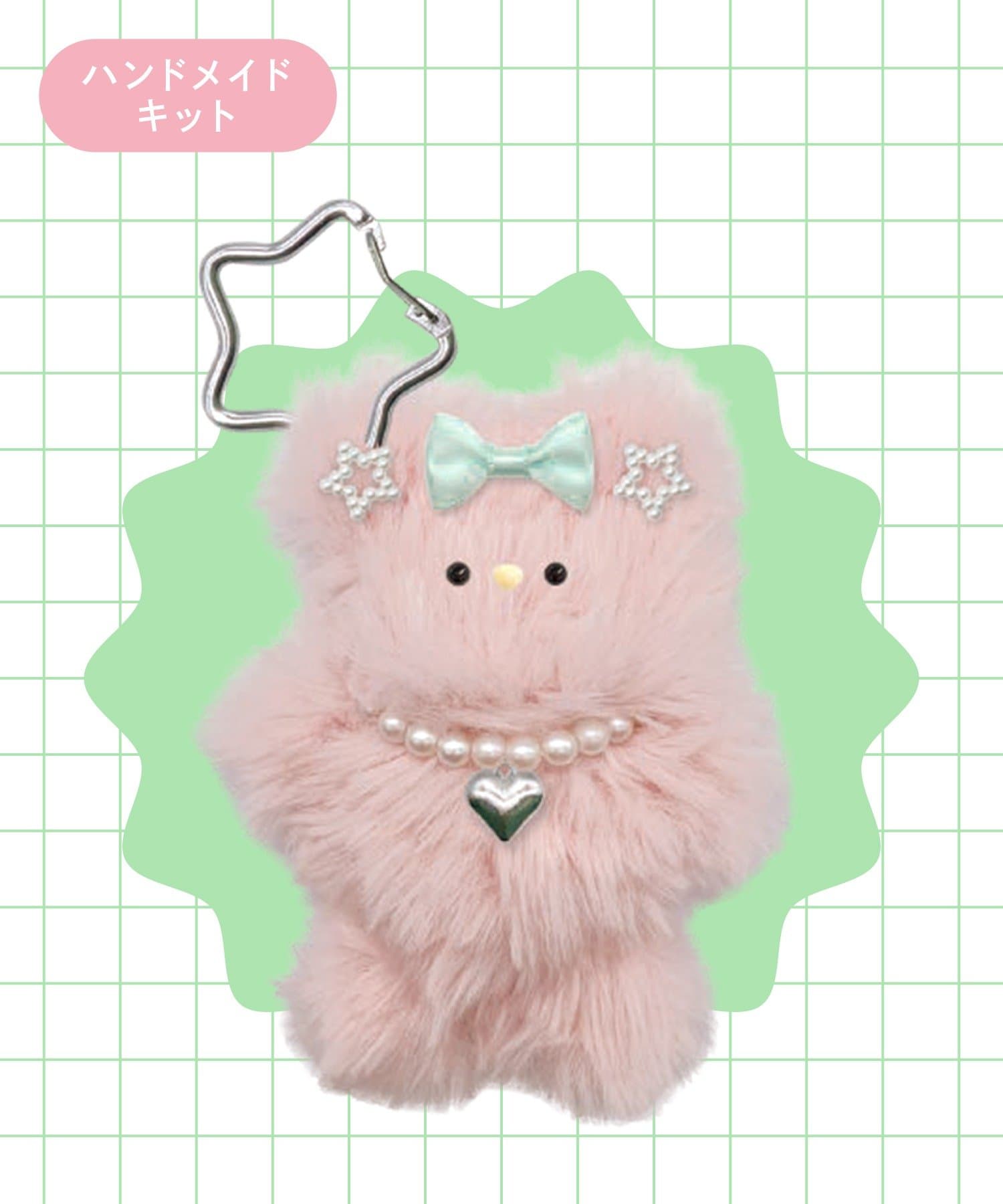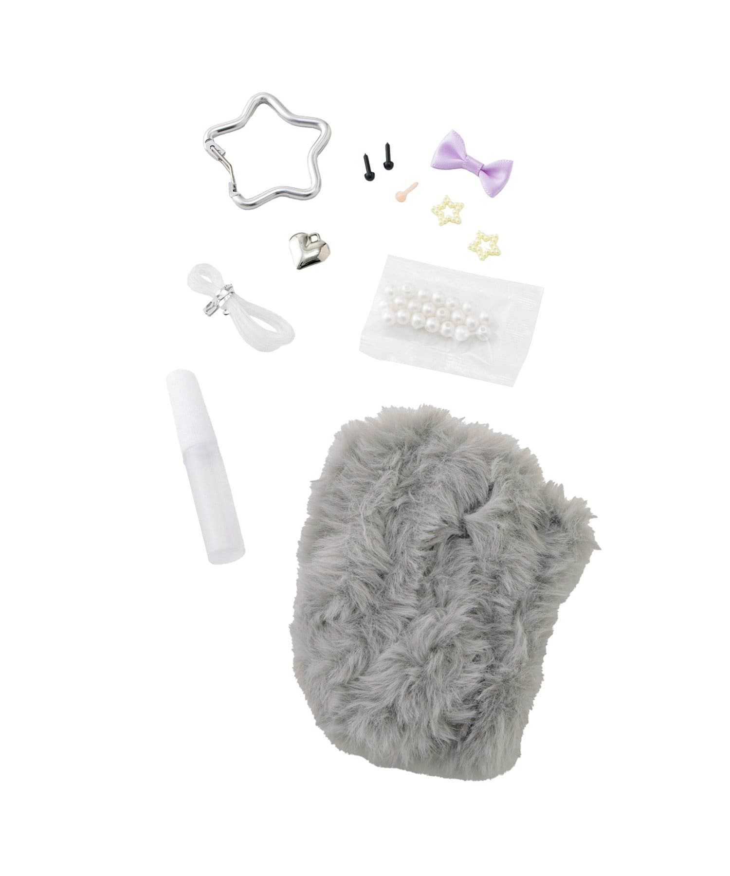 セット内容:モール×1、顔パーツー式(目・鼻)、リボン×1、星パーツ×2、パールパーツ×23、ネックレス×1、カラビナ×1、接着用グルー×1