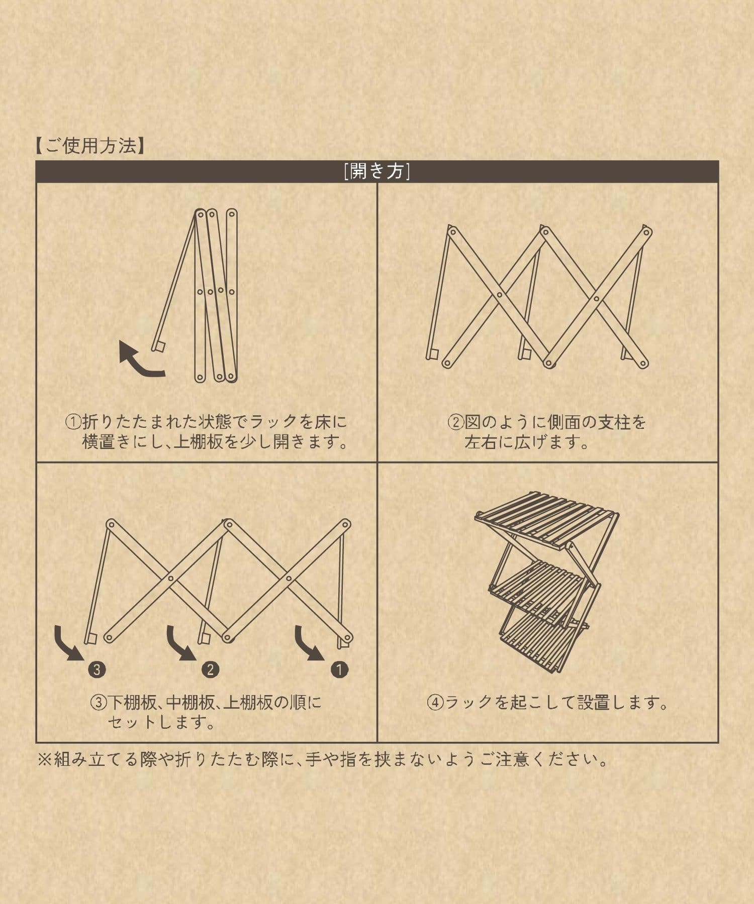●支柱と棚板の固定は確実に行ってご使用ください。固定が不十分な場合、不意に支柱が縮んで転倒し、収納してあるものの落下や本品の破損など、事故が起こる場合があります。