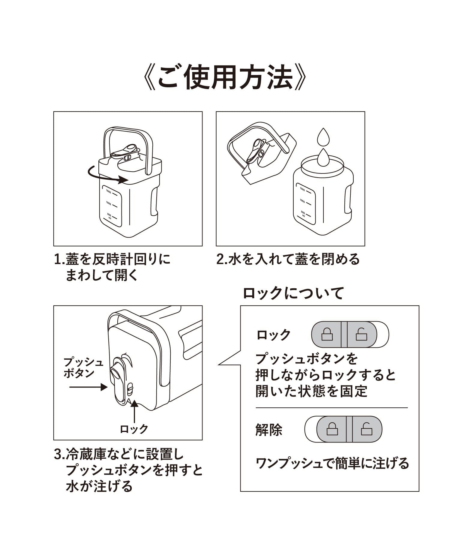 ●ボトルなどに移し替える際は、プッシュボタンを押したままロックすると注ぎ口が開いた状態をキープできて便利。