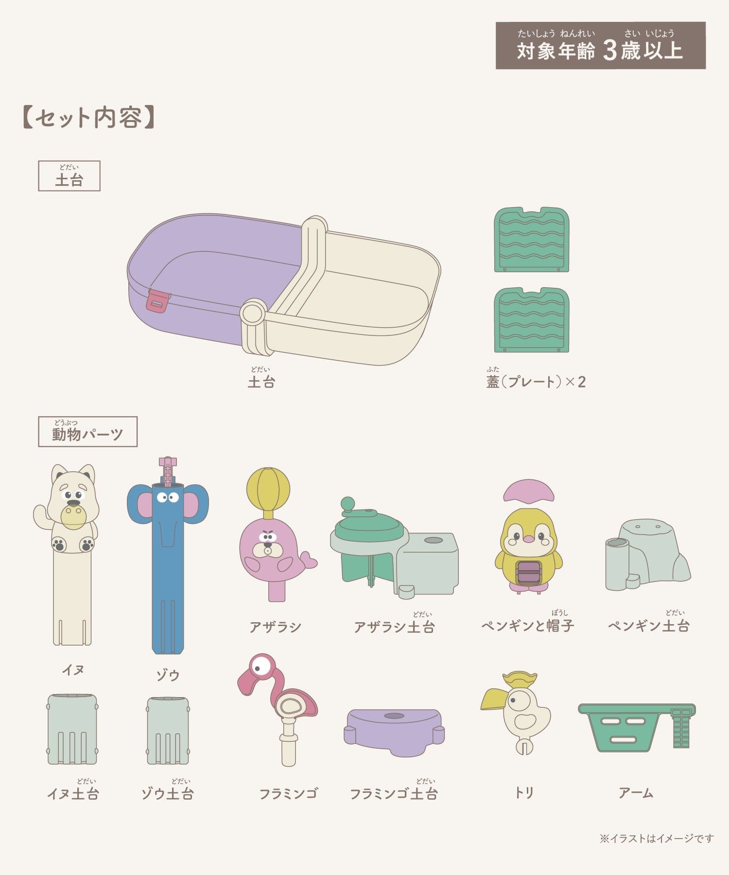 <動物パーツ>イヌ、イヌ土台、ゾウ、ゾウ土台、アザラシ、アザラシ土台、フラミンゴ、フラミンゴ土台、ペンギンと帽子、ペンギン土台、トリ、アーム