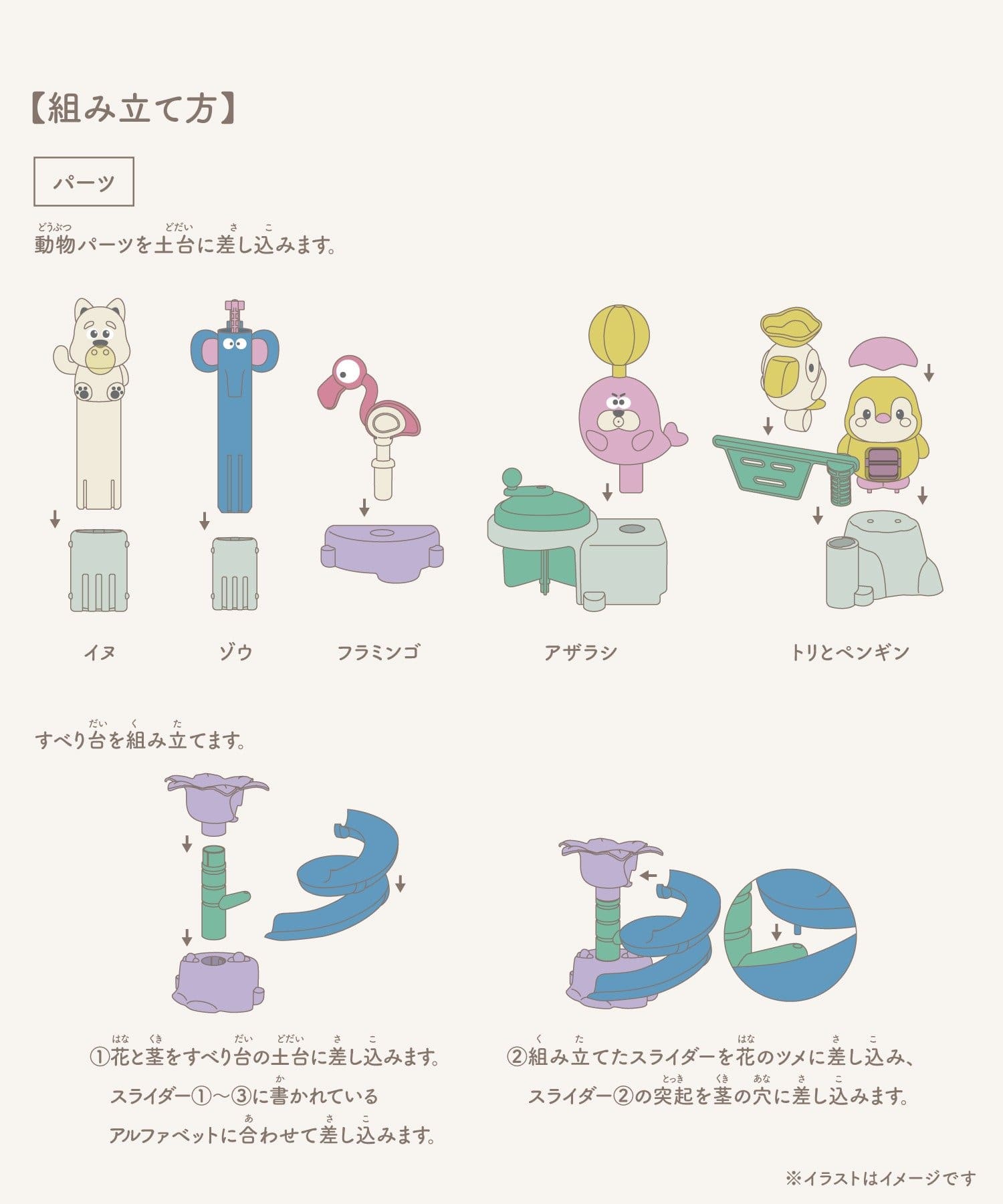 <すべり台パーツ>花、茎、スライダー1、スライダー2、スライダー3、すべり台の土台、スライダー用ストッパー×2
