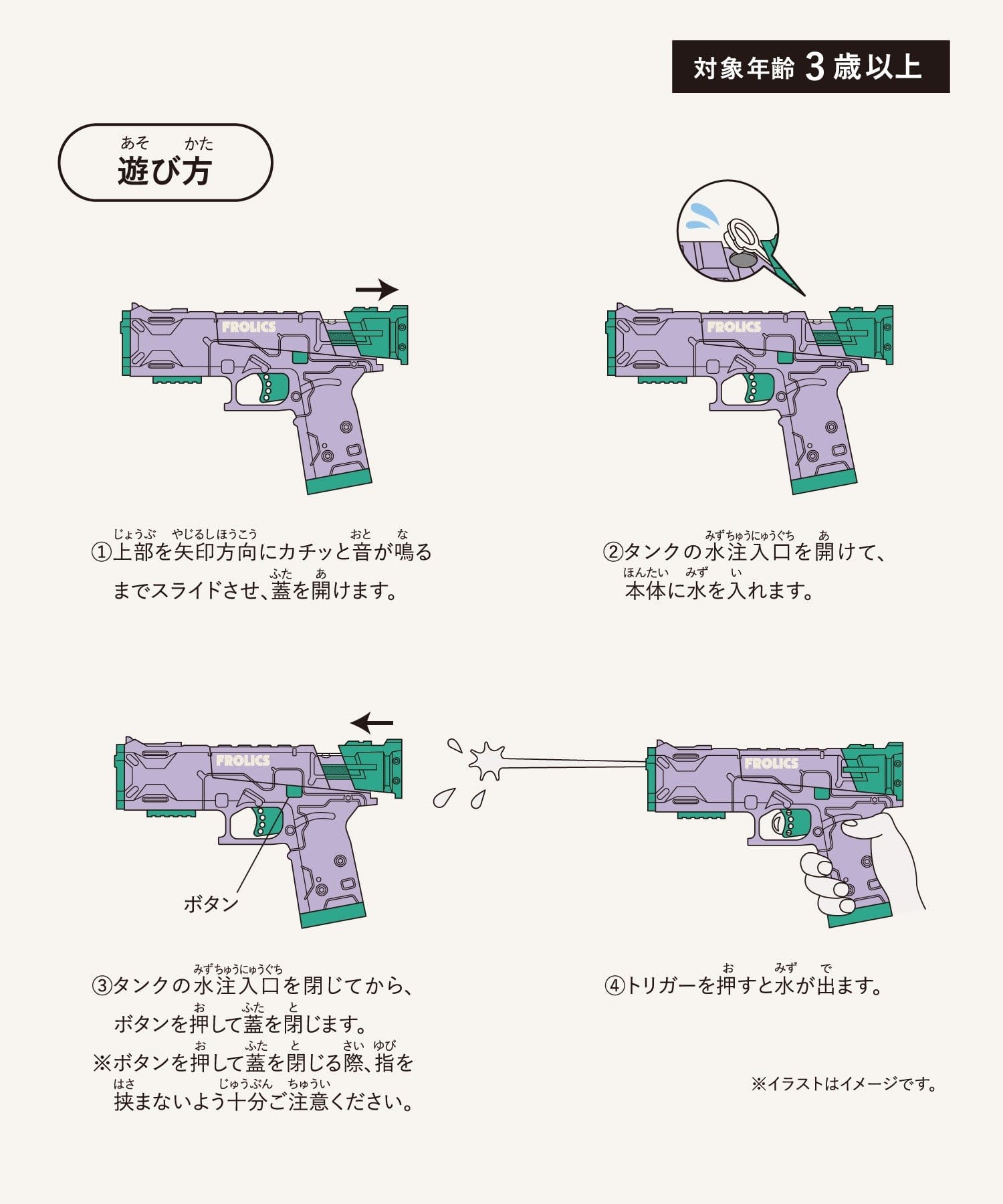 ●遊び終わったらタンク内の水を抜き、本体についた水分を拭き取ってください。タンク内の水を抜いても、ピストルやチューブ内に水が残っている場合があります。中の水が完全に抜けているかご確認の上保管してください。
