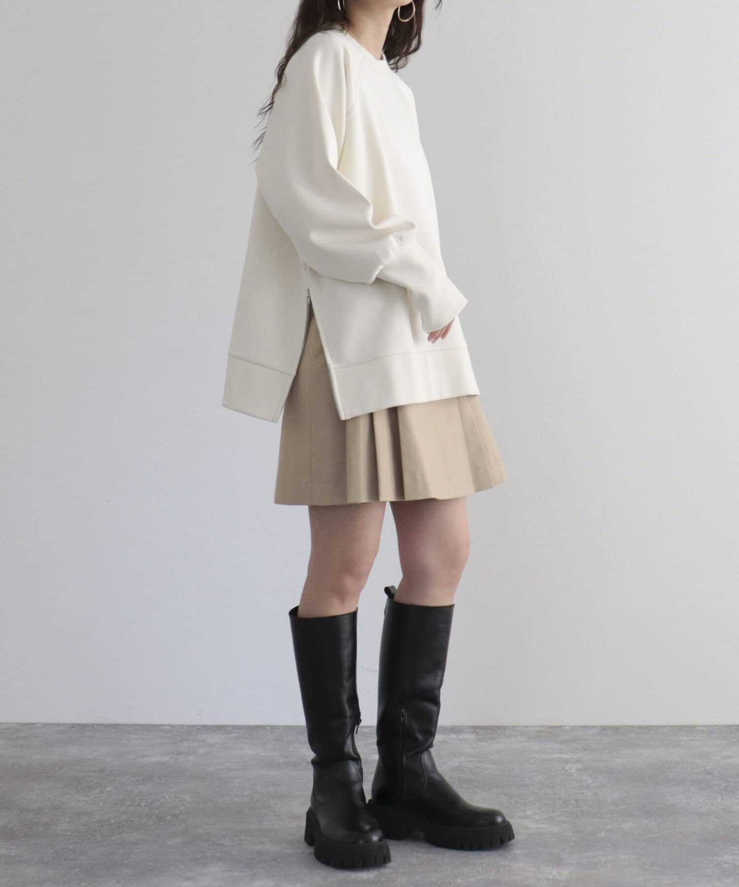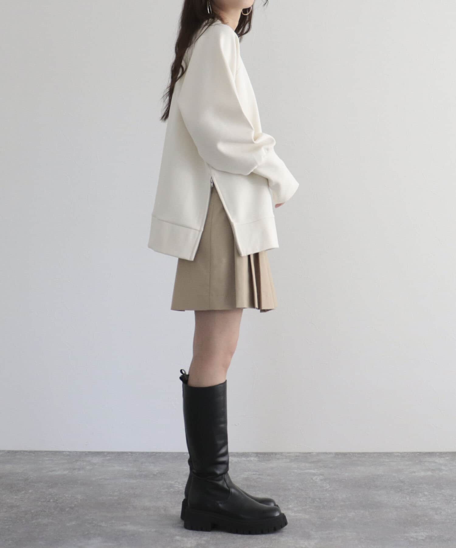 ・ハイウエスト×サイドのジップで腰回りをスッキリと見せてくれ、着脱も簡単でデイリーに履きたくなる着心地