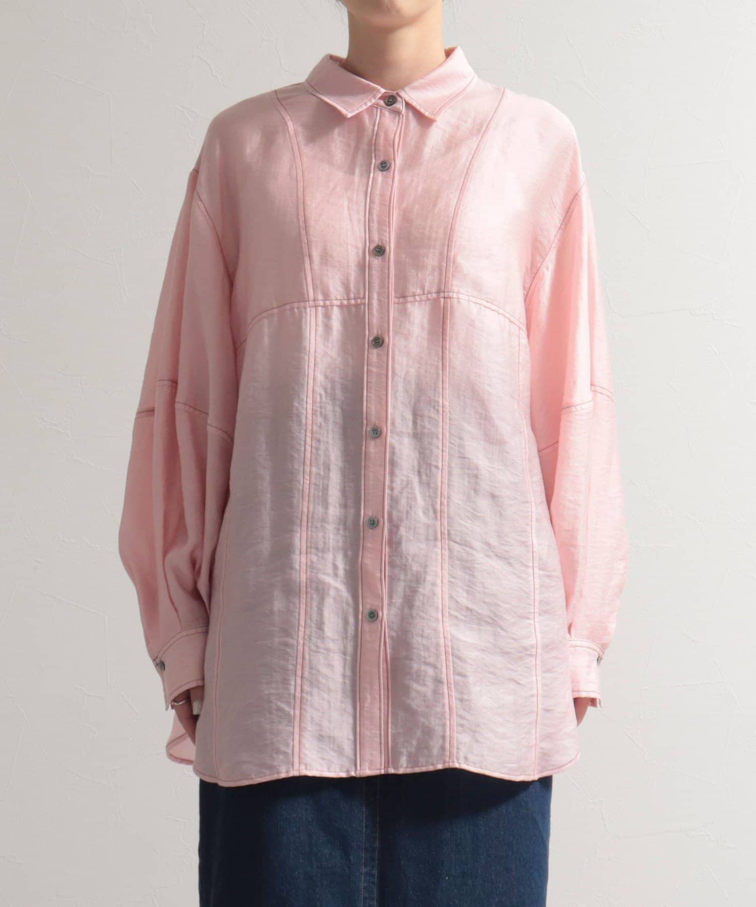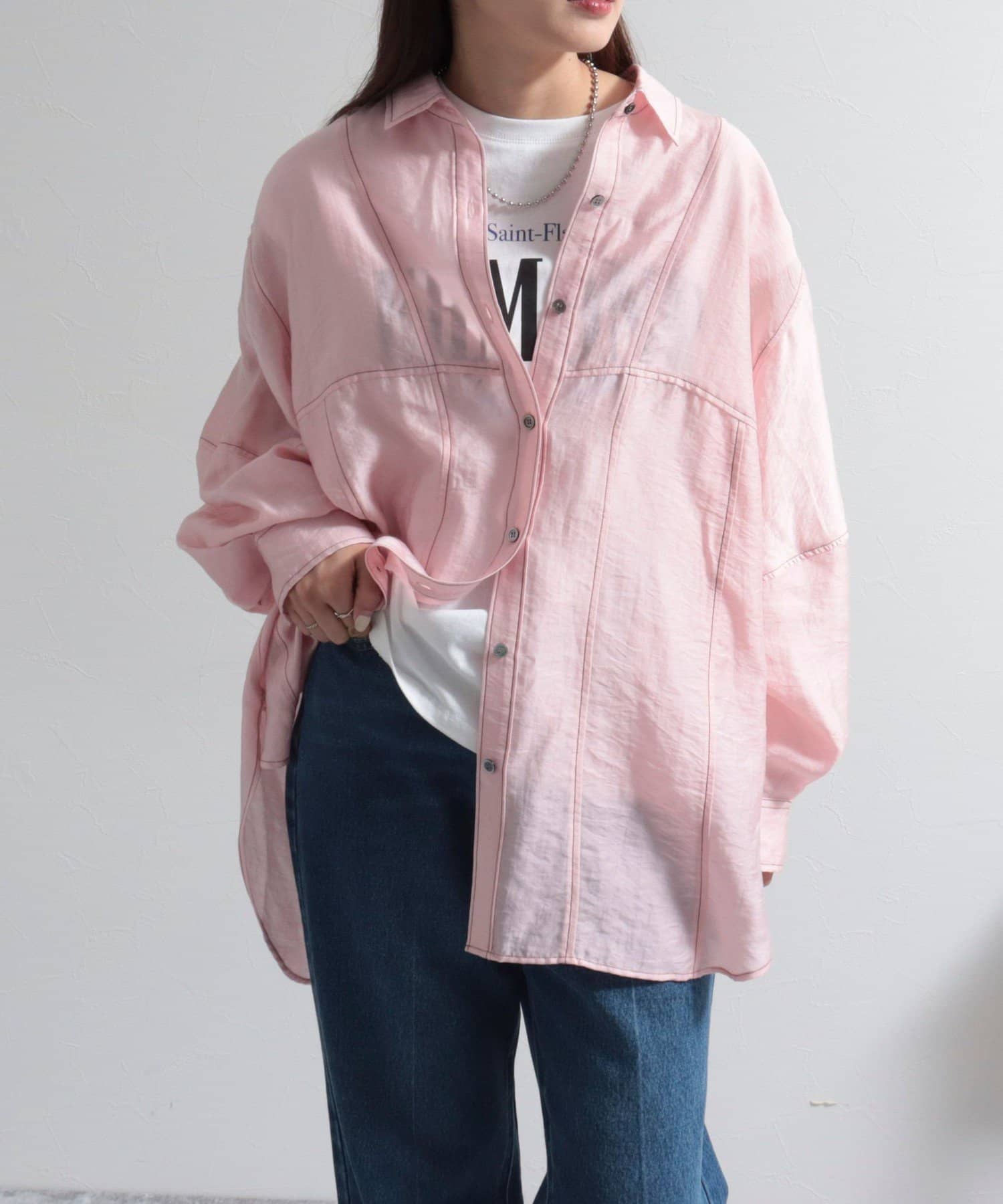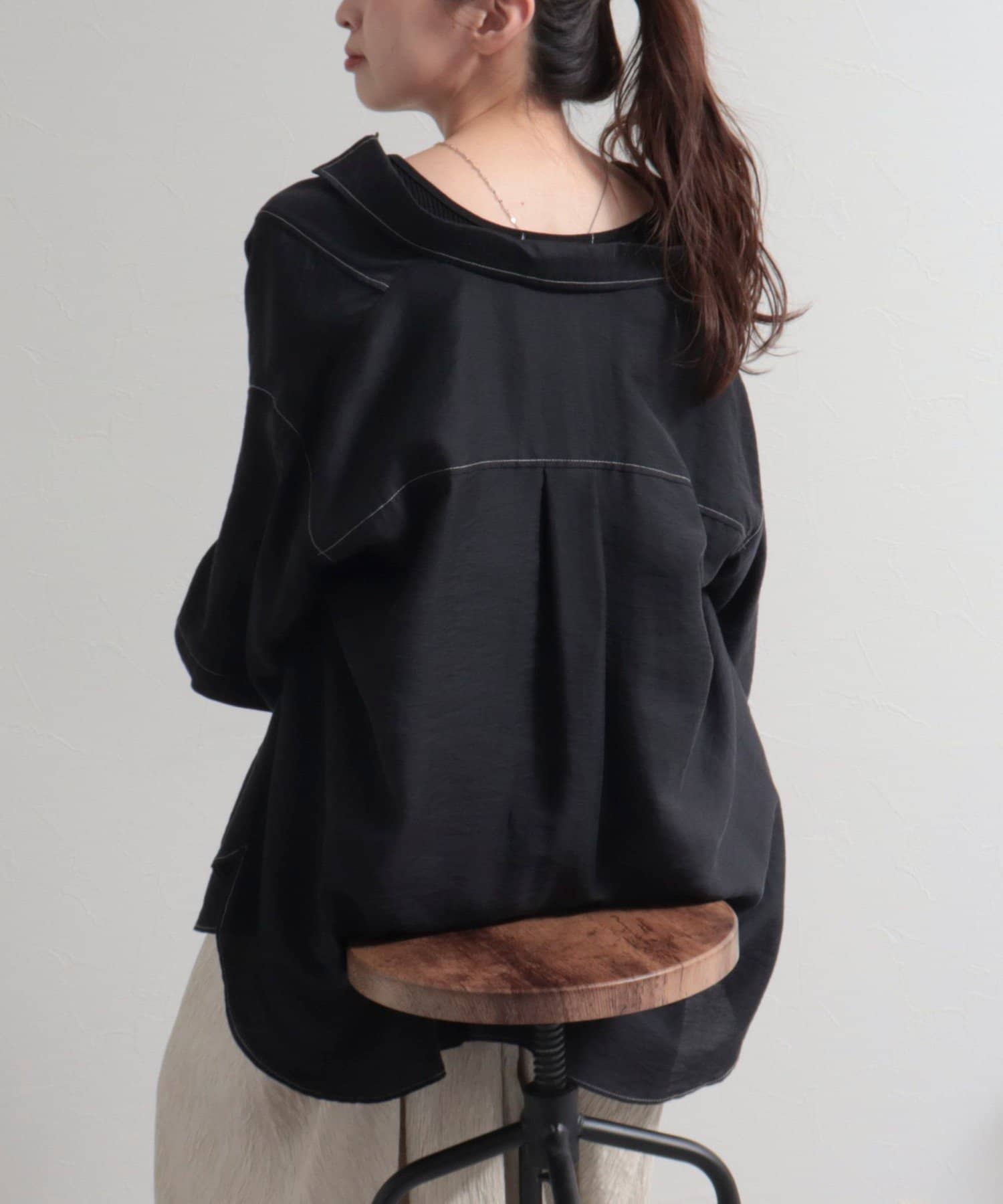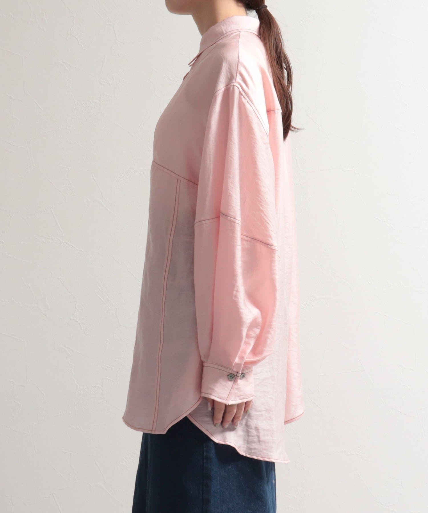 ・少し光沢のあるシアー素材に配色のステッチを施したカジュアルかつ上品な印象のシャツ
