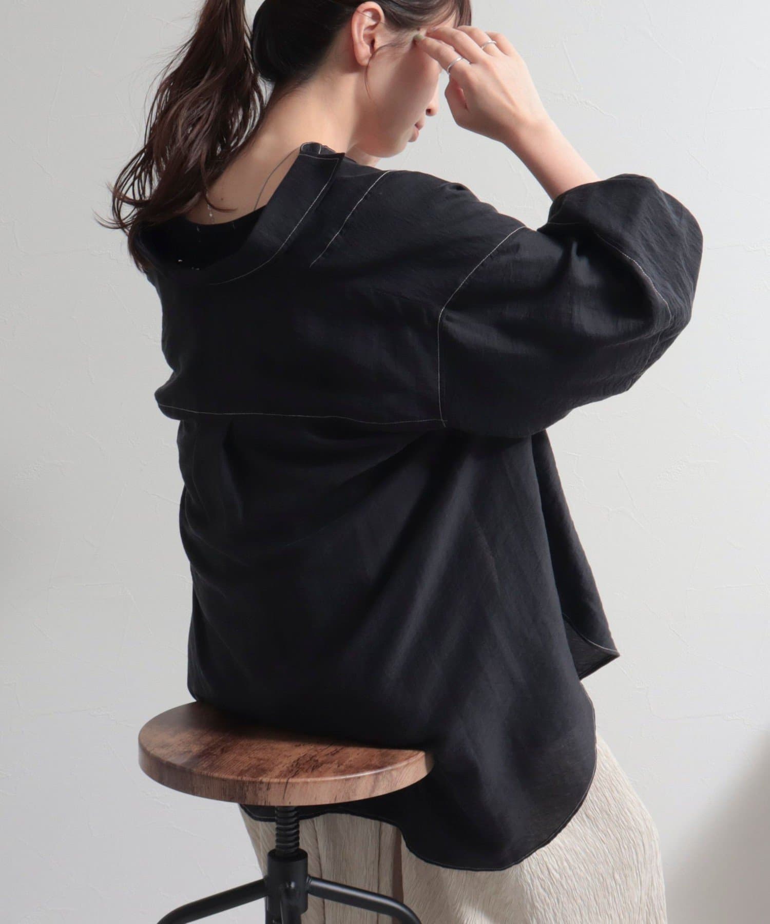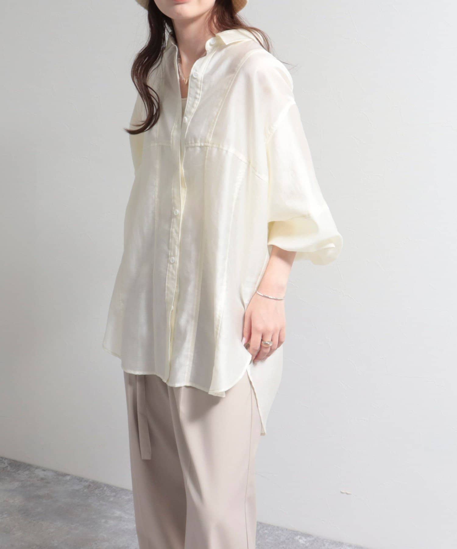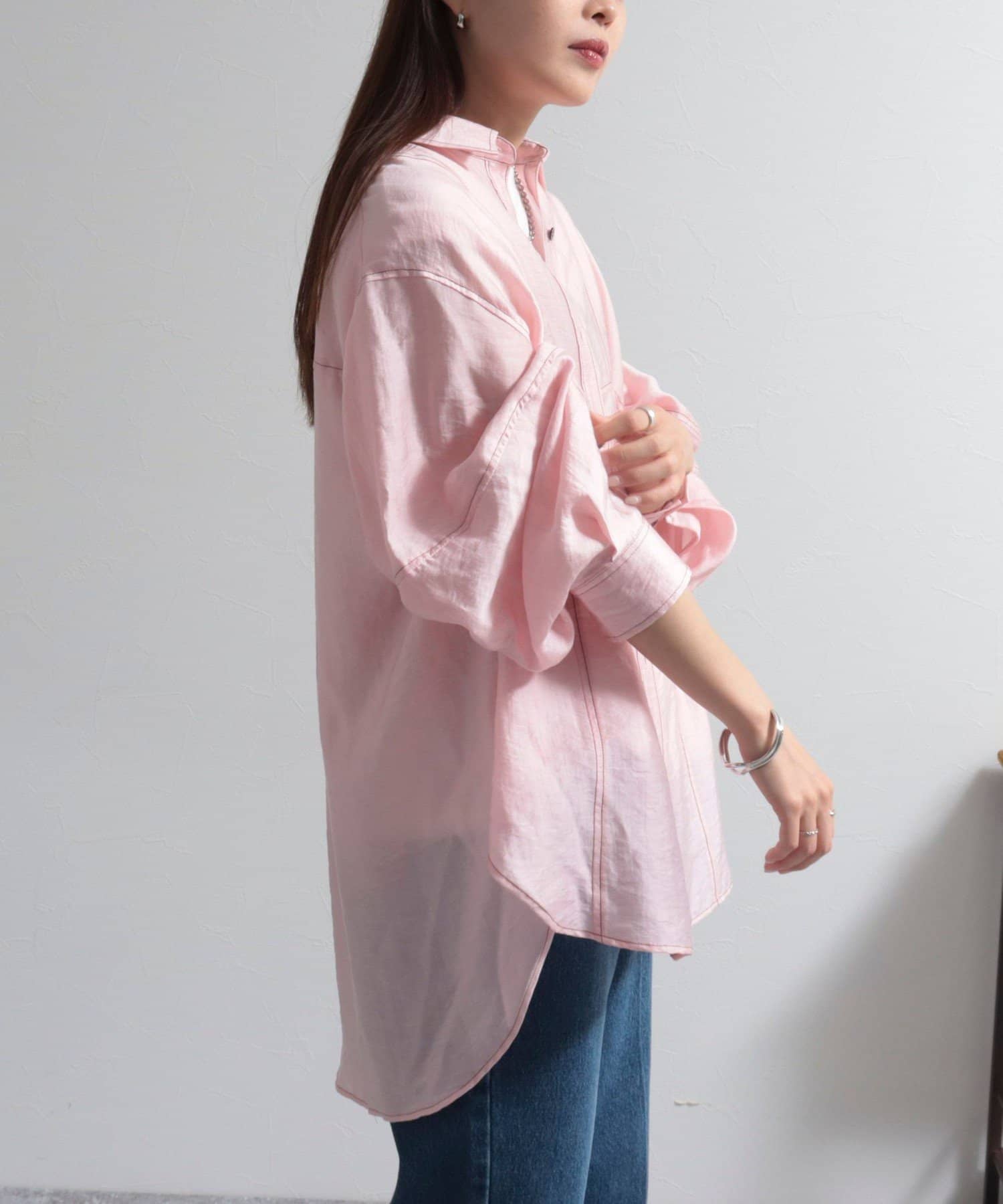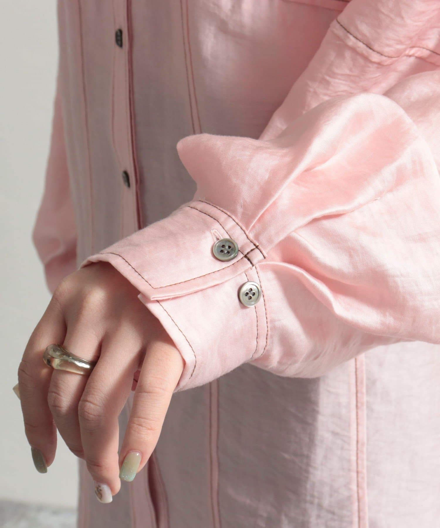 ・少し光沢のあるシアー素材に配色のステッチを施したカジュアルかつ上品な印象のシャツ