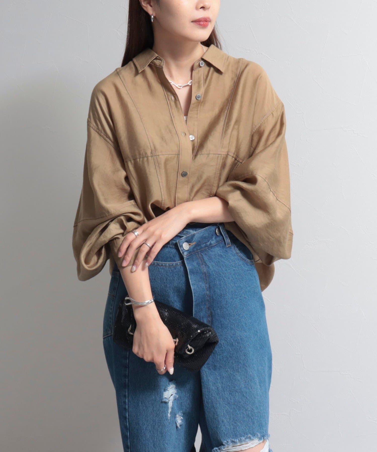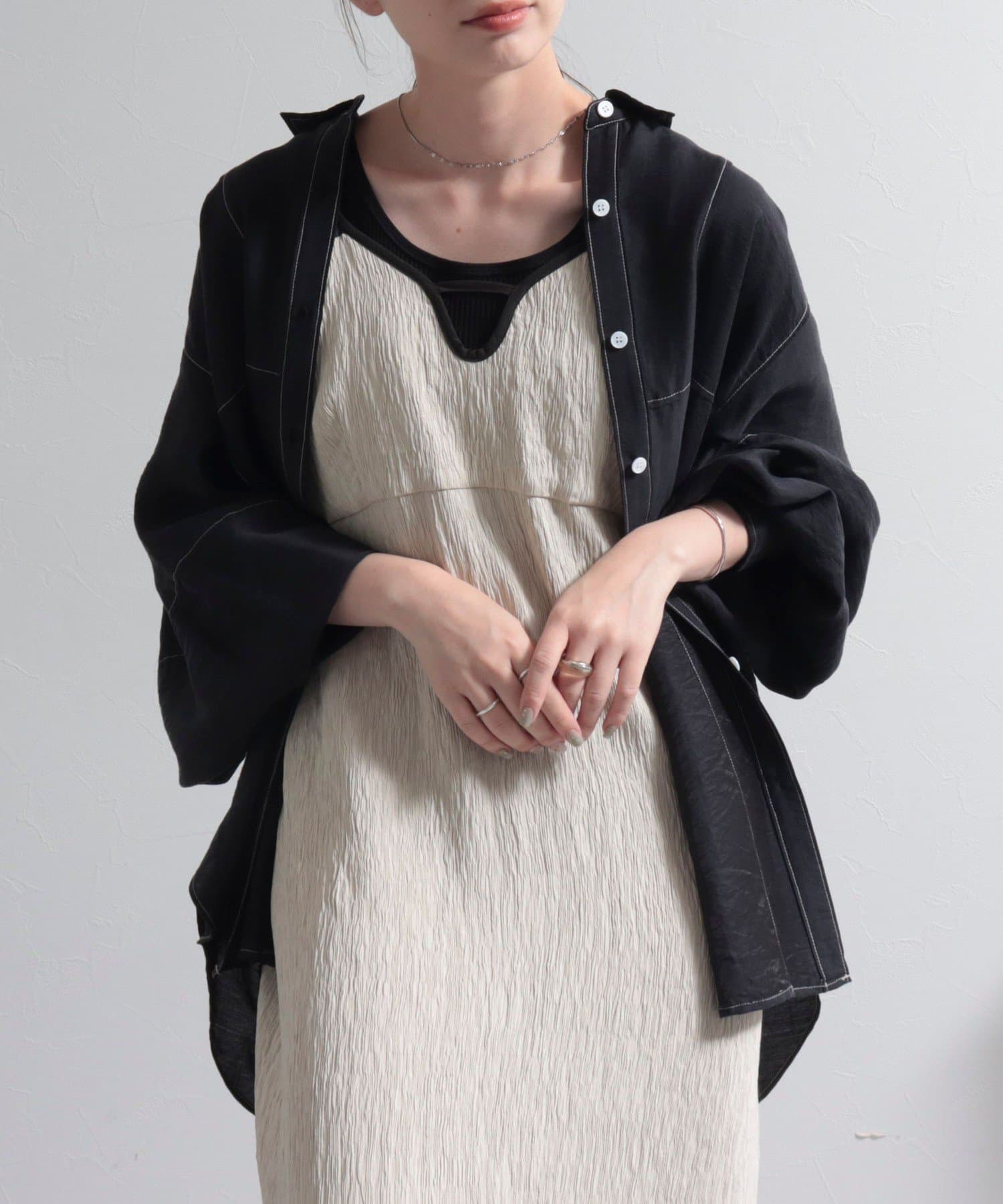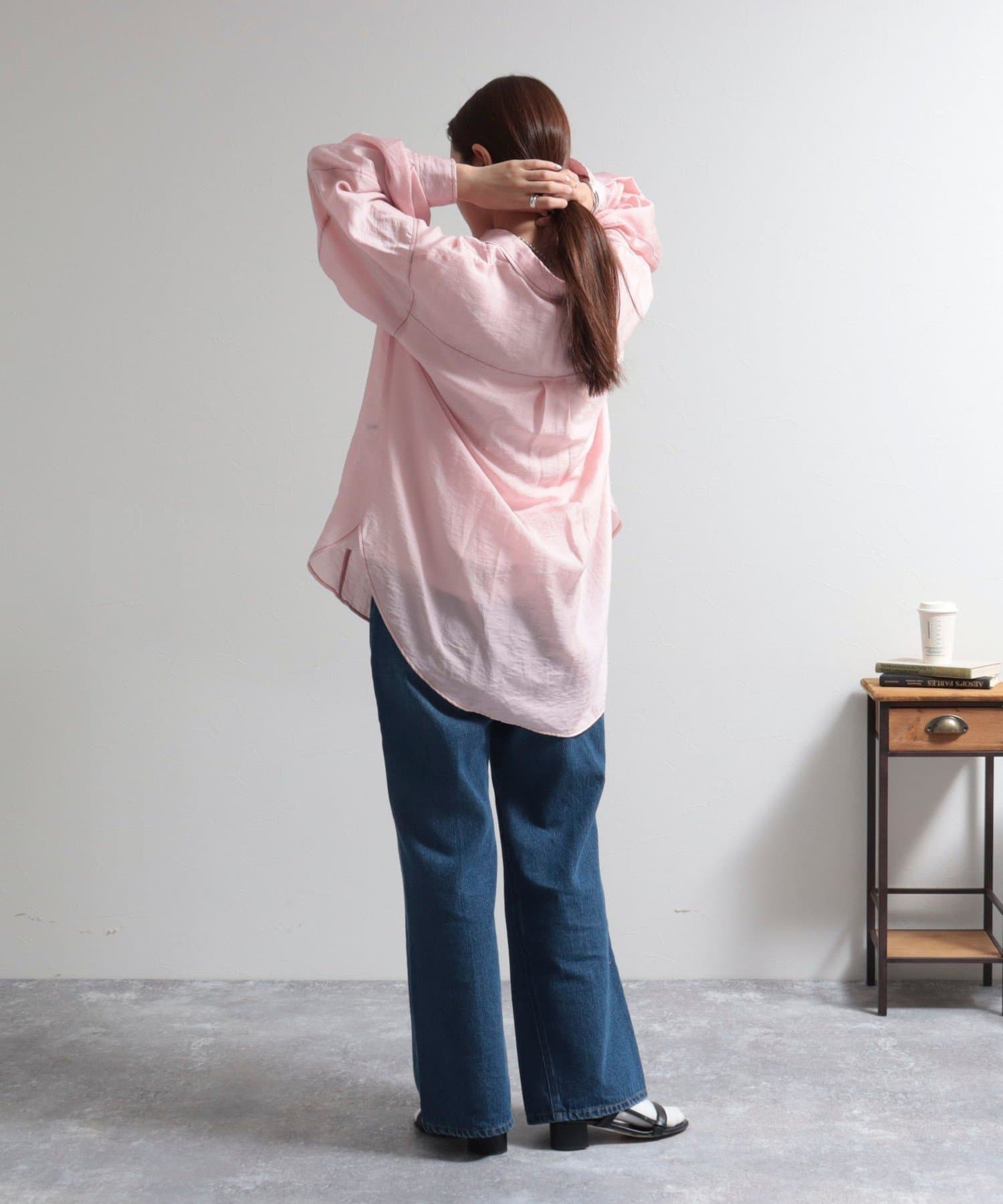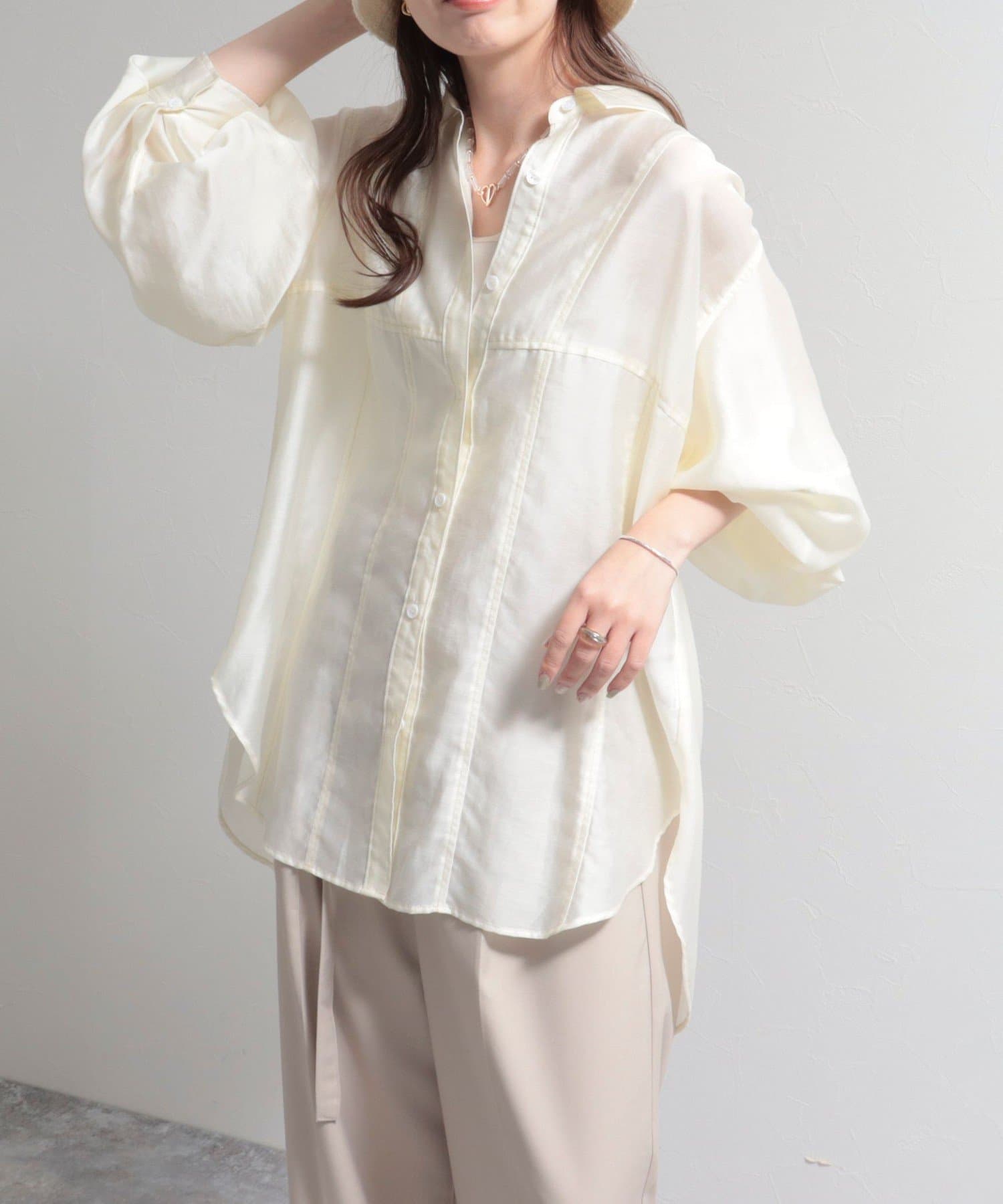・少し光沢のあるシアー素材に配色のステッチを施したカジュアルかつ上品な印象のシャツ