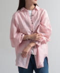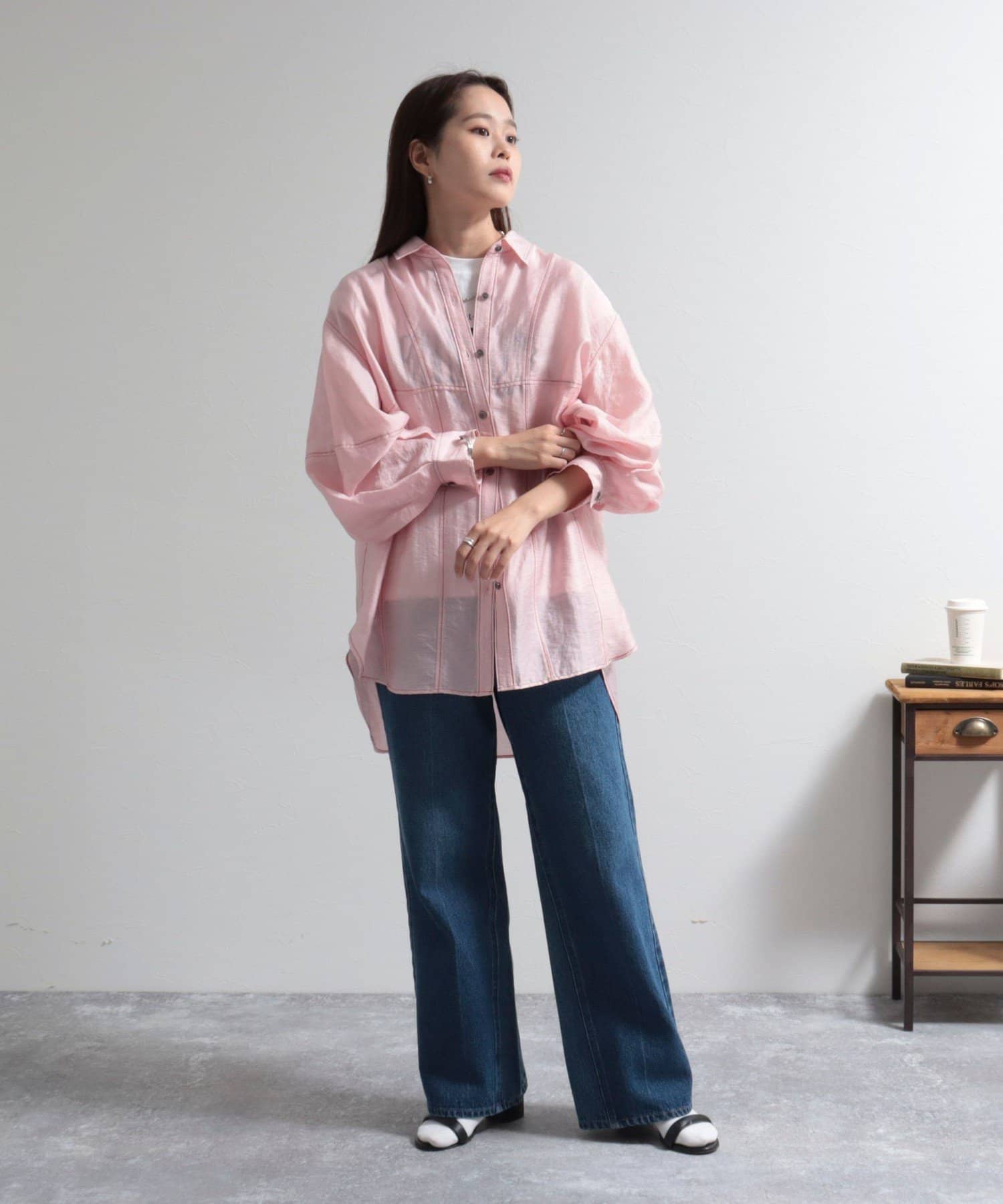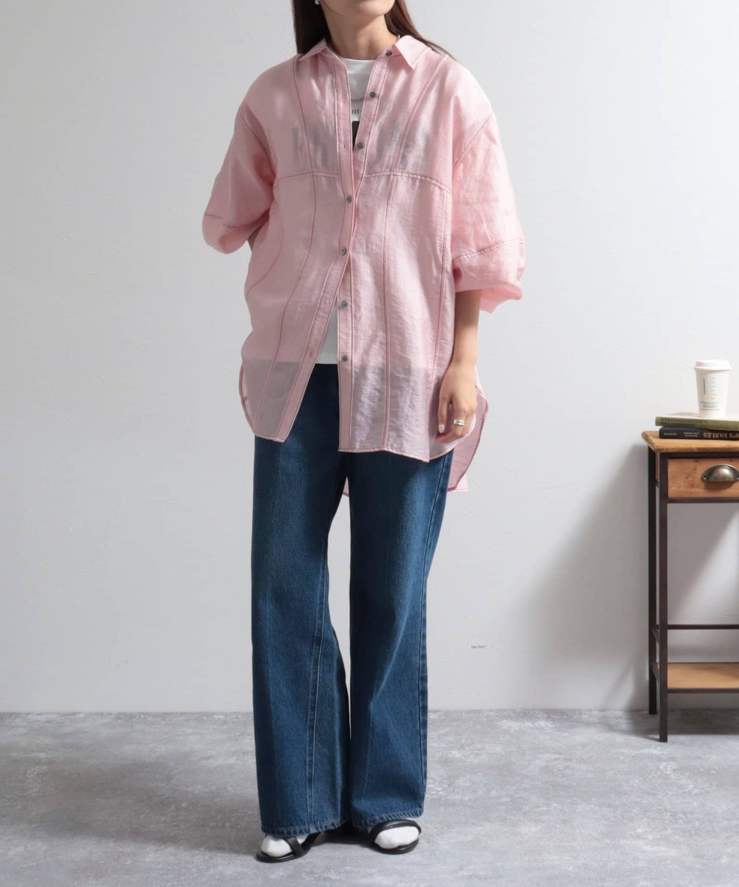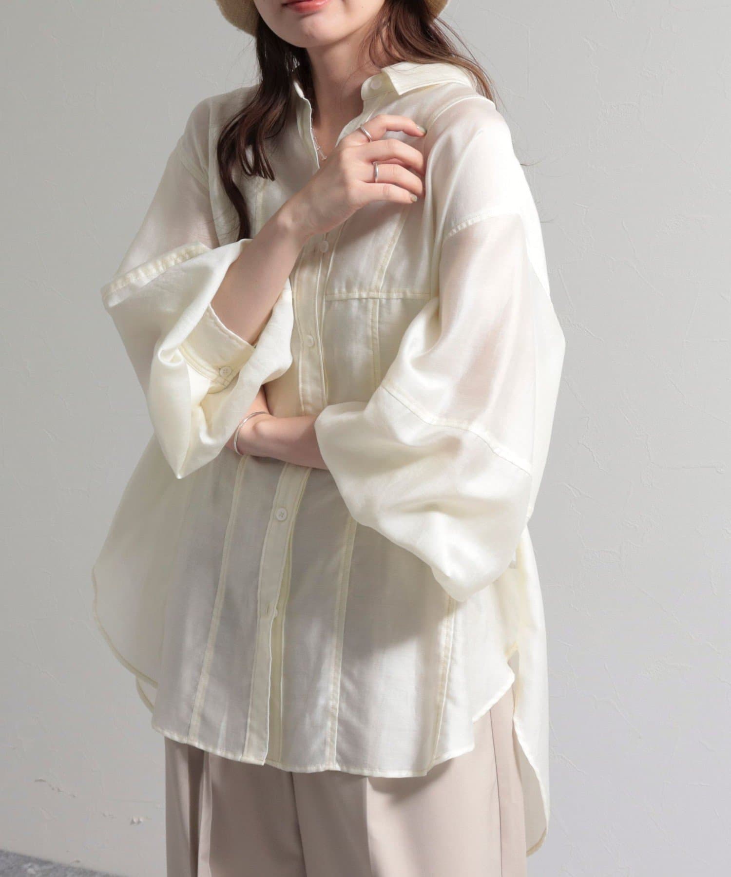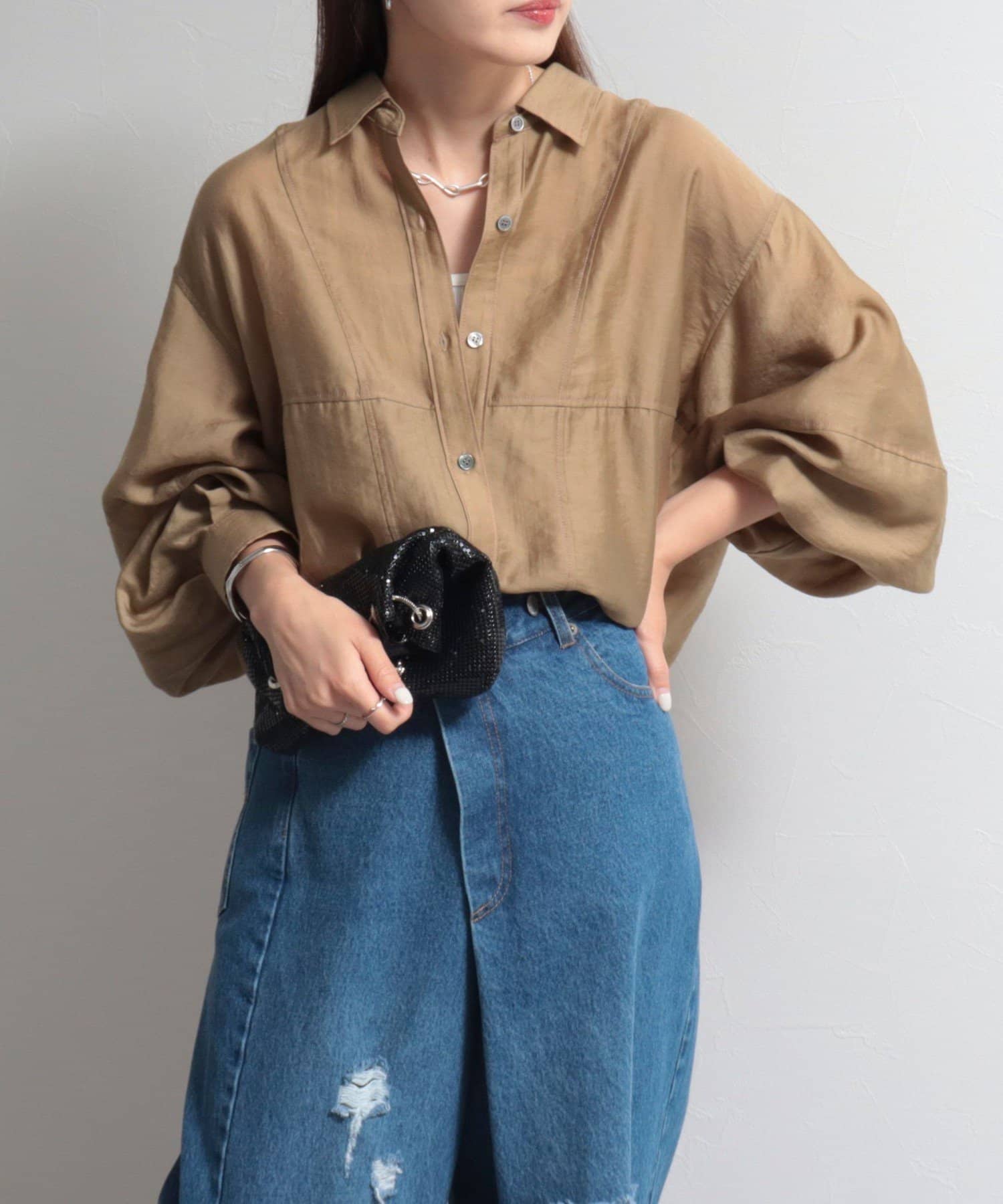 ・少し光沢のあるシアー素材に配色のステッチを施したカジュアルかつ上品な印象のシャツ