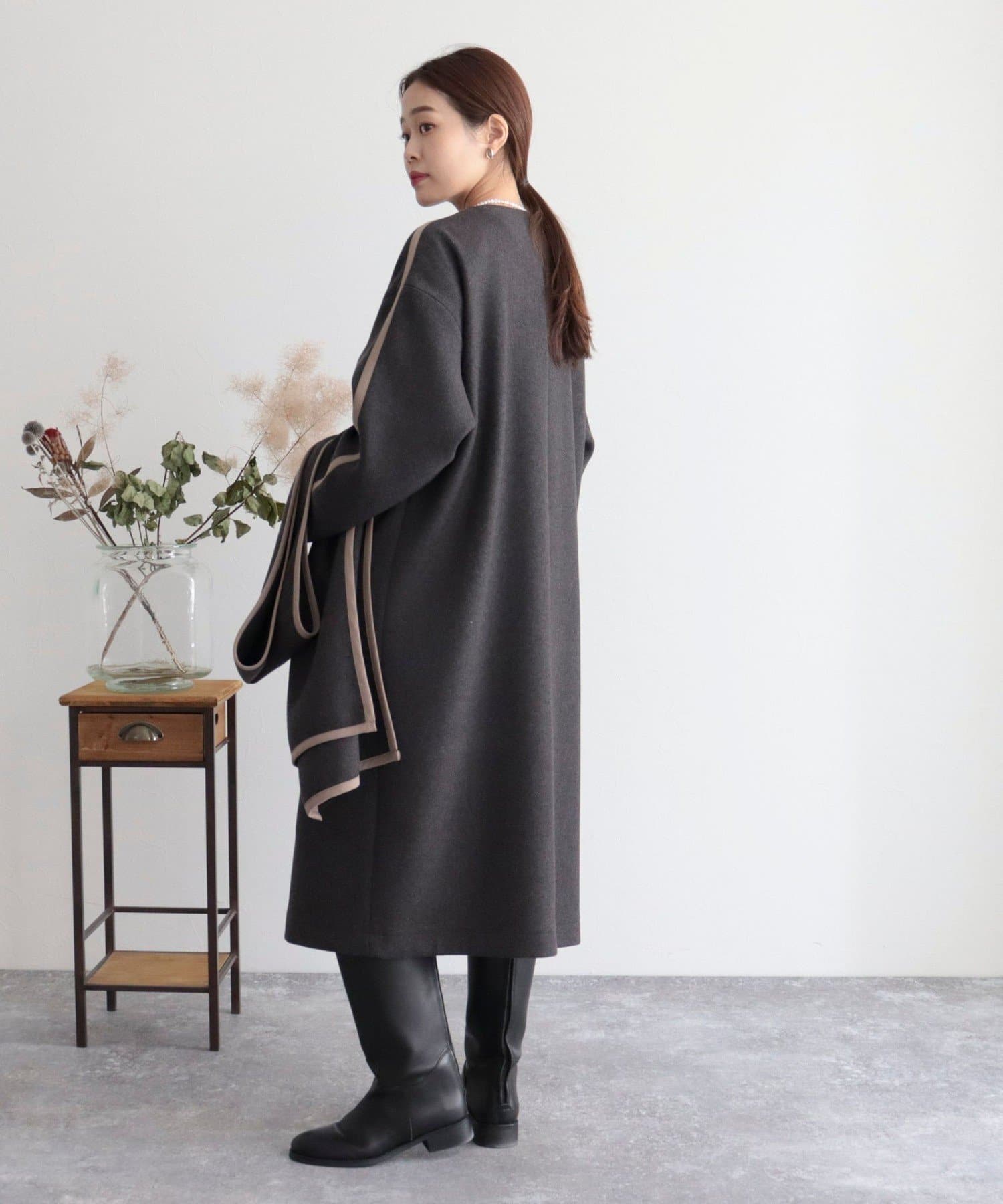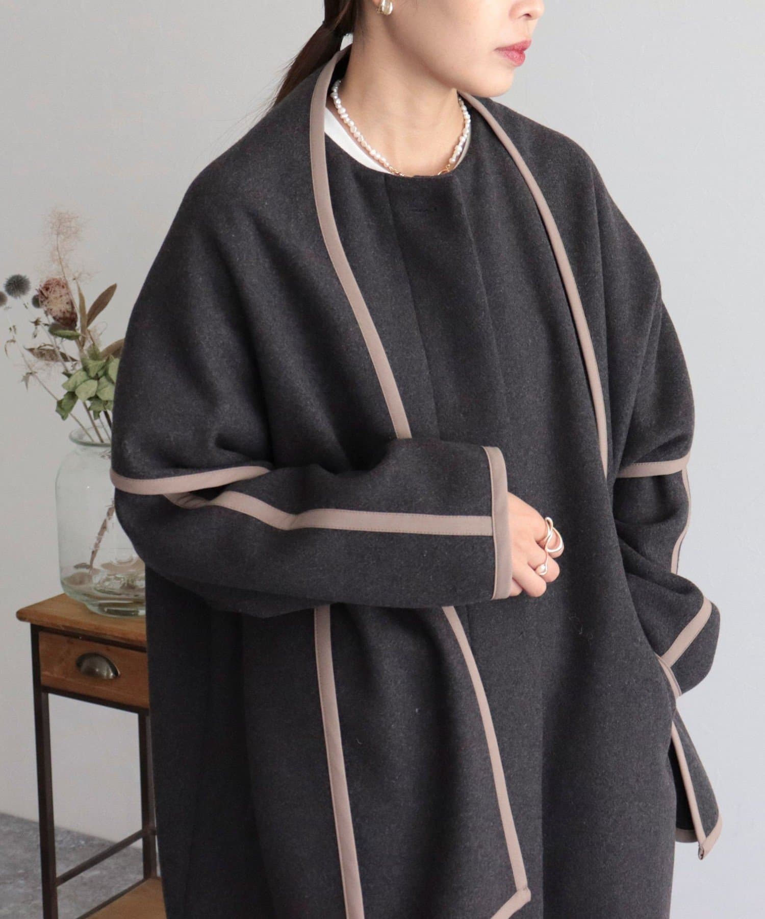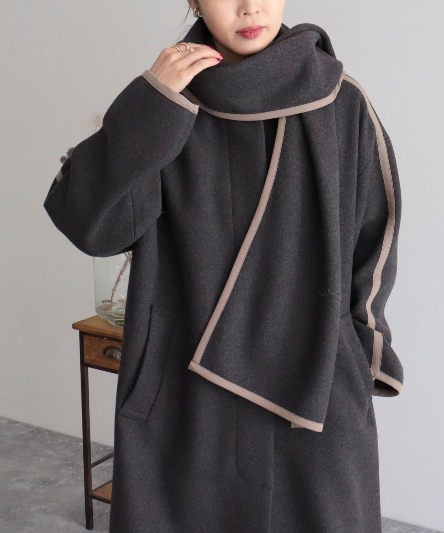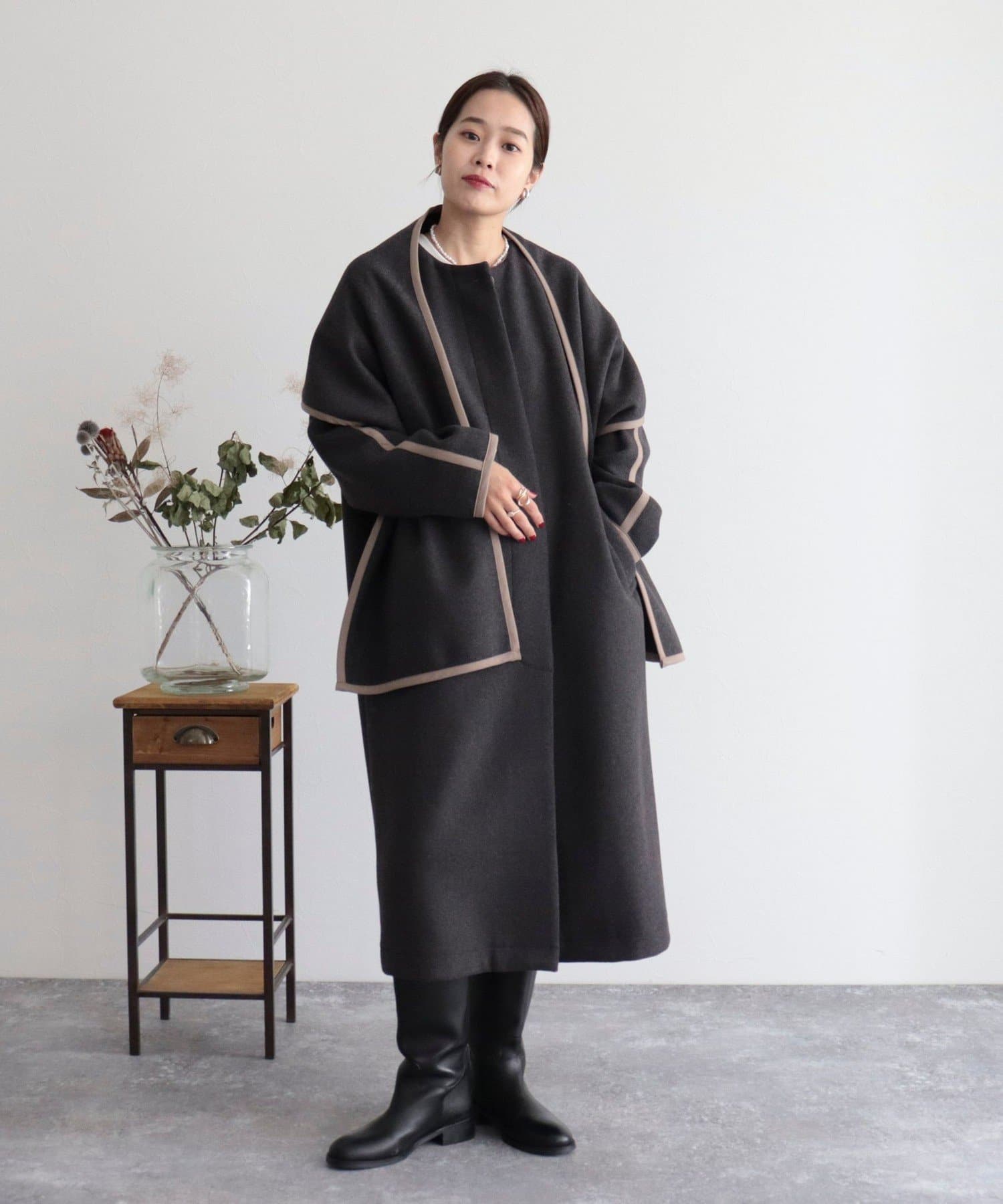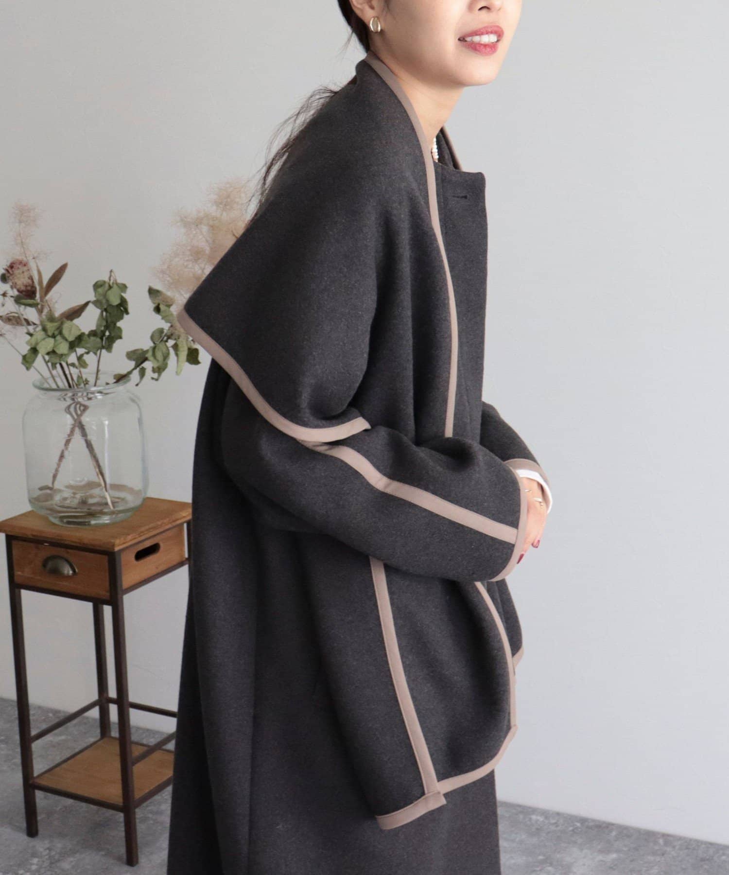 配色パイピングが今年らしい ストールとノーカラーコートのセットアイテム