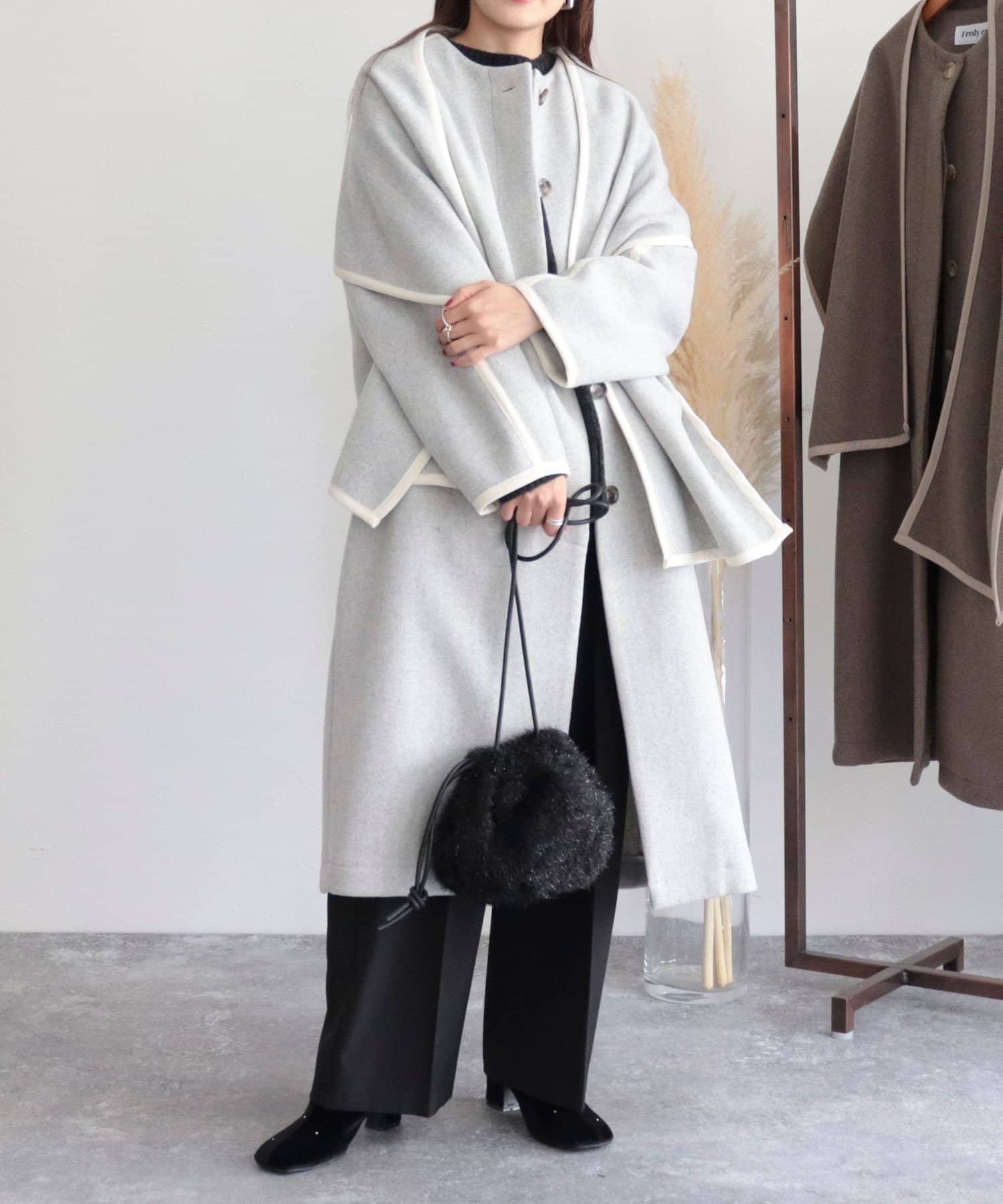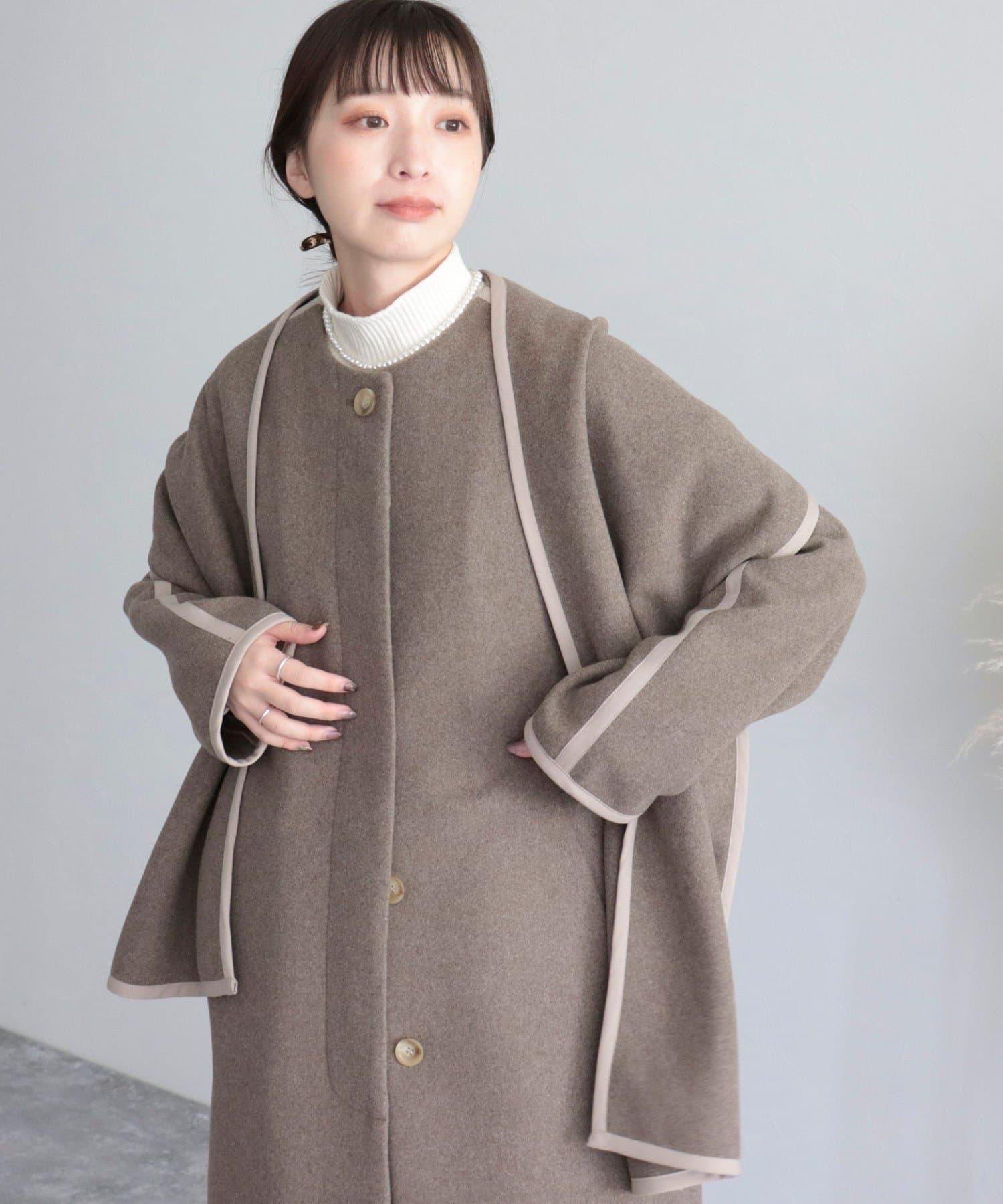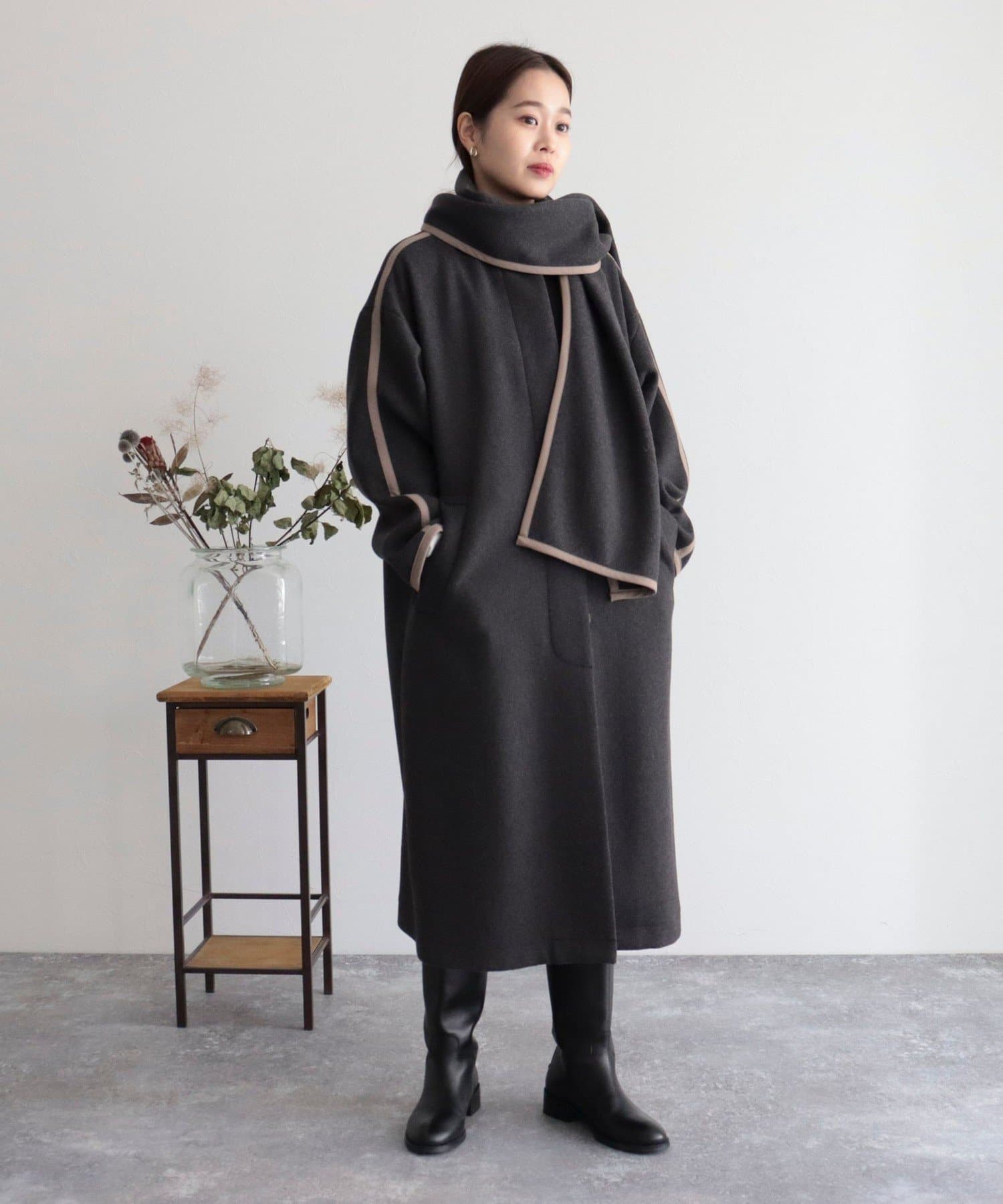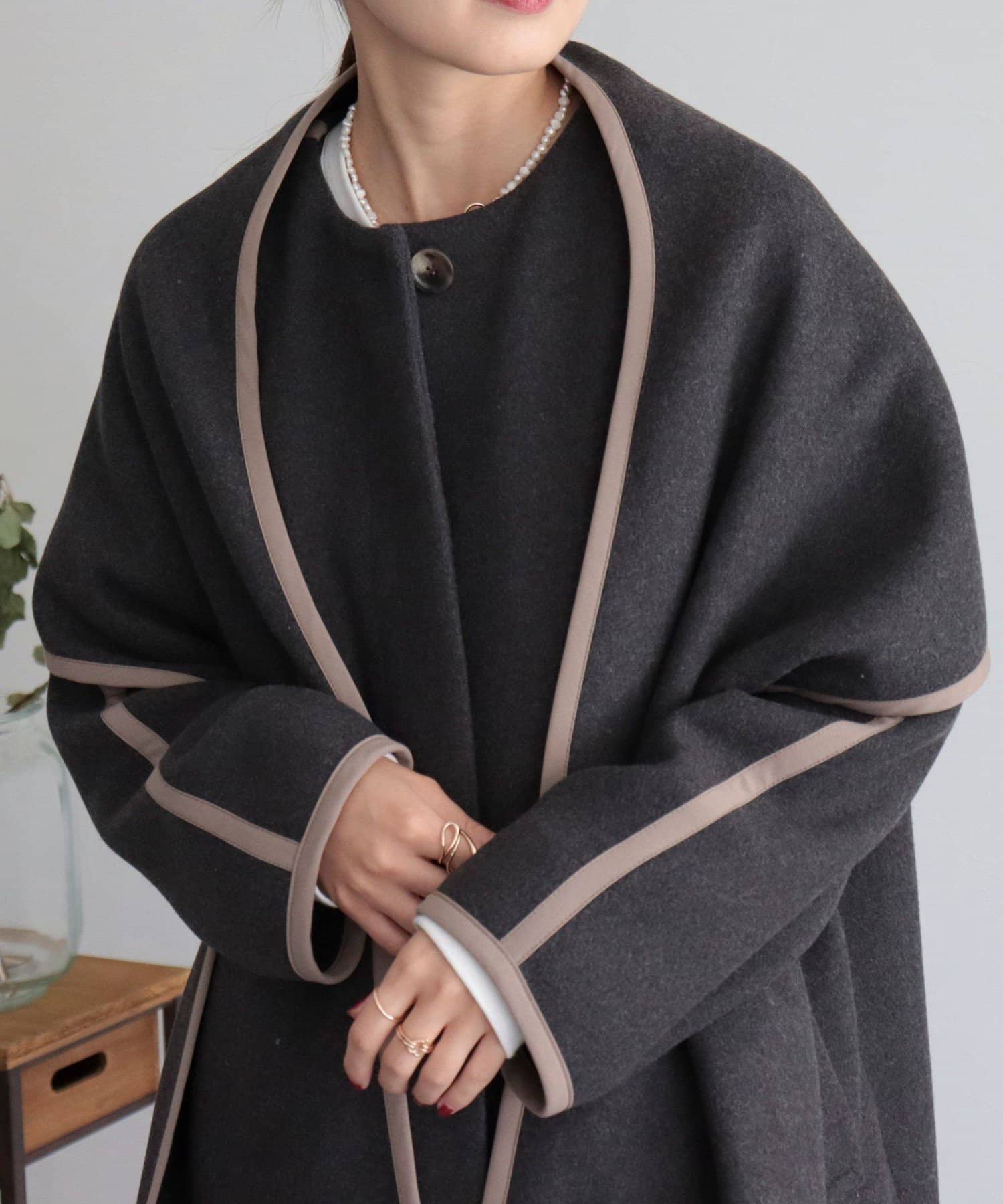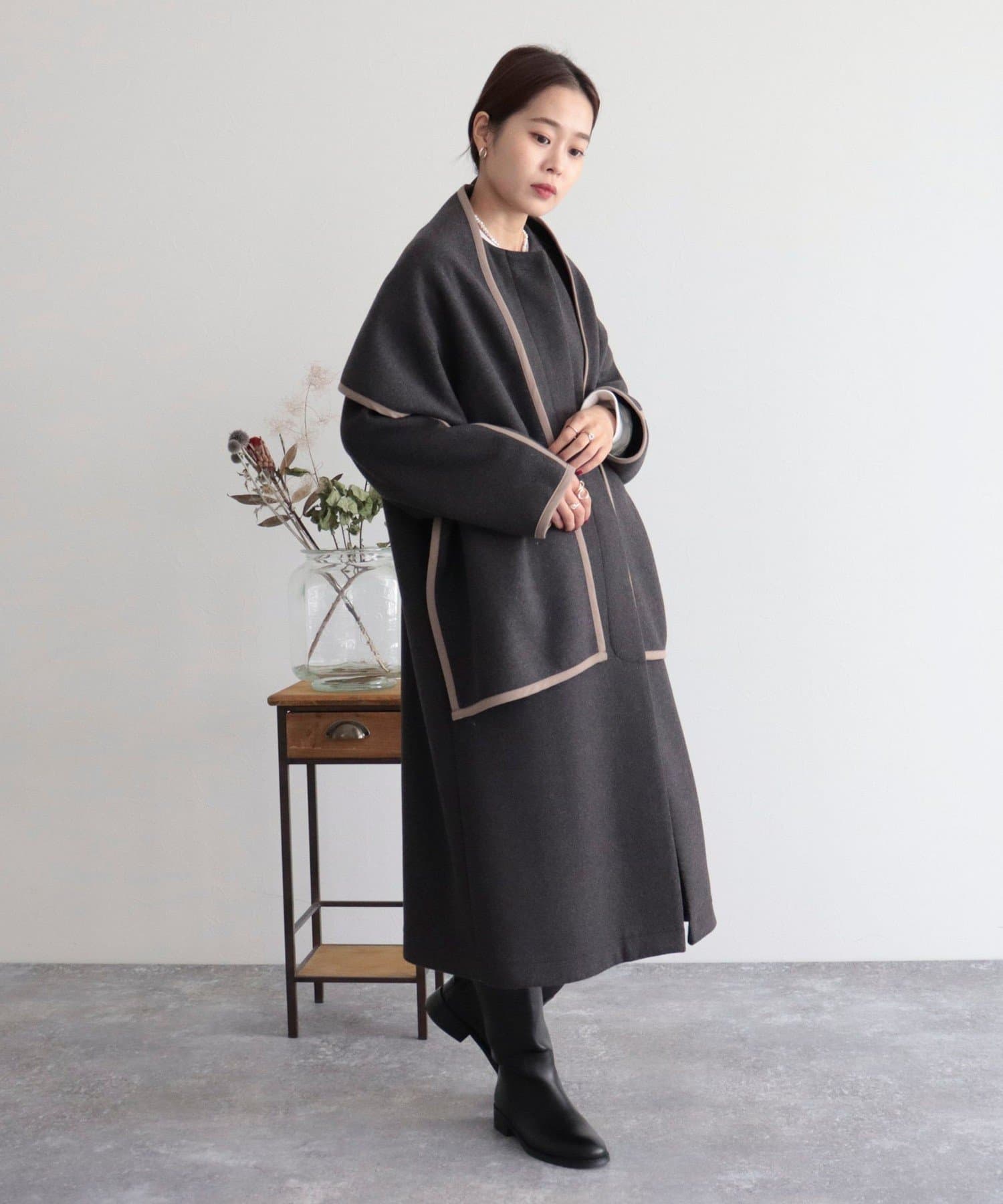 配色パイピングが今年らしい ストールとノーカラーコートのセットアイテム