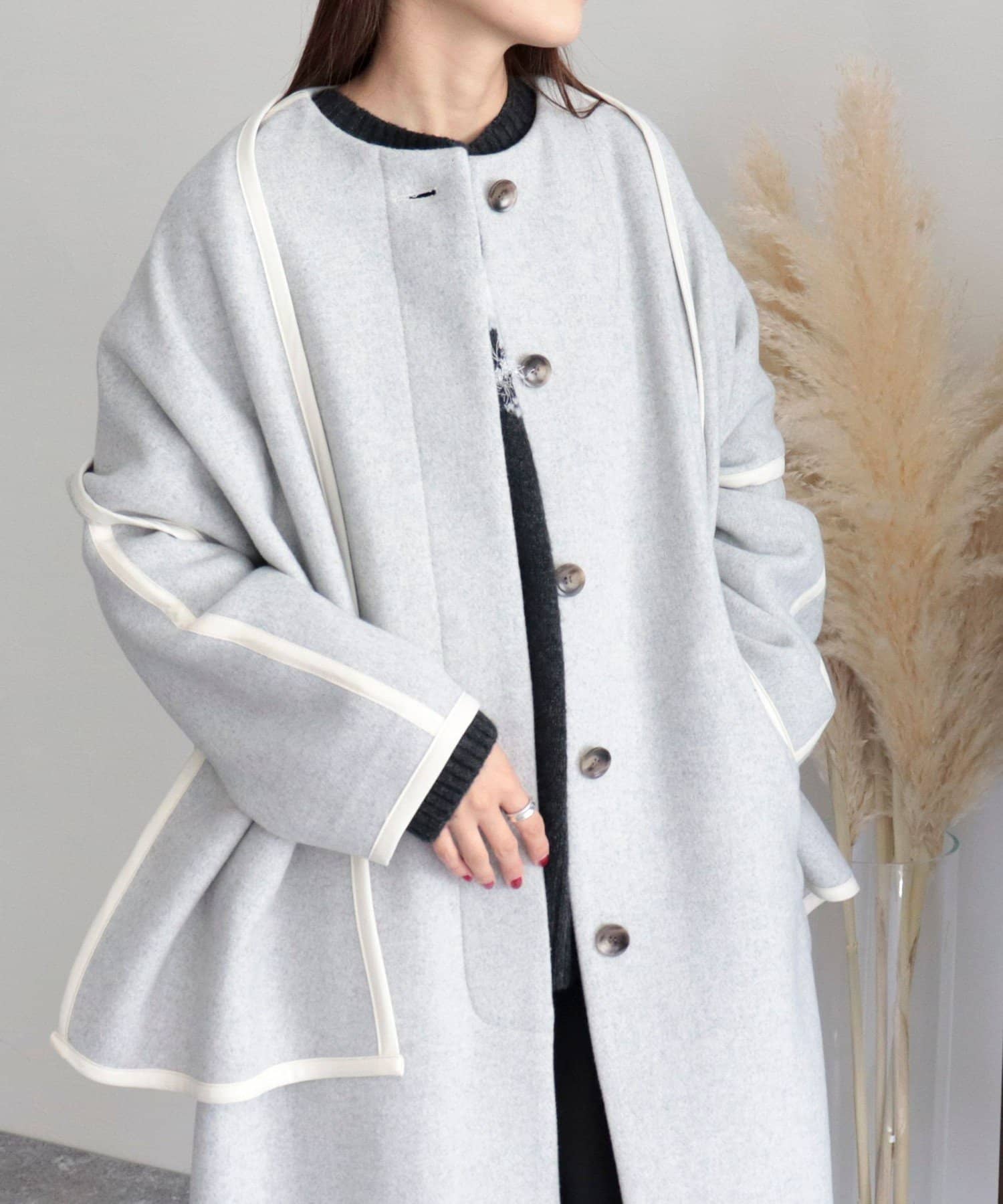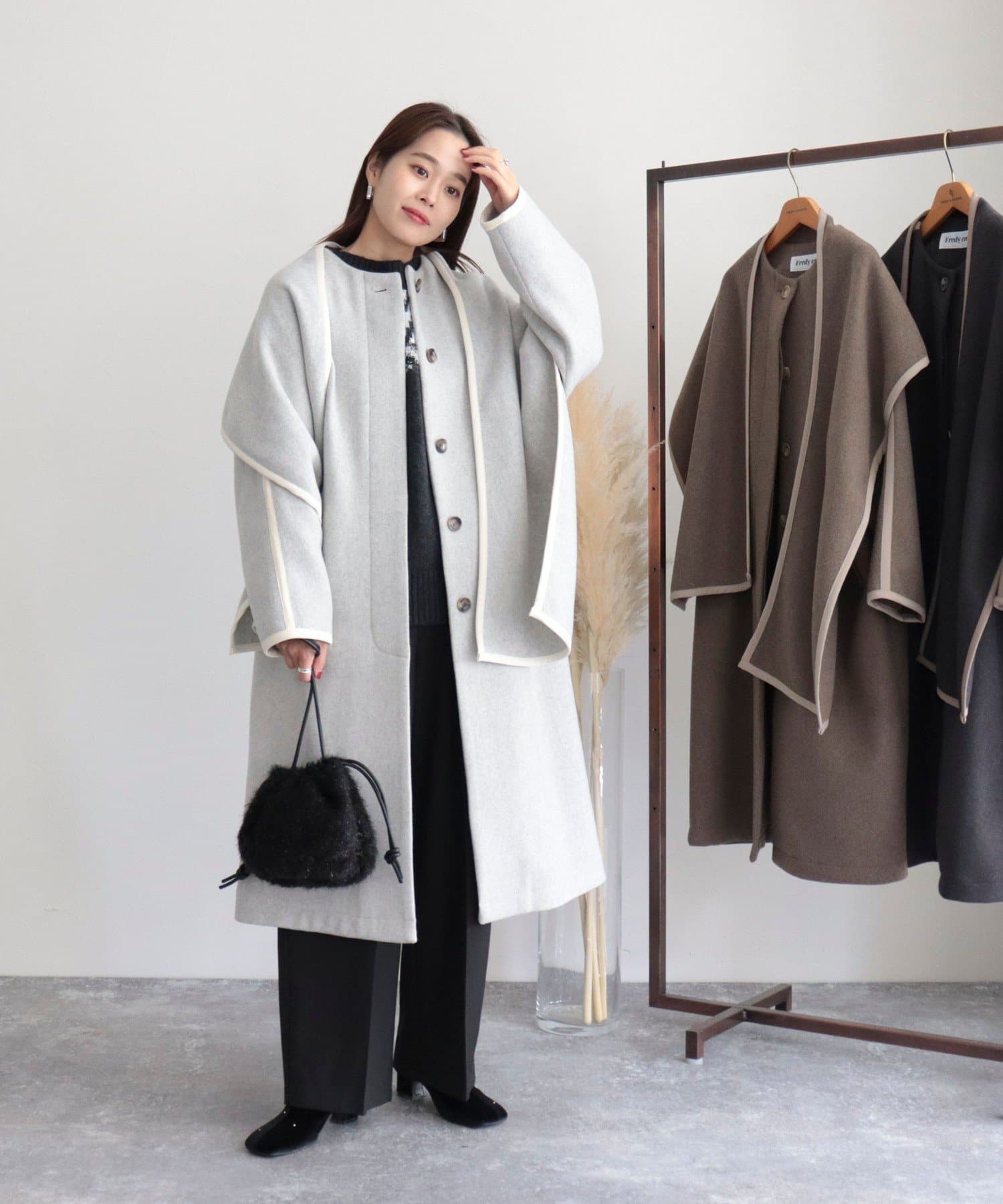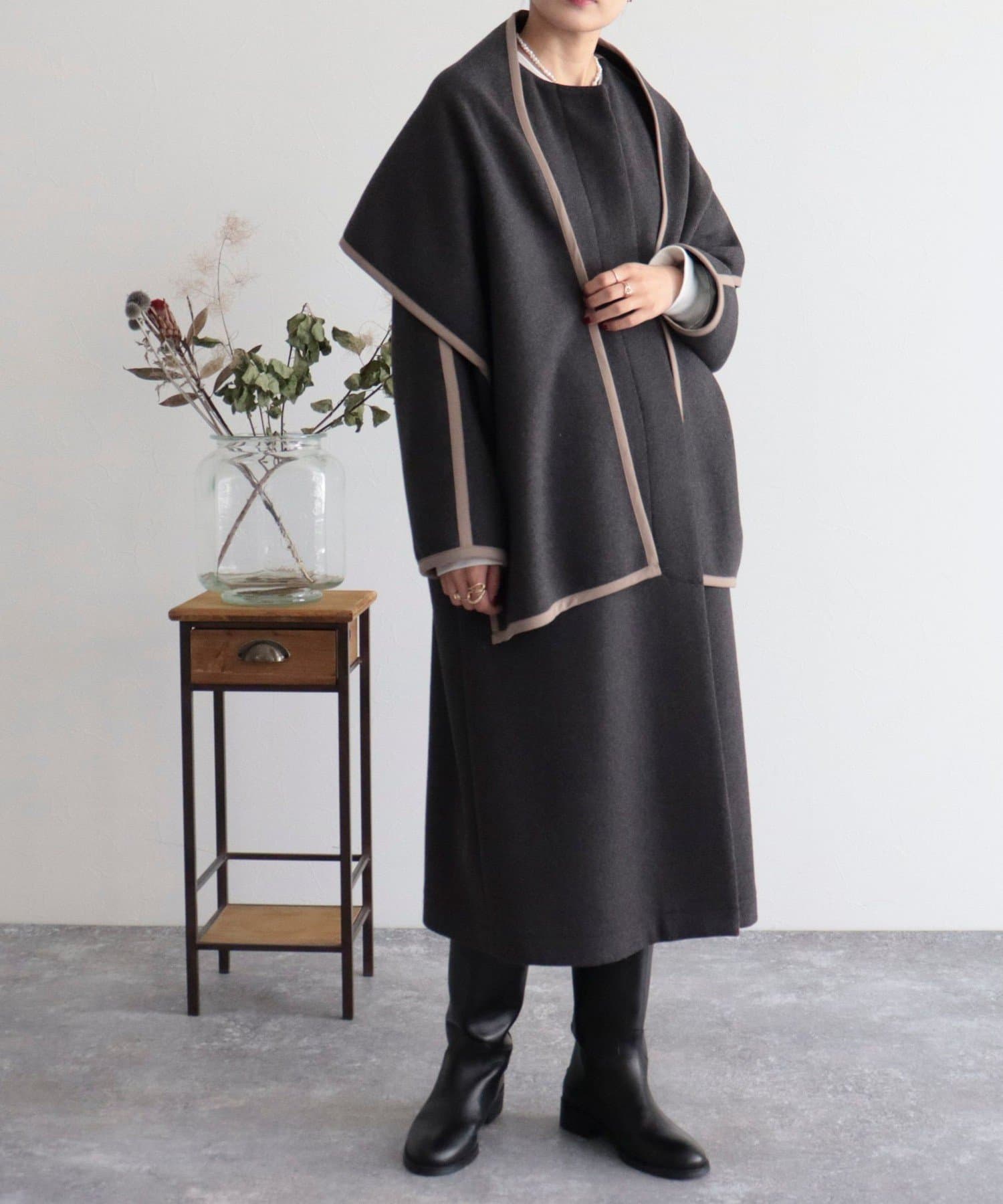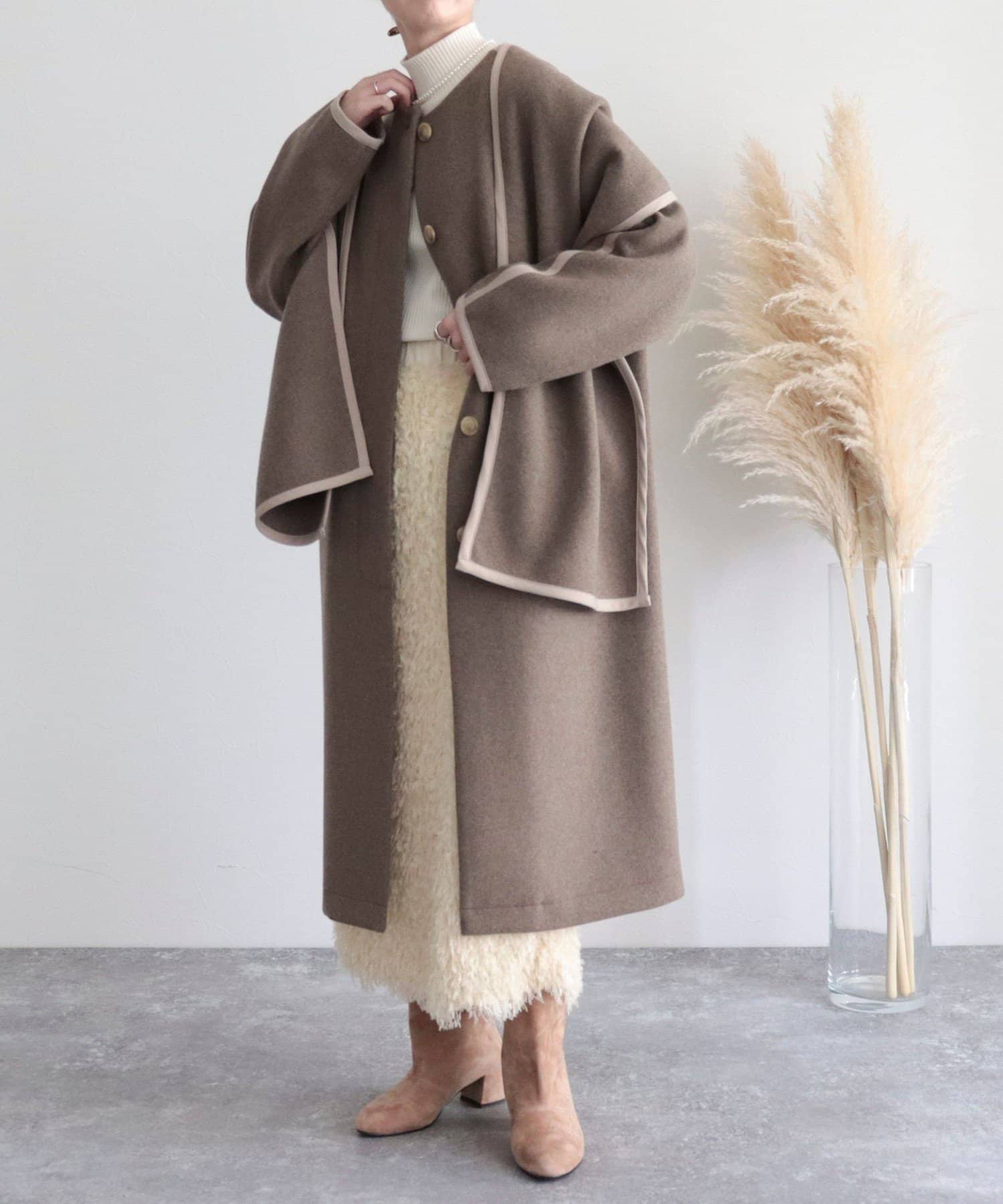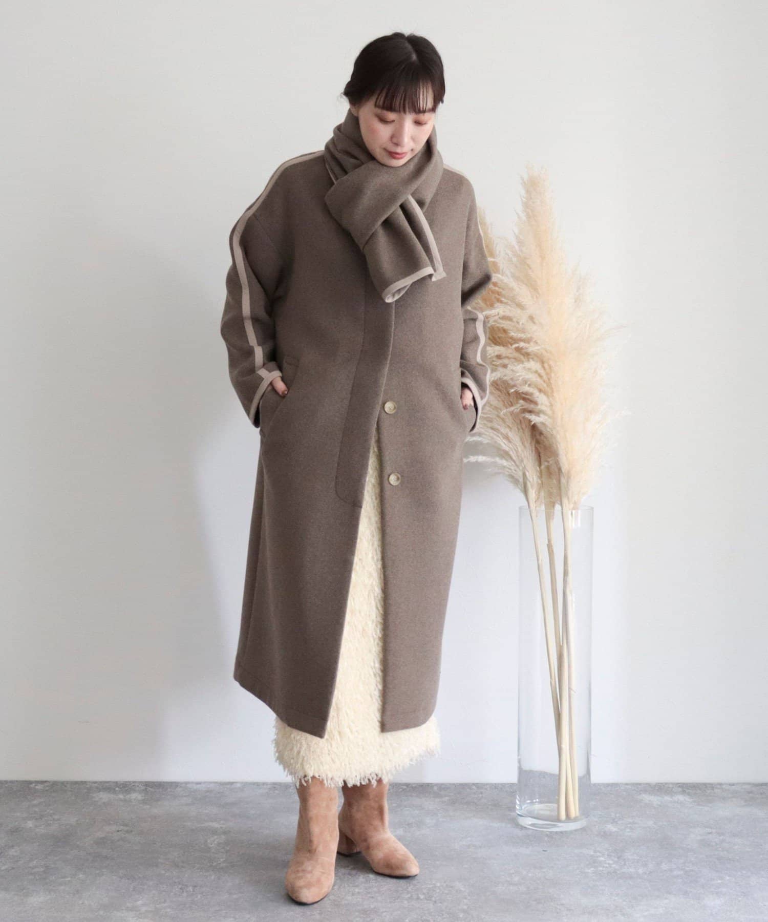 配色パイピングが今年らしい ストールとノーカラーコートのセットアイテム
