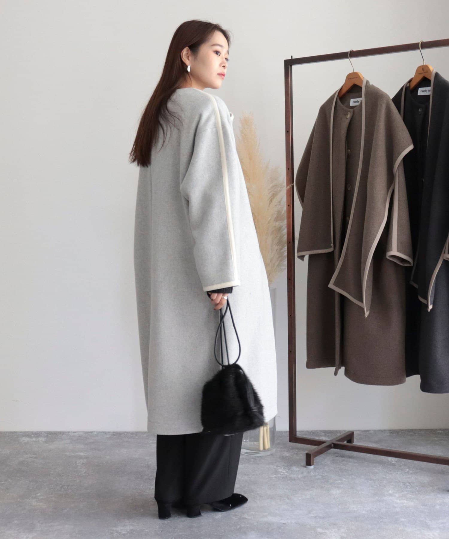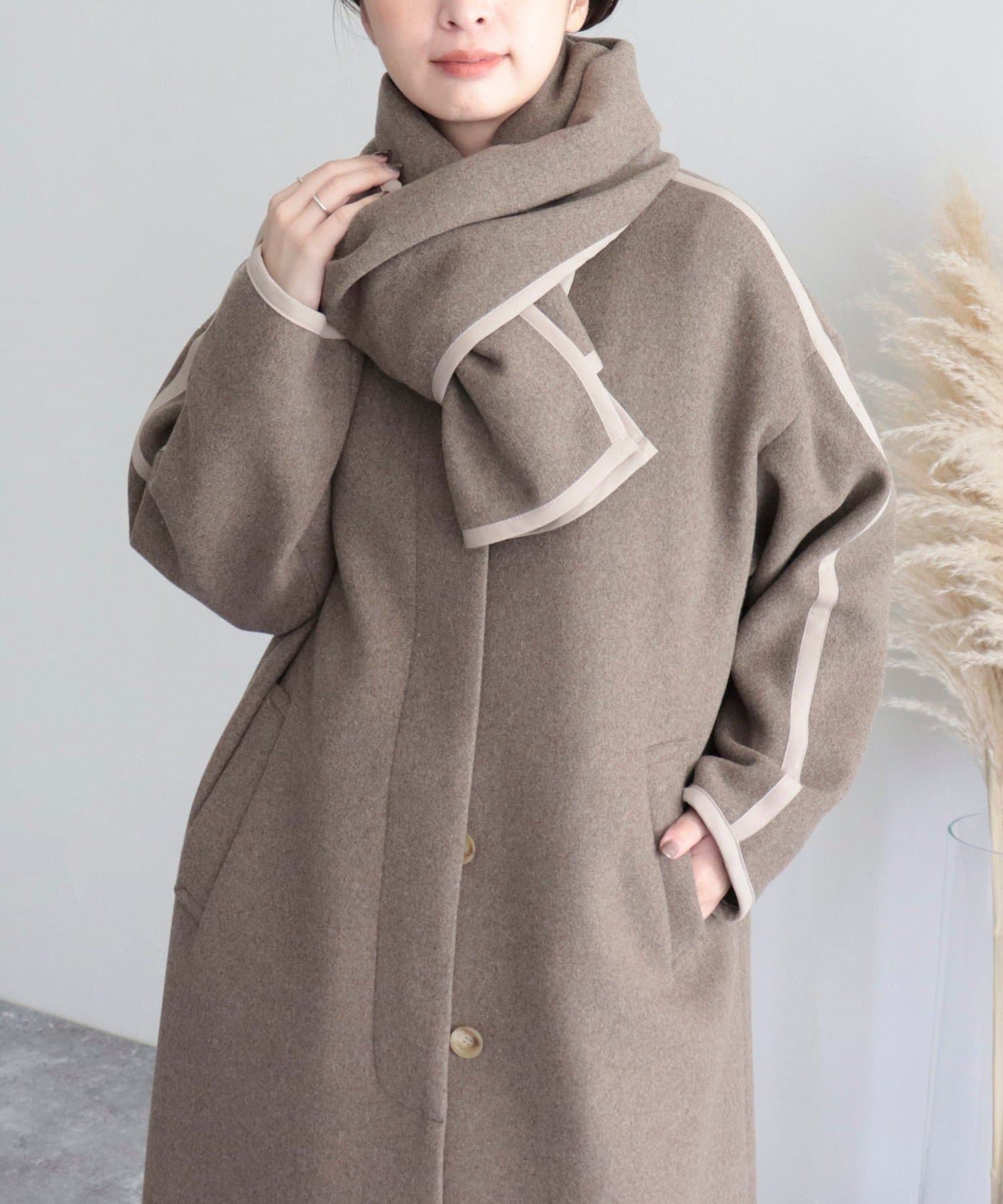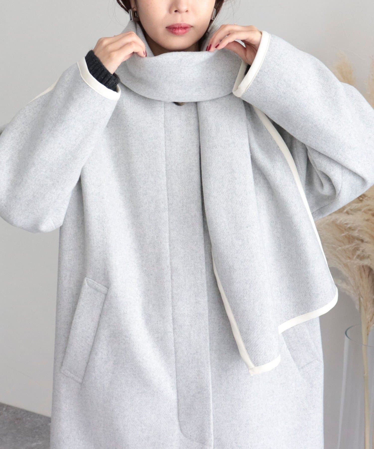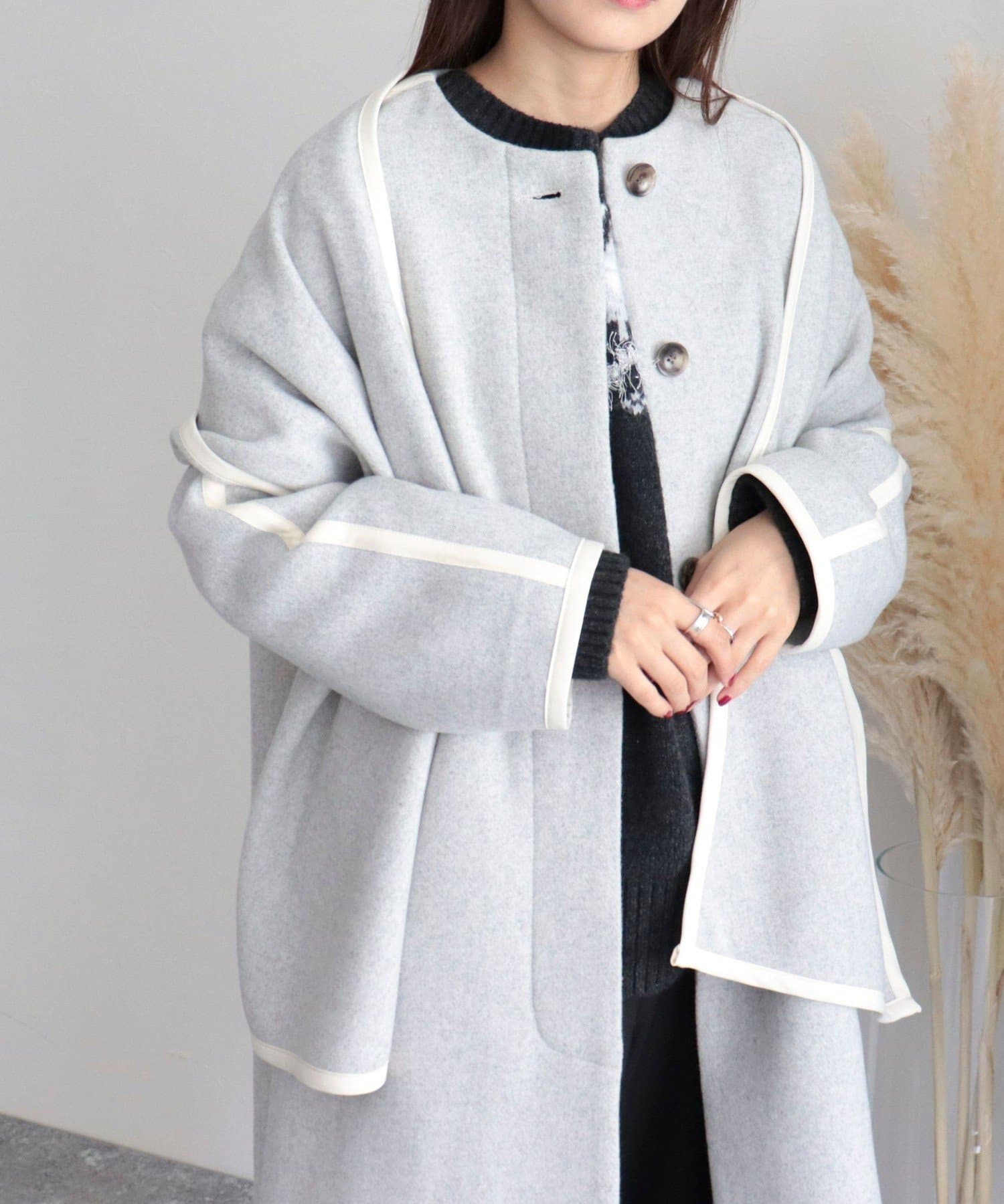 配色パイピングが今年らしい ストールとノーカラーコートのセットアイテム