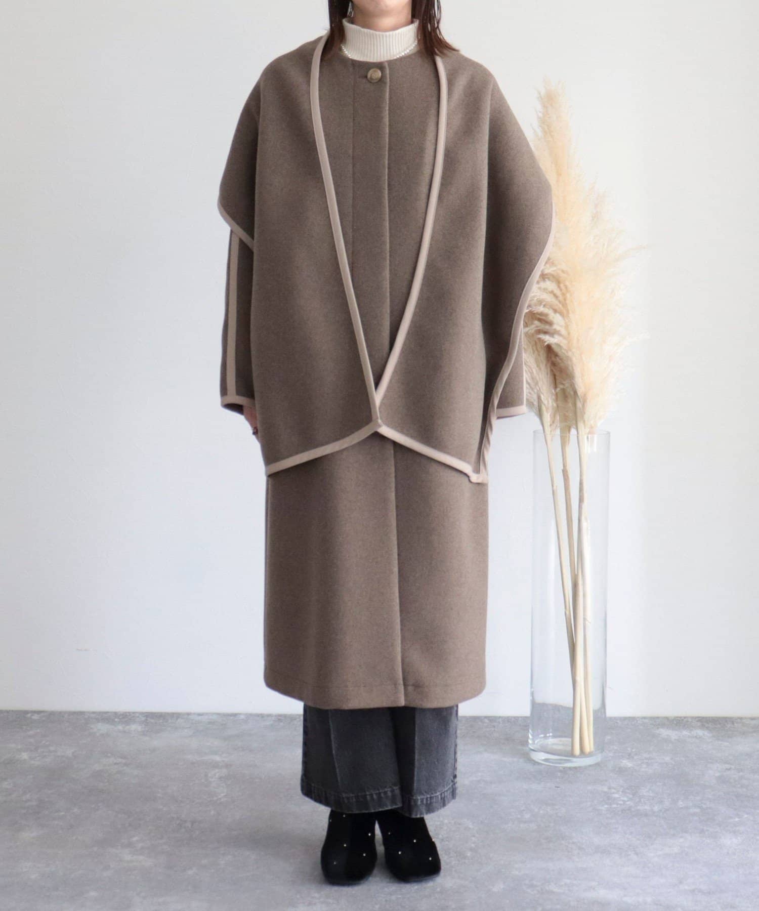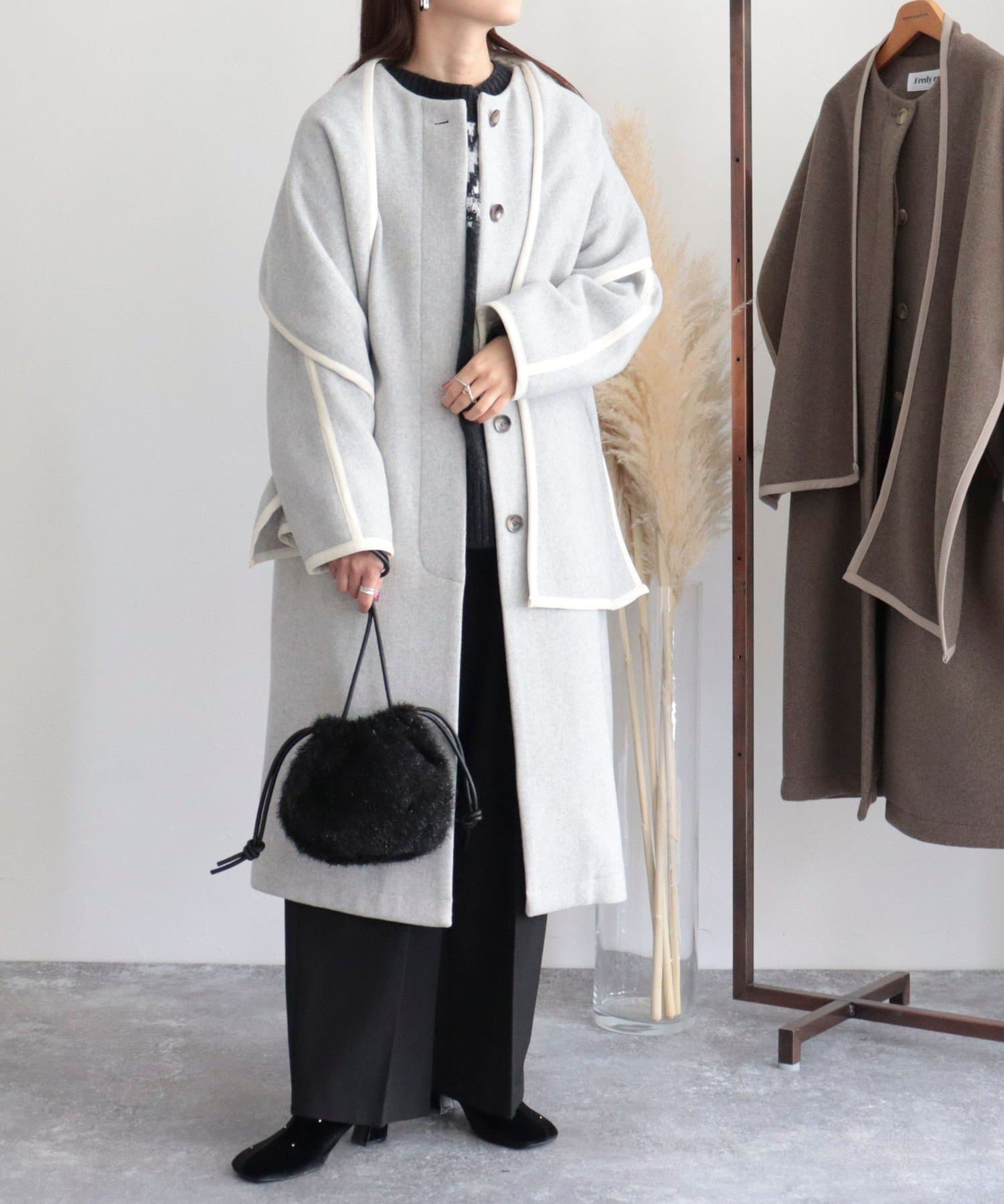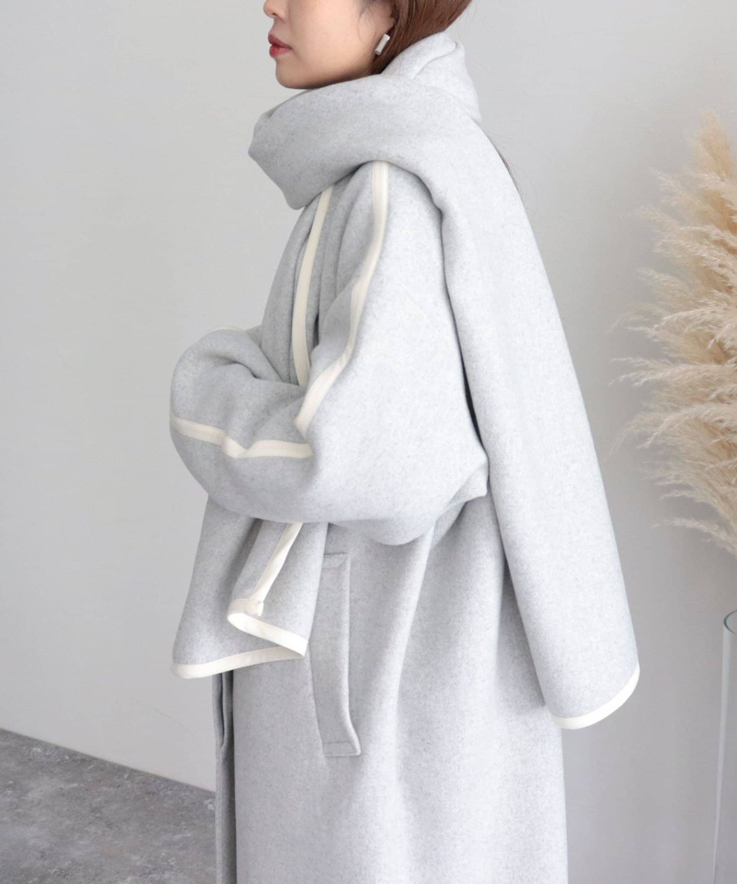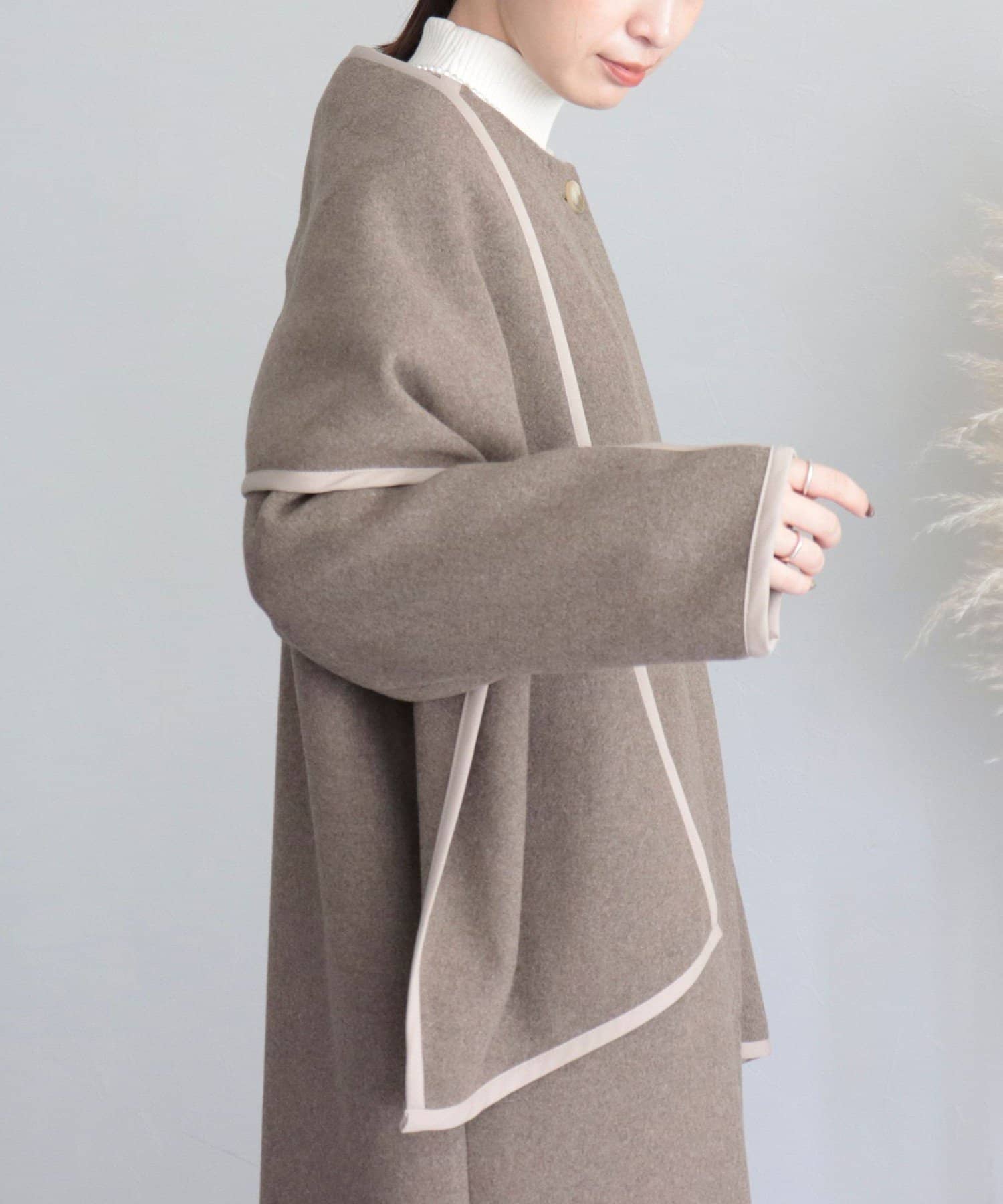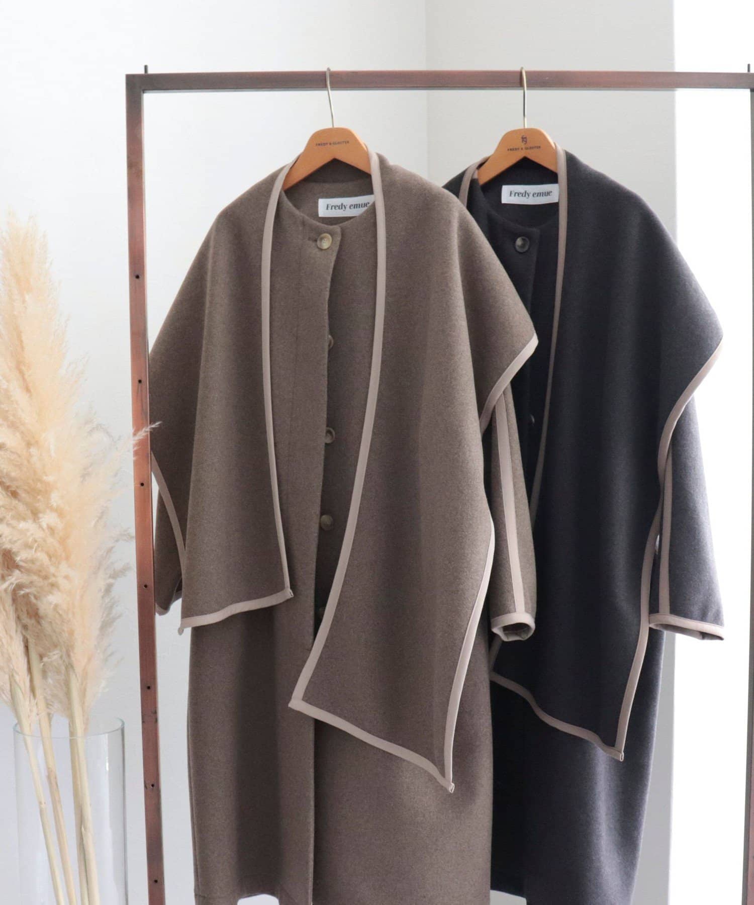 配色パイピングが今年らしい ストールとノーカラーコートのセットアイテム